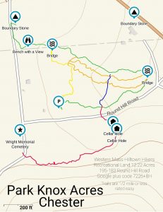 Newest trail in the hilltowns is open, still working on some sections, fine tuning but it is hikable!!!!! Easy trails at the base of Round Top Hill in Chester. 195-183 Round Hill Rd, Chester, MA 01011. Its on Google Maps ,â€Western Mass Hilltown Hikers is dedicated to Preserving the Natural Beauty of the Hilltowns of Western Massachusetts. I am pleased to introduce Park Knox Acres Recreational Land 12.2 acres put in Chapter 61B for public hiking use. Located on Round Top Hill in Chester, this land is abundant with wildlife; moose, bear, turkey, bobcat any many varieties of birds, gentle flowing brooks, stone formations, cellar holes, wildflowers, shag bark and hemlock trees. Land that was forested 20 years ago has come back to life and is thriving. Three trails run through the property, maps and information are located at the parking area trailhead. A 1700’s village was once also located here complete with the Wright Memorial Cemetery. Enjoy your visit