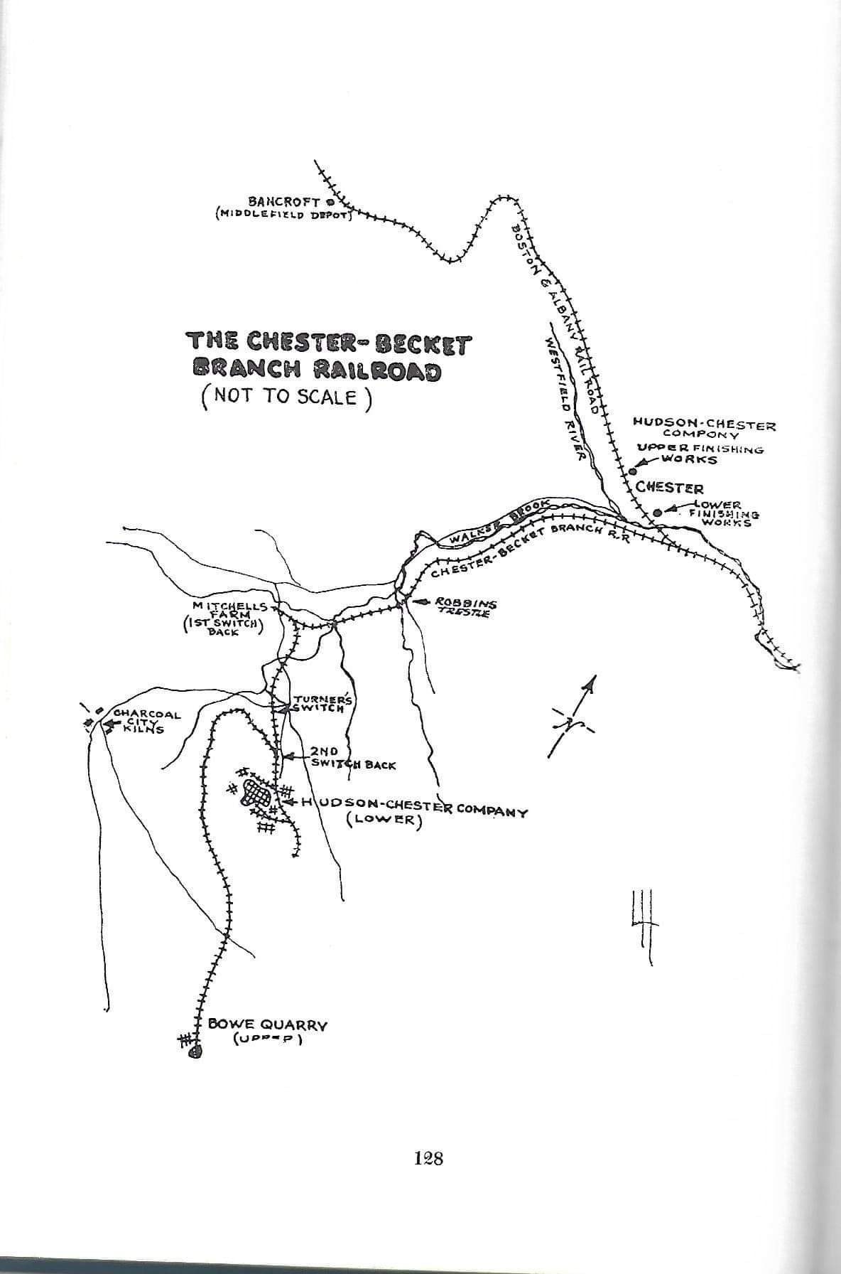 Near the present day large lower quarry which was named the Hudson and Chester granite Company. Another couple of miles farther over the rough upland plateau, and just beyond the Otis town line, lay another quarry, smaller, called by old timers the “Bowe Quarry.” This Bowe Quarry had opened in 1890’s and was much smaller than its lower neighbor. To reach this second operation, more railroad was constructed in 1902 or 1903. This line
