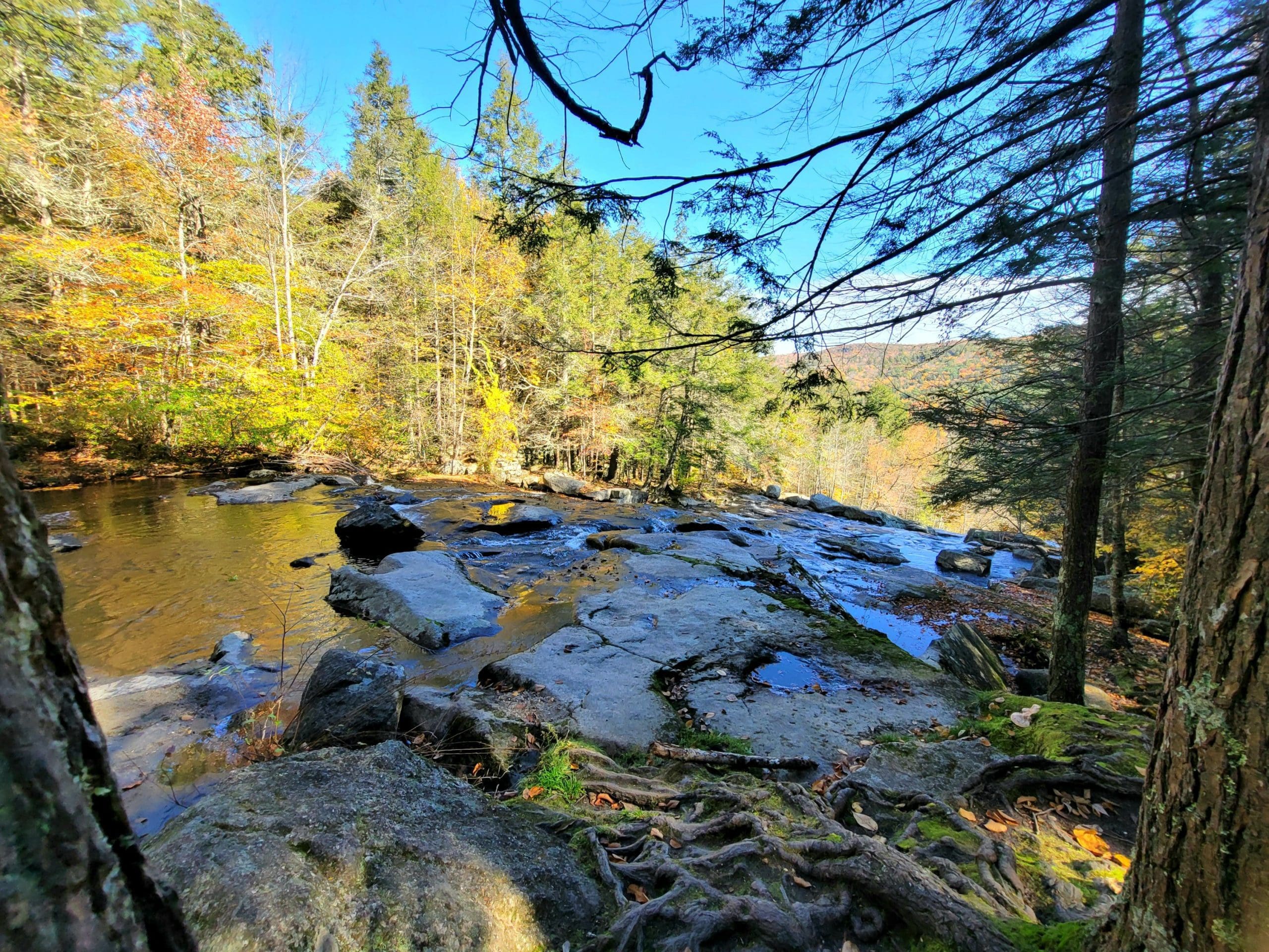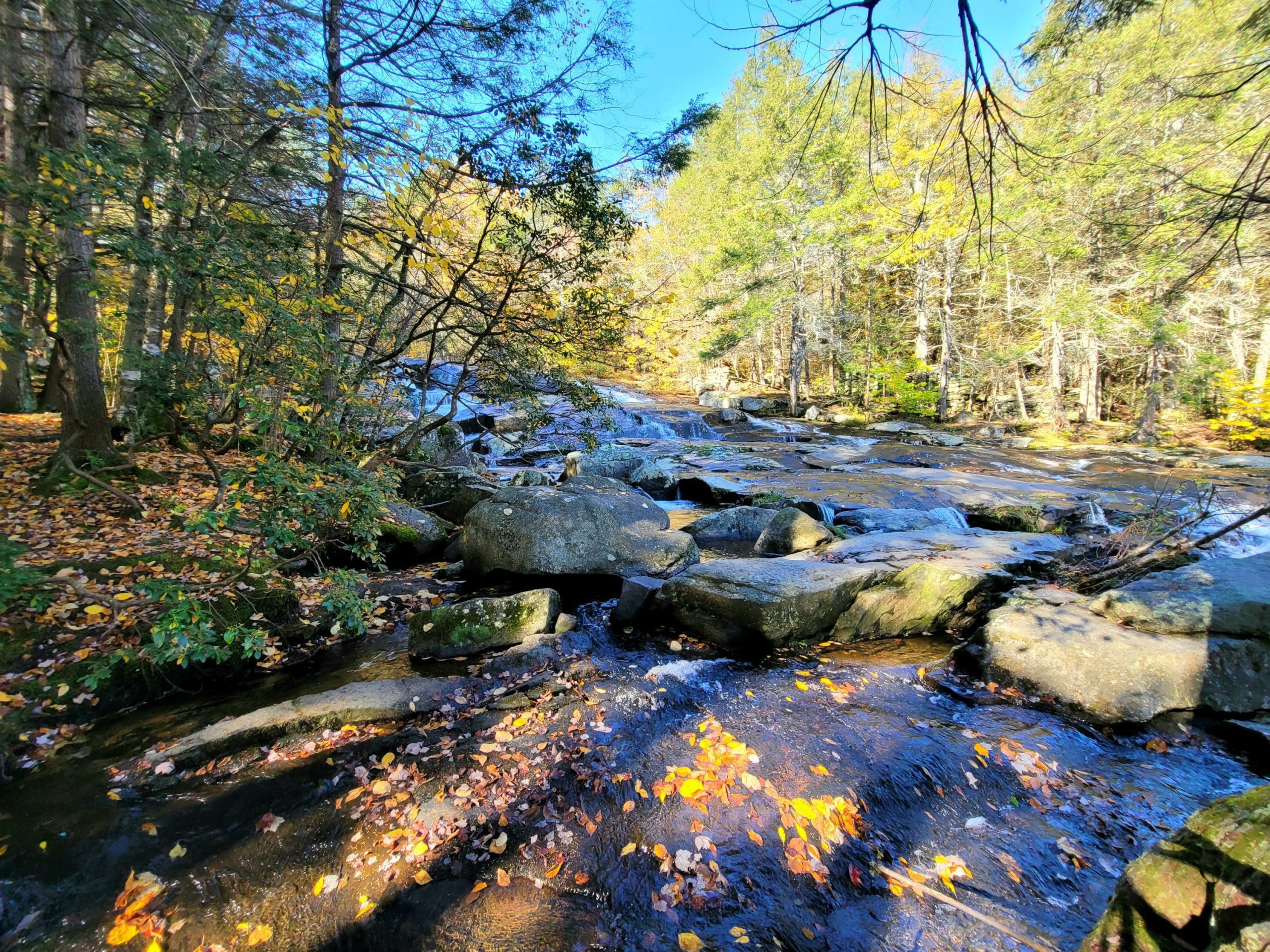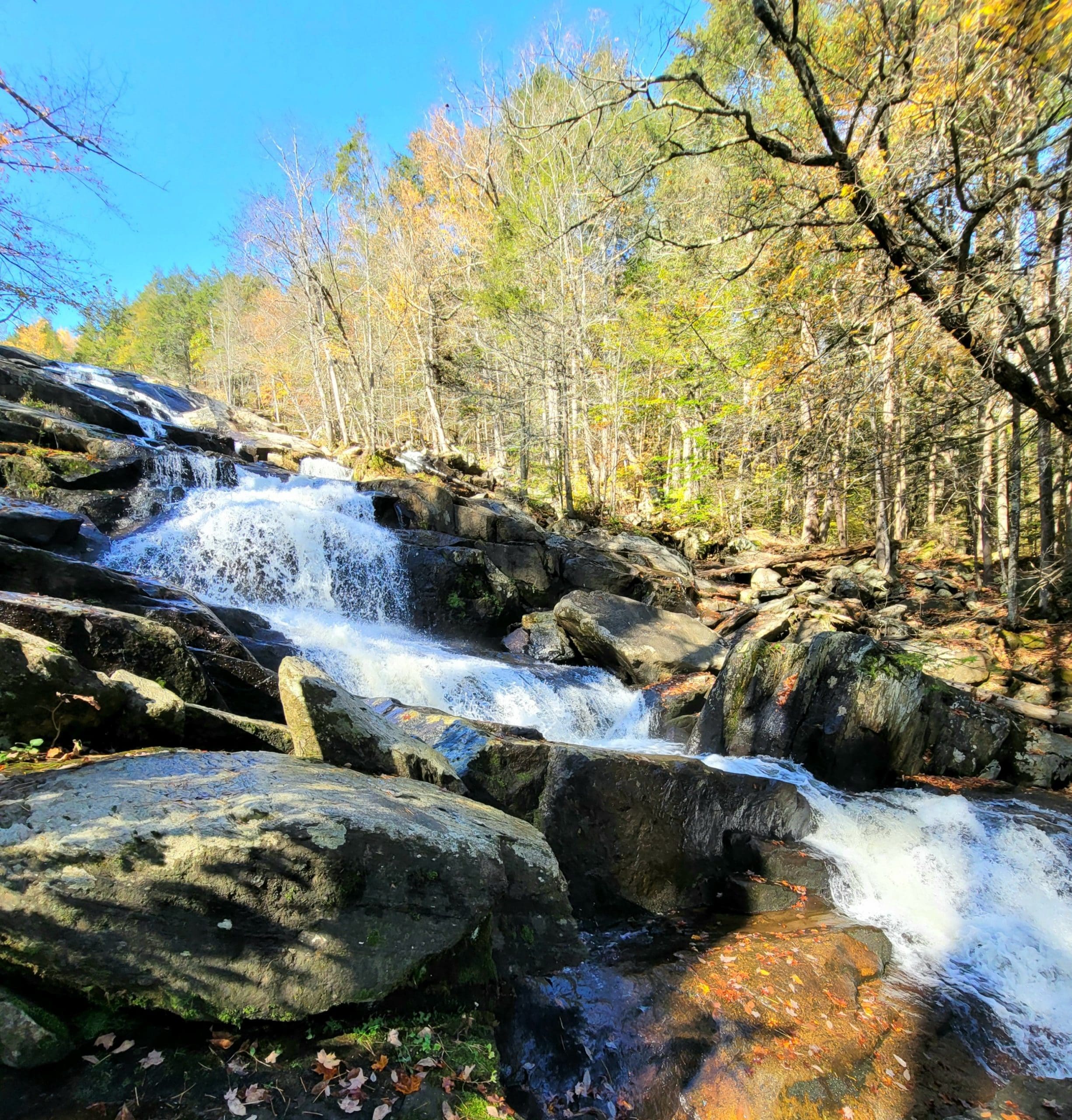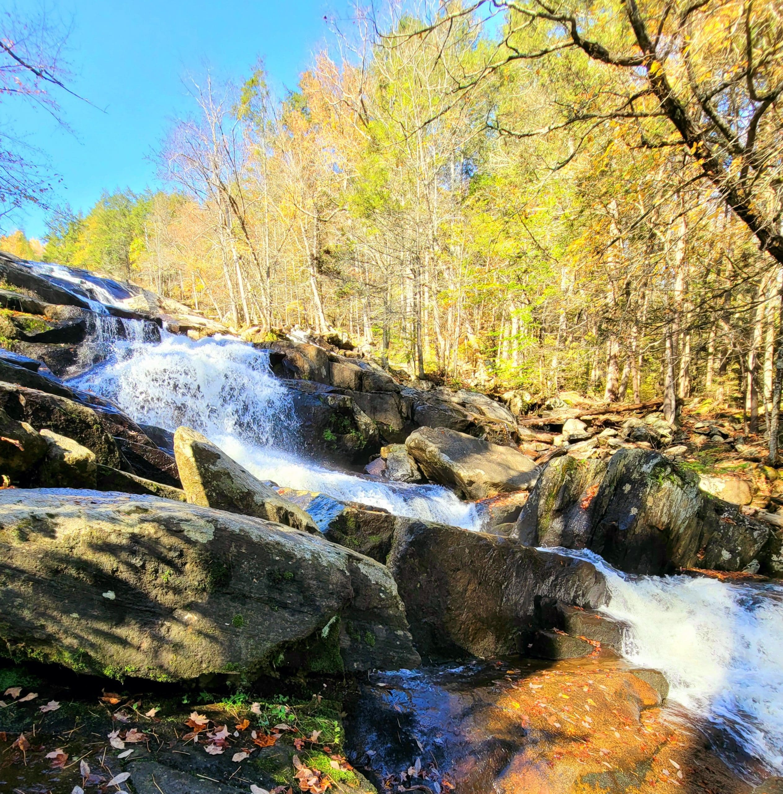 Glendale Falls on Clark Wright Road in Middlefield, just one of three large easy accessible waterfalls in the Chester area, along with Sanderson and Goldmine. Great parking and a short but exciting trail complete with stone steps takes you along the entire falls to the bottom with glorious views the entire way. There is also a trail from the parking lot on the other side of the bridge taking you down the other side of the falls to a sawmill. The Trustees also have property across the road where there is also a short trail and Wright Brook feeds the waterfall.