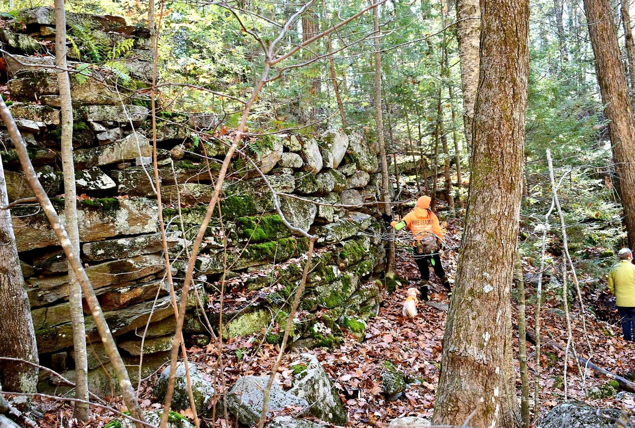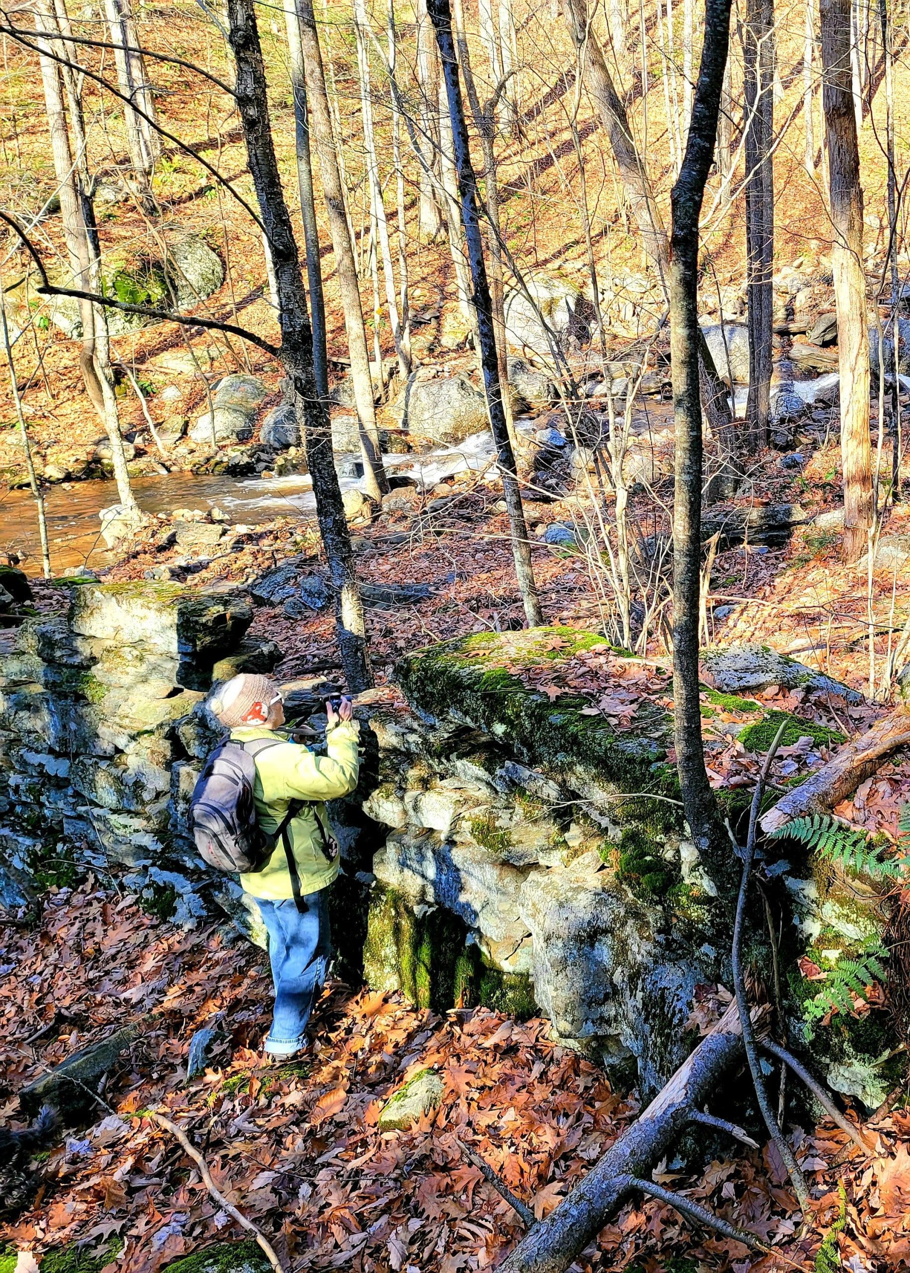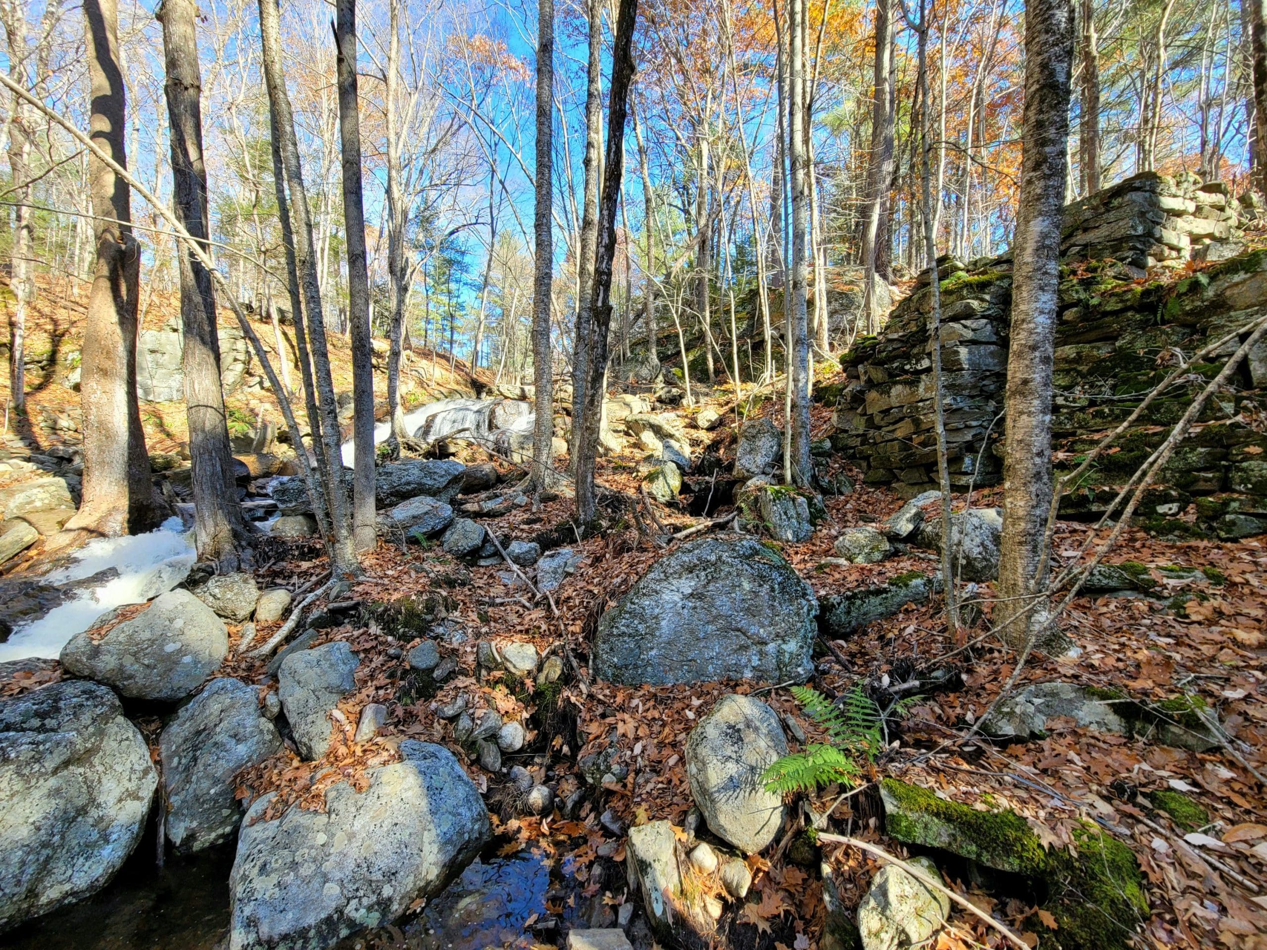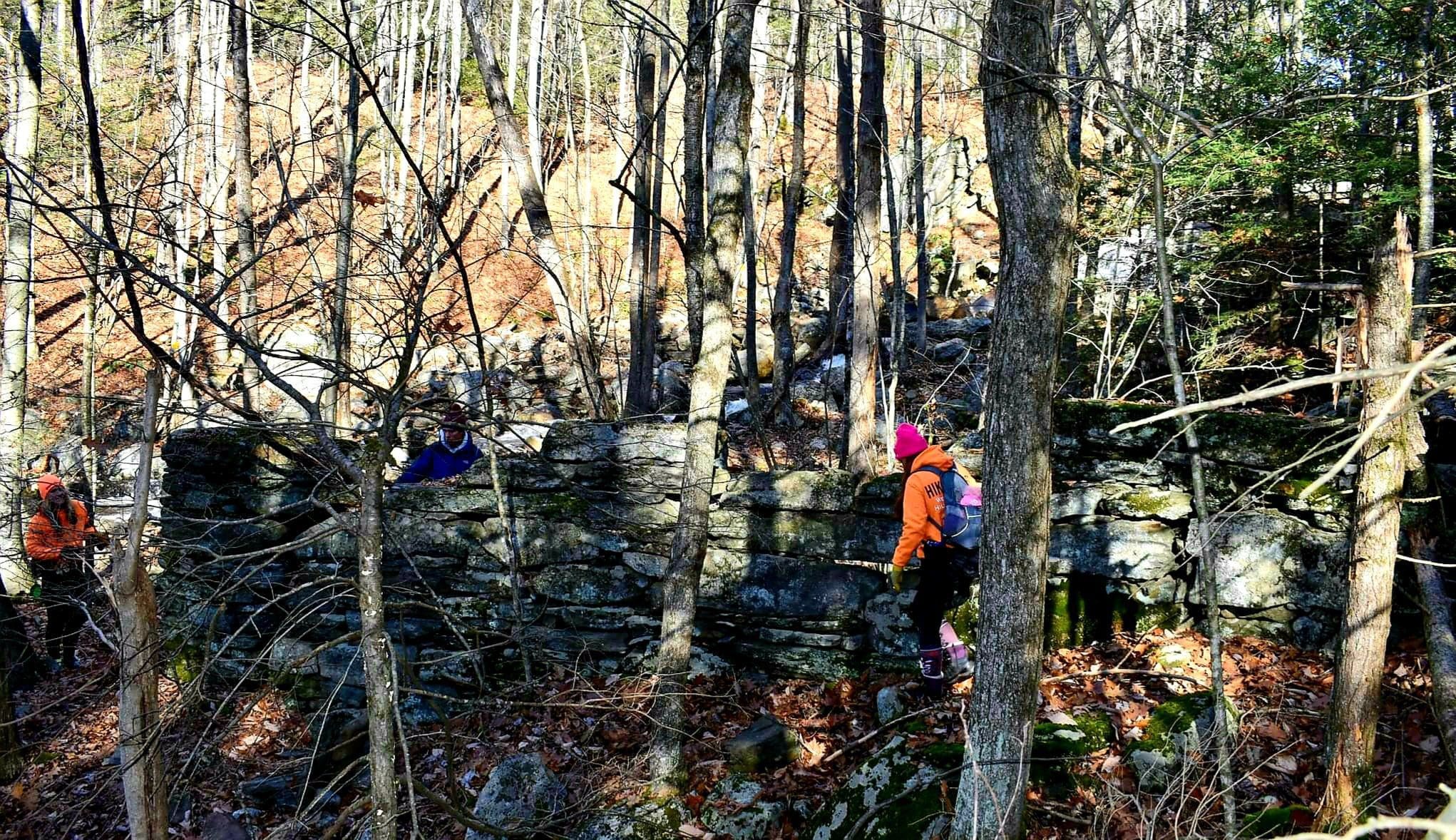 Montgomery hiking at Moose Meadow Brook and it’s glorious waterfall. Walking in from Westfield on Reservoir Road the trail is actually the water works road to the now drained lower Westfield Tekoa Reservoir. Along the way are giant old growth trees and the Westfield Montgomery Boundary Post. Come to the bridge on the top of the falls and walk down the short footpath to take a closer look at the saw mill remains, also believed to be Falleys Armory. This area is known as The Grace Robson Sanctuary. Make it a longer hike by parking at the end of Pitcher Street in Montgomery, there’s another boundary post there as well! Remember to always wear as much neon orange, pink, green or yellow as possible from now until summer and your dogs too!