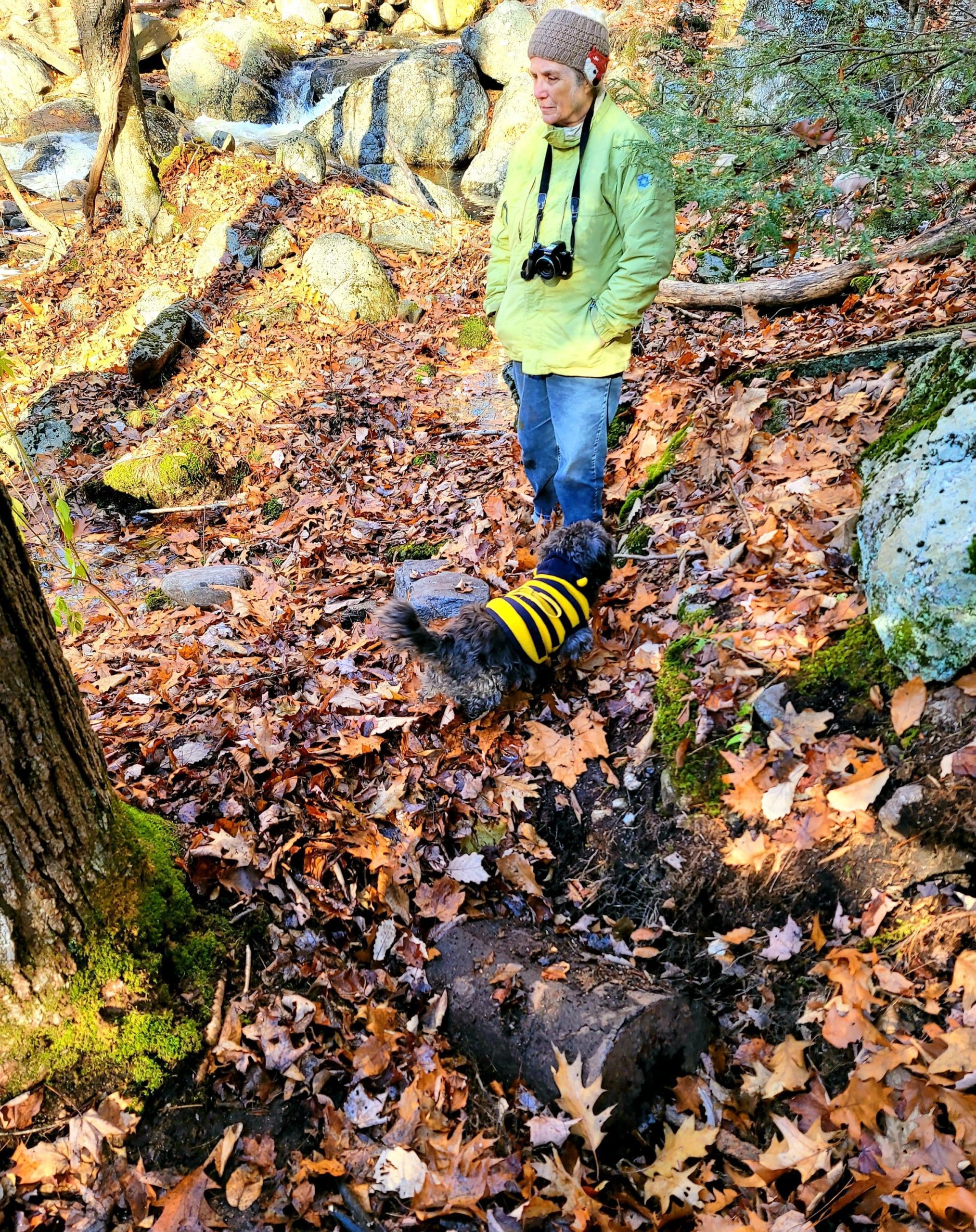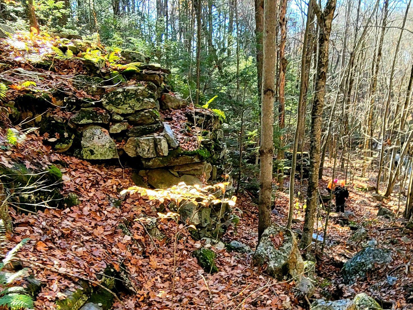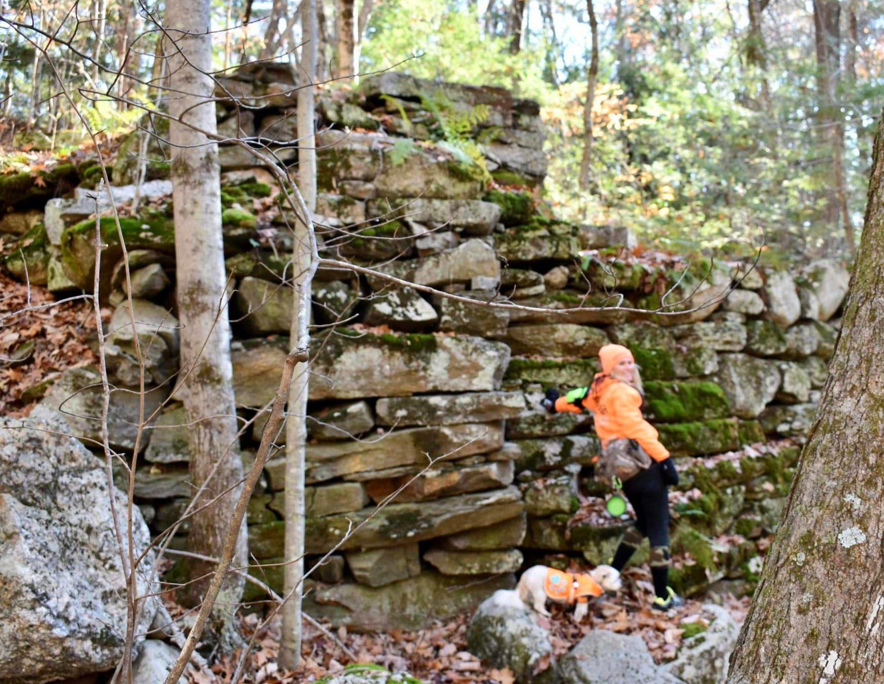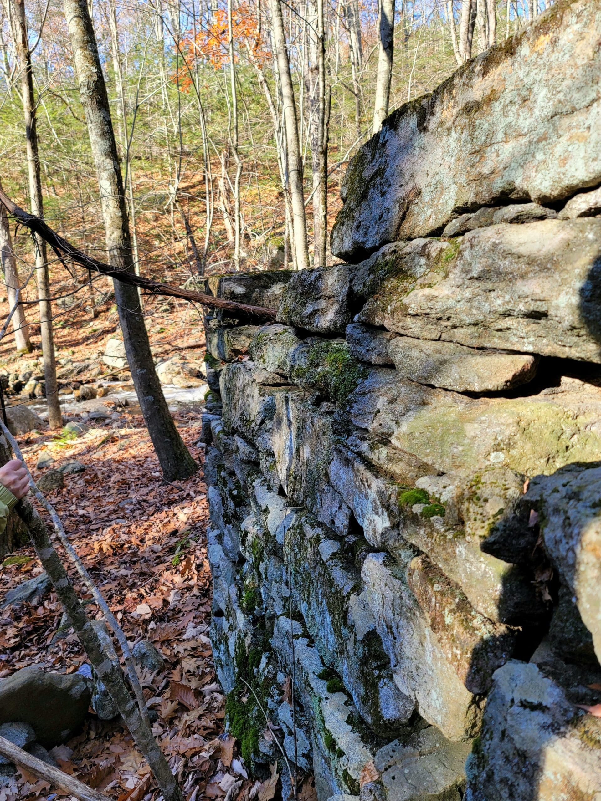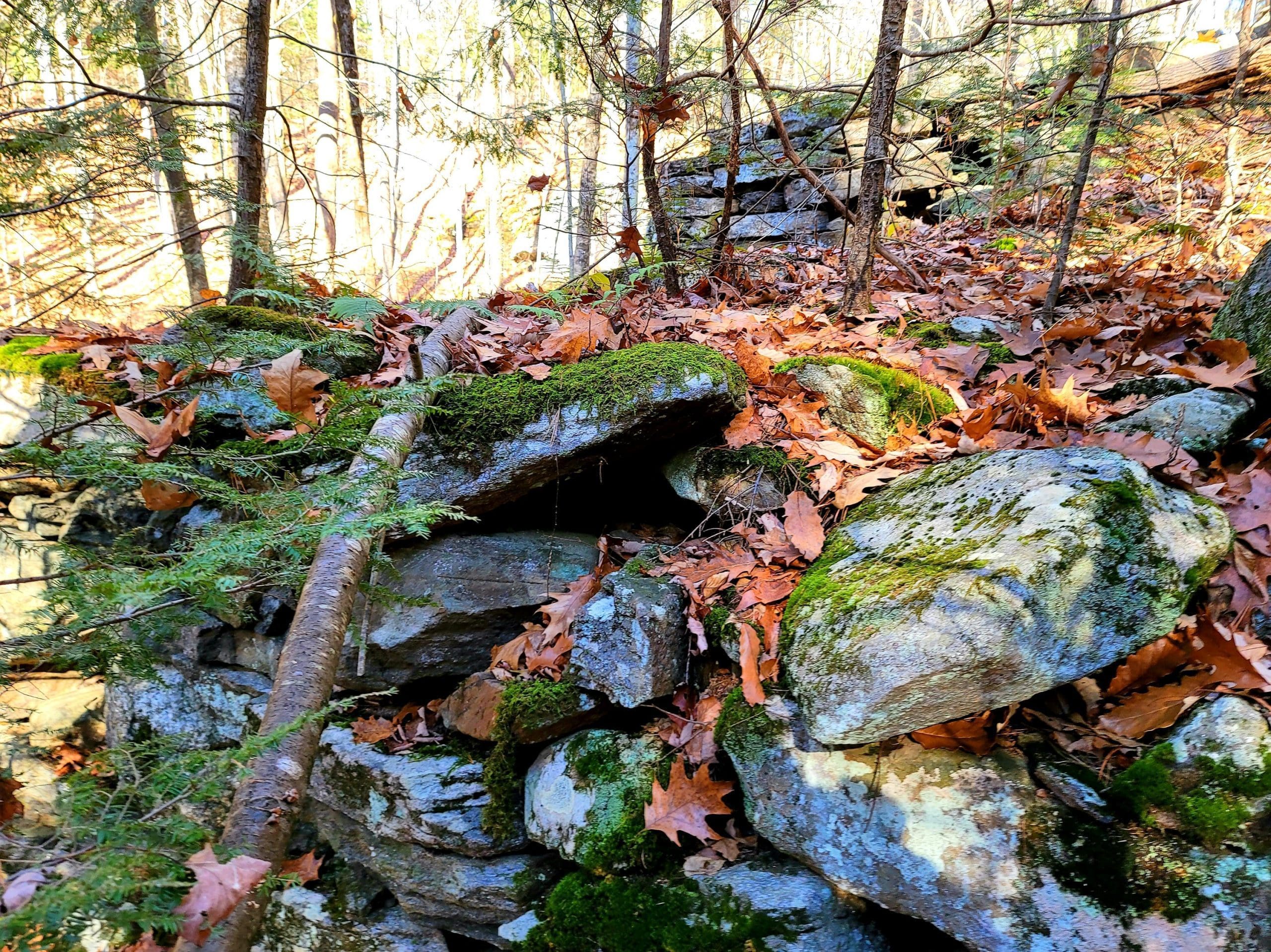 Montgomery hiking at Moose Meadow Brook and it’s glorious waterfall. Walking in from Westfield on Reservoir Road the trail is actually the water works road to the now drained lower Westfield Tekoa Reservoir. Along the way are giant old growth trees and the Westfield Montgomery Boundary Post. Come to the bridge on the top of the falls and walk down the short footpath to take a closer look at the saw mill remains, also believed to be Falleys Armory. This area is known as The Grace Robson Sanctuary. Make it a longer hike by parking at the end of Pitcher Street in Montgomery, there’s another boundary post there as well! Remember to always wear as much neon orange, pink, green or yellow as possible from now until summer and your dogs too!