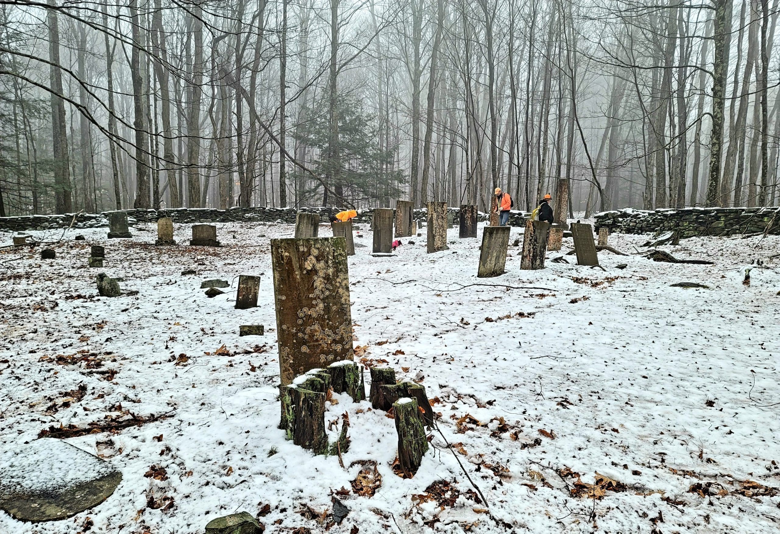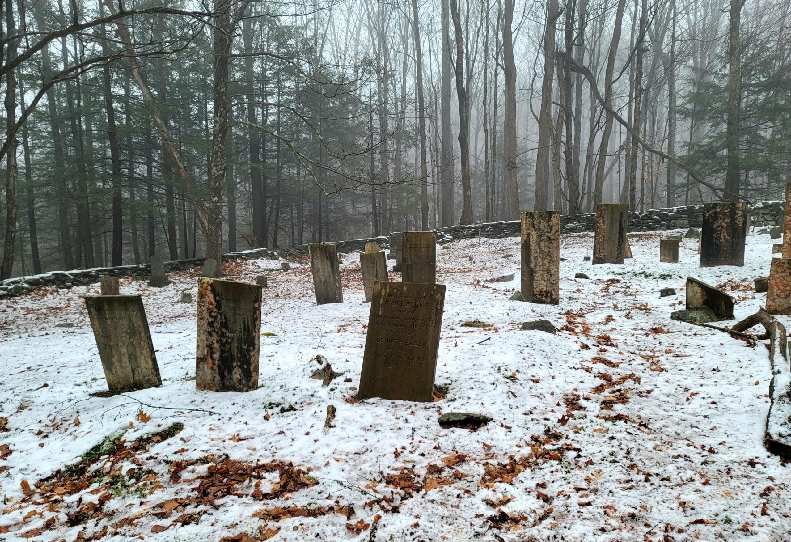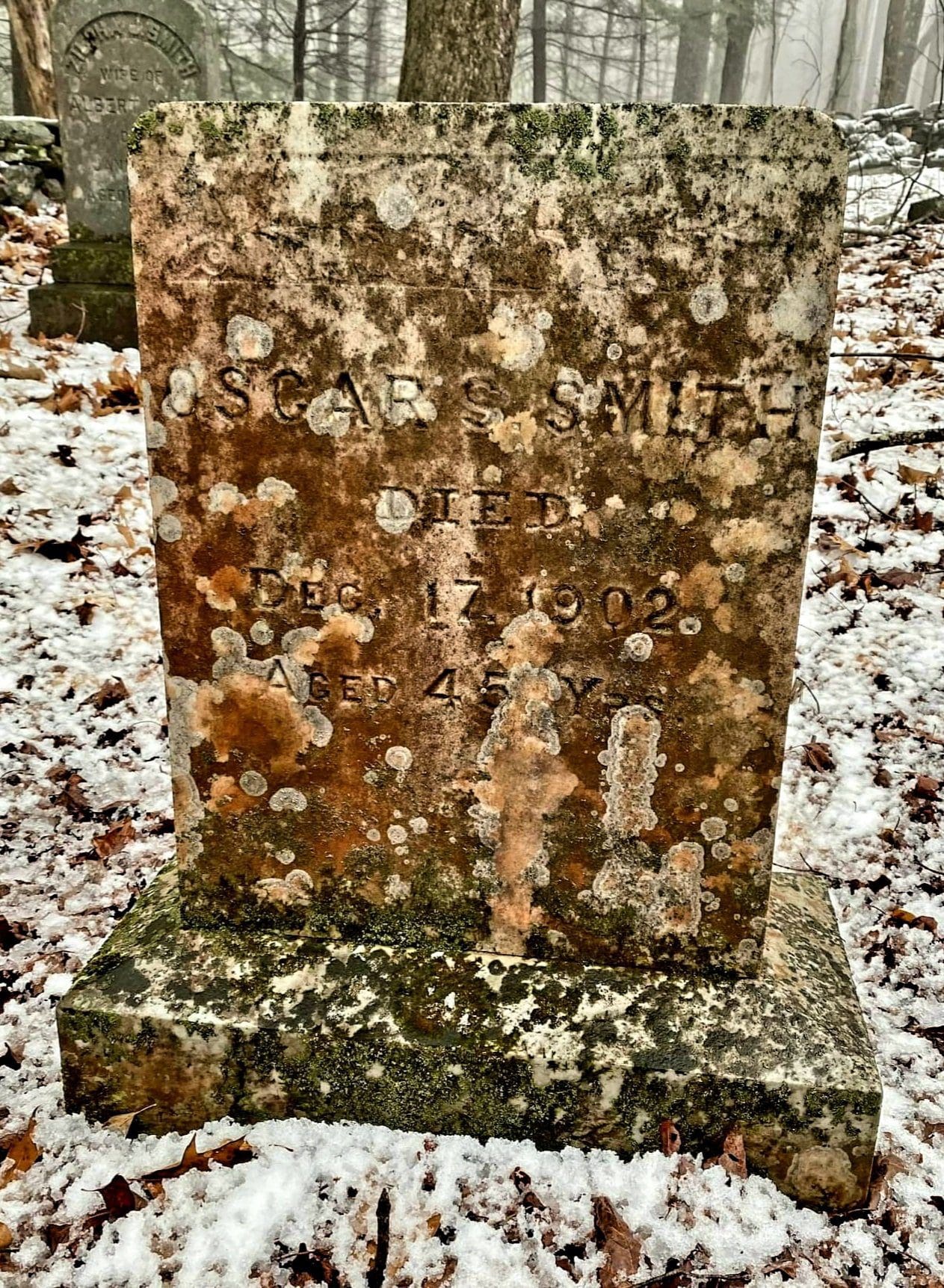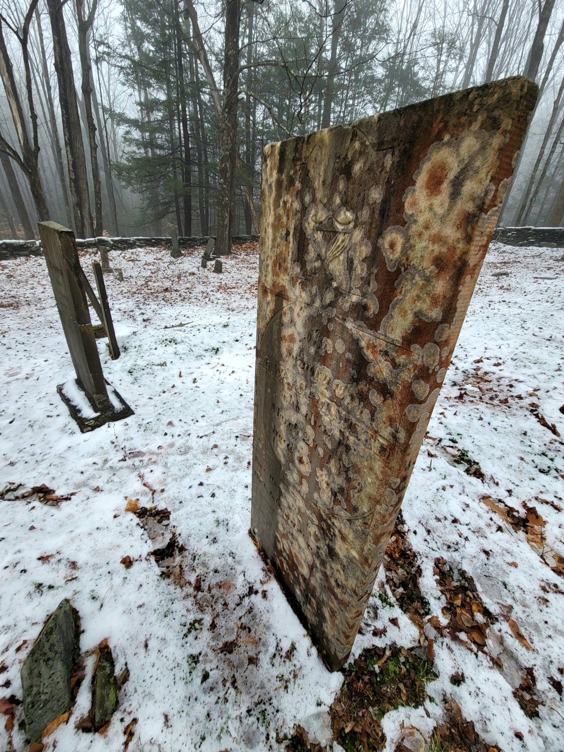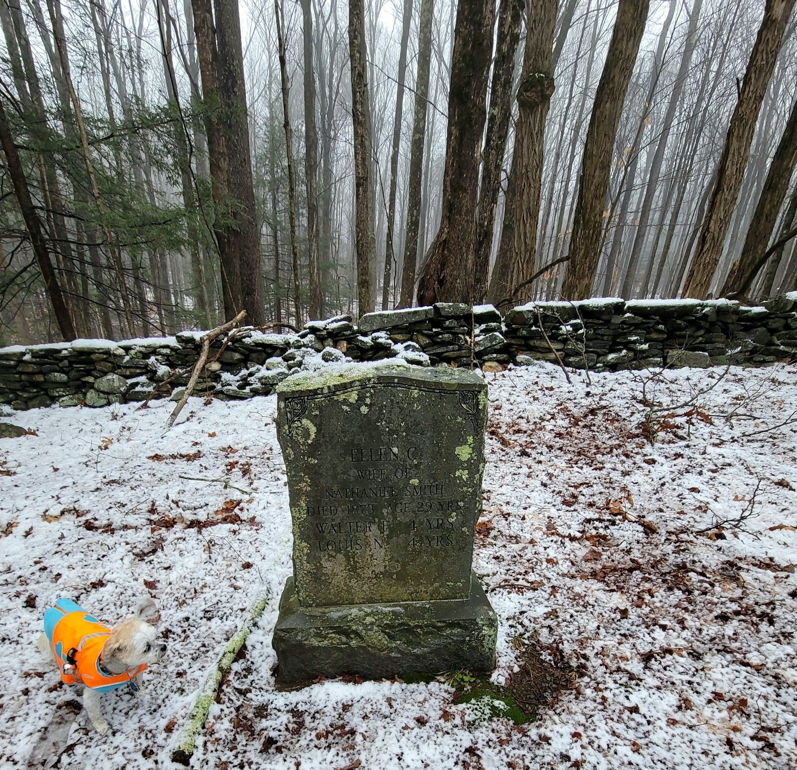 North Chester Cemetery found, located about a football field away from the intersection of Smith and Captain Bemis Road high up on Smith Hill. The earliest ancestors of Chester can be found here as North Chester Historic Distric was the earliest of settlements. Field stones are also present here, those graves are all upheaved from the ground forming raised mounds where they lay. Fog and rain for today’s hike was a perfect setting for this one. Old Smith Road makes for excellent walking as the road is closed, parking at the bottom is a must.
