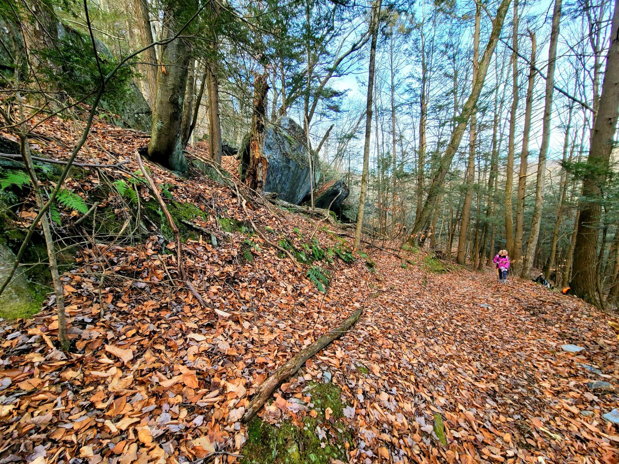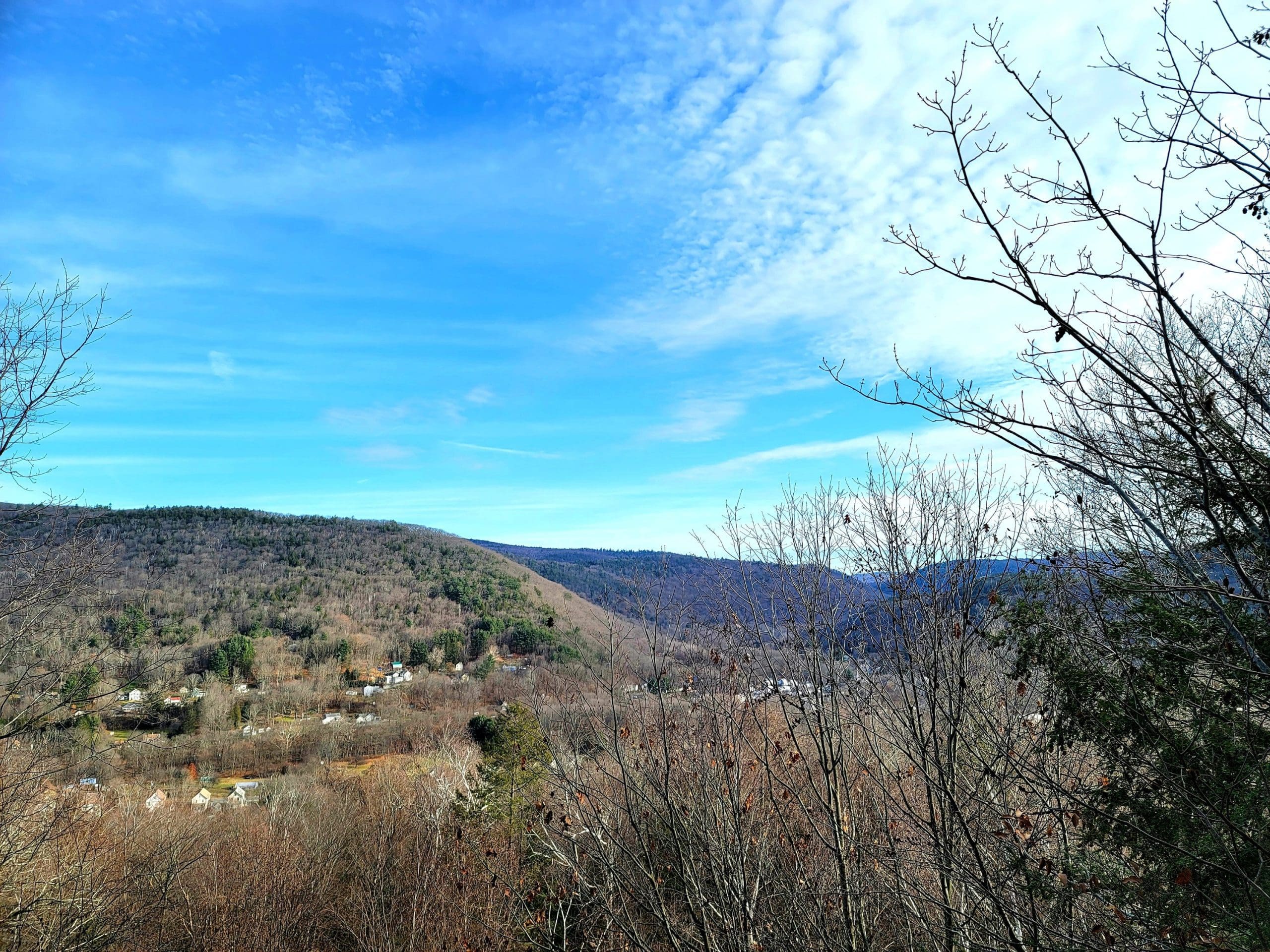 The Big View Trail in Chester, a short but very steep climb up Gobble Mountain to a view of the entire valley looking East upon the Village of Chester Factories. Trail head is at the end of Olin Avenue, access graciously given by the landowner, look for the big wood sign that says trail in orange and keep left then straight then climb!