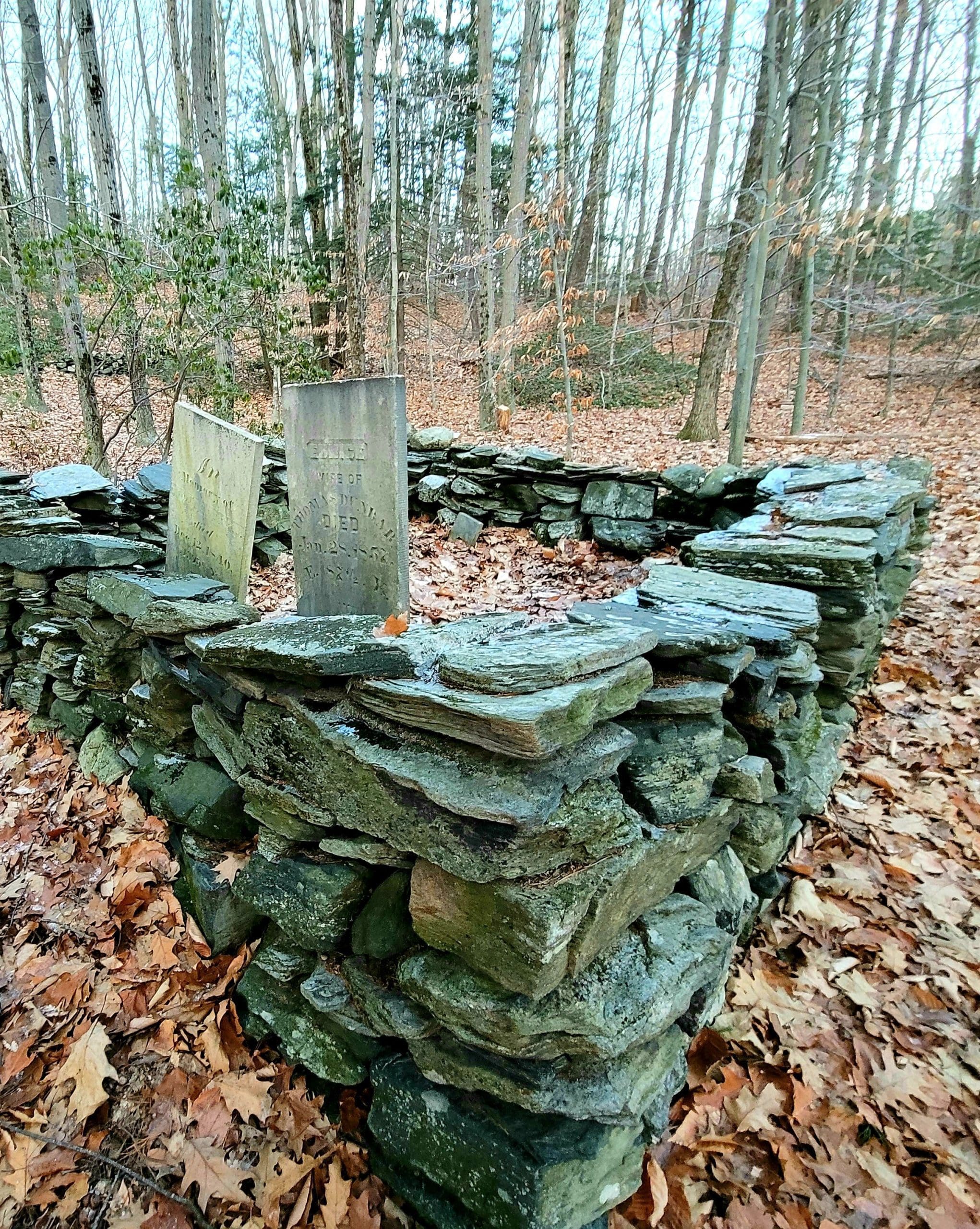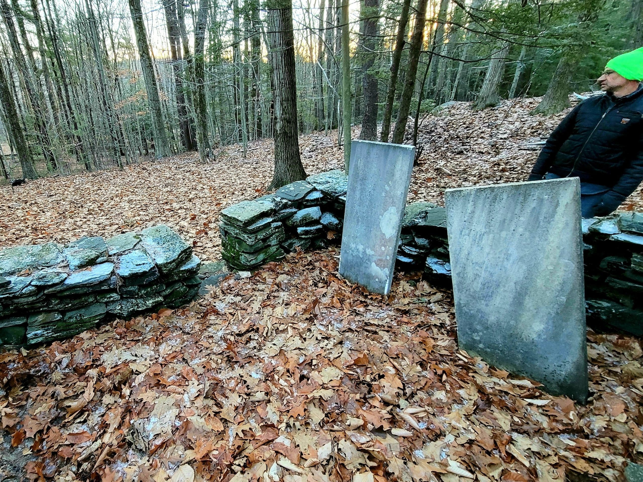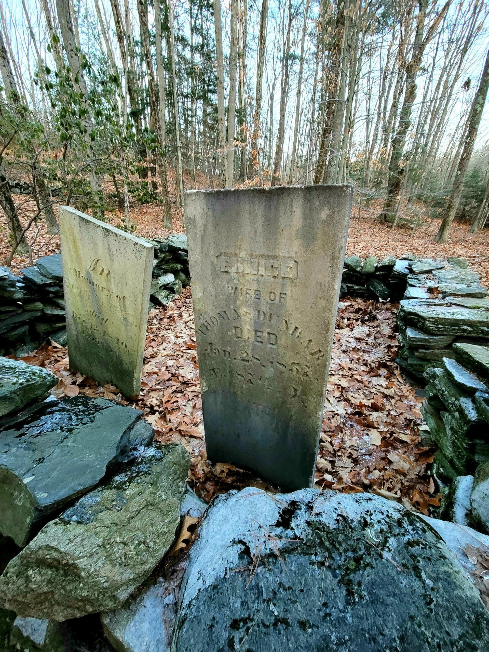 Dunbar Cemetery in Chester on Round Top Hill, just two headstones with foot stones on old Smithies Road about 200 feet into the woods, part of our old road exploration.