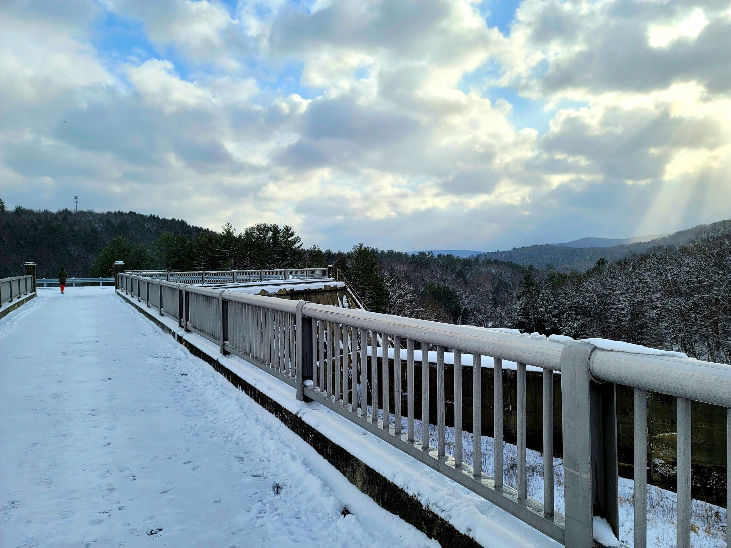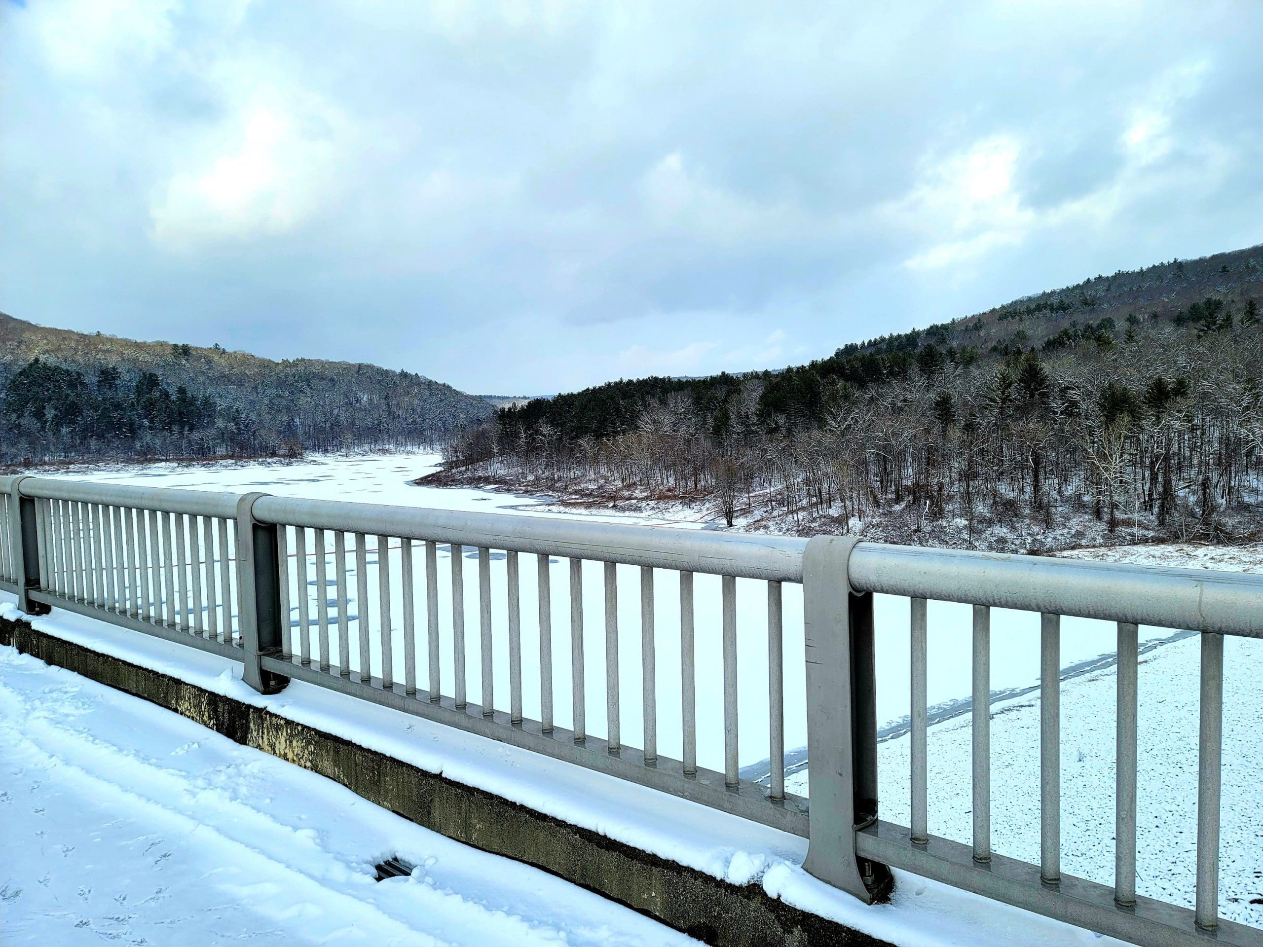 From the top of Knightville Dam, the gate to the gate house was open, first time ever with a closer look. Take a walk across the dam for a short walk or go longer on the Claude M. Hill Trail at Knightville in Huntington along the East Branch of the Westfield River. This trail starts behind the ranger station where you park. This is our winter “go to” since the trail is wide and relatively flat with rolling hills following the water. This trail continues about 7 miles to Indian Hollow in Chesterfield. Its great for skiis and snowshoes too. It is always plowed here.