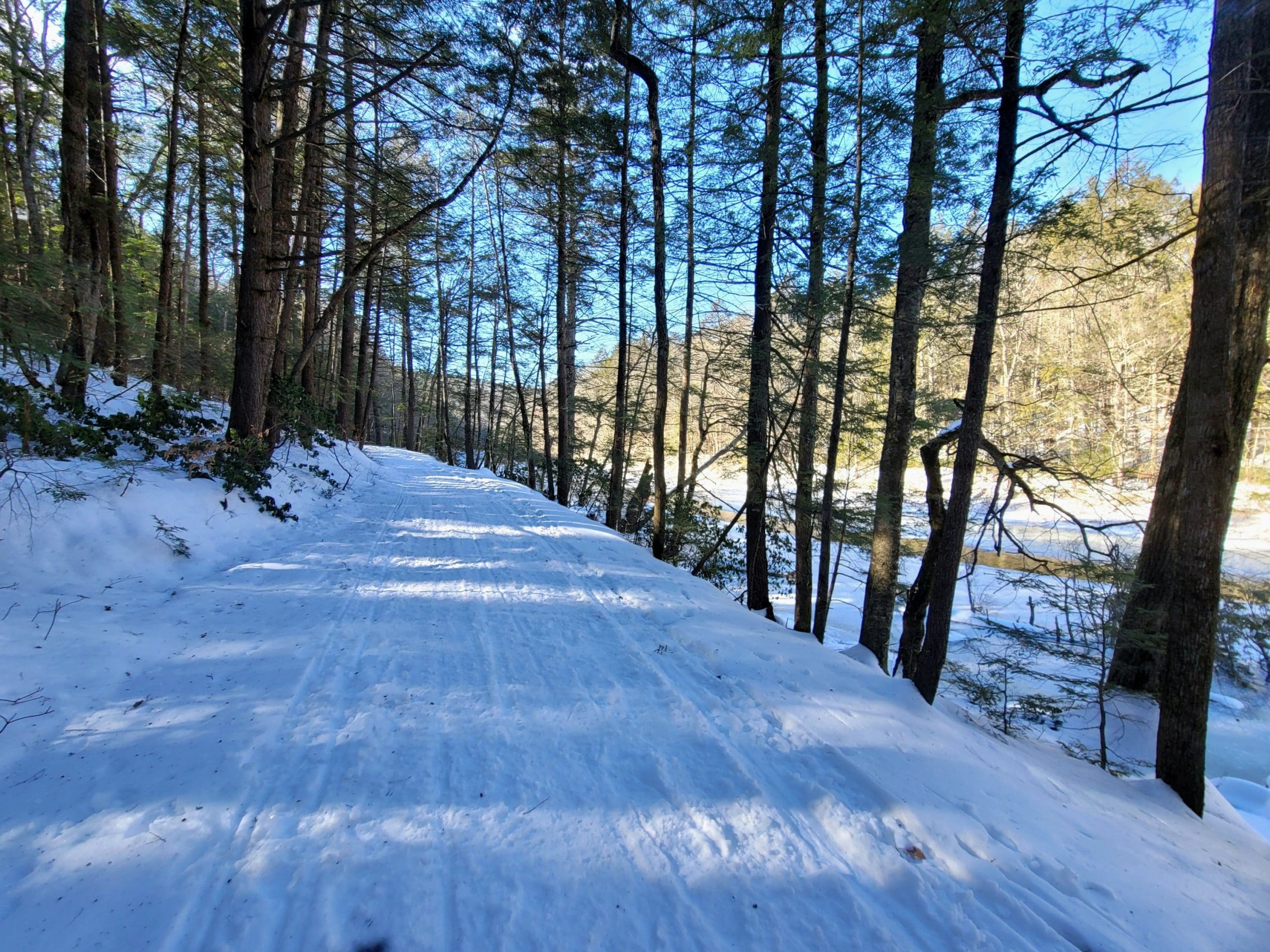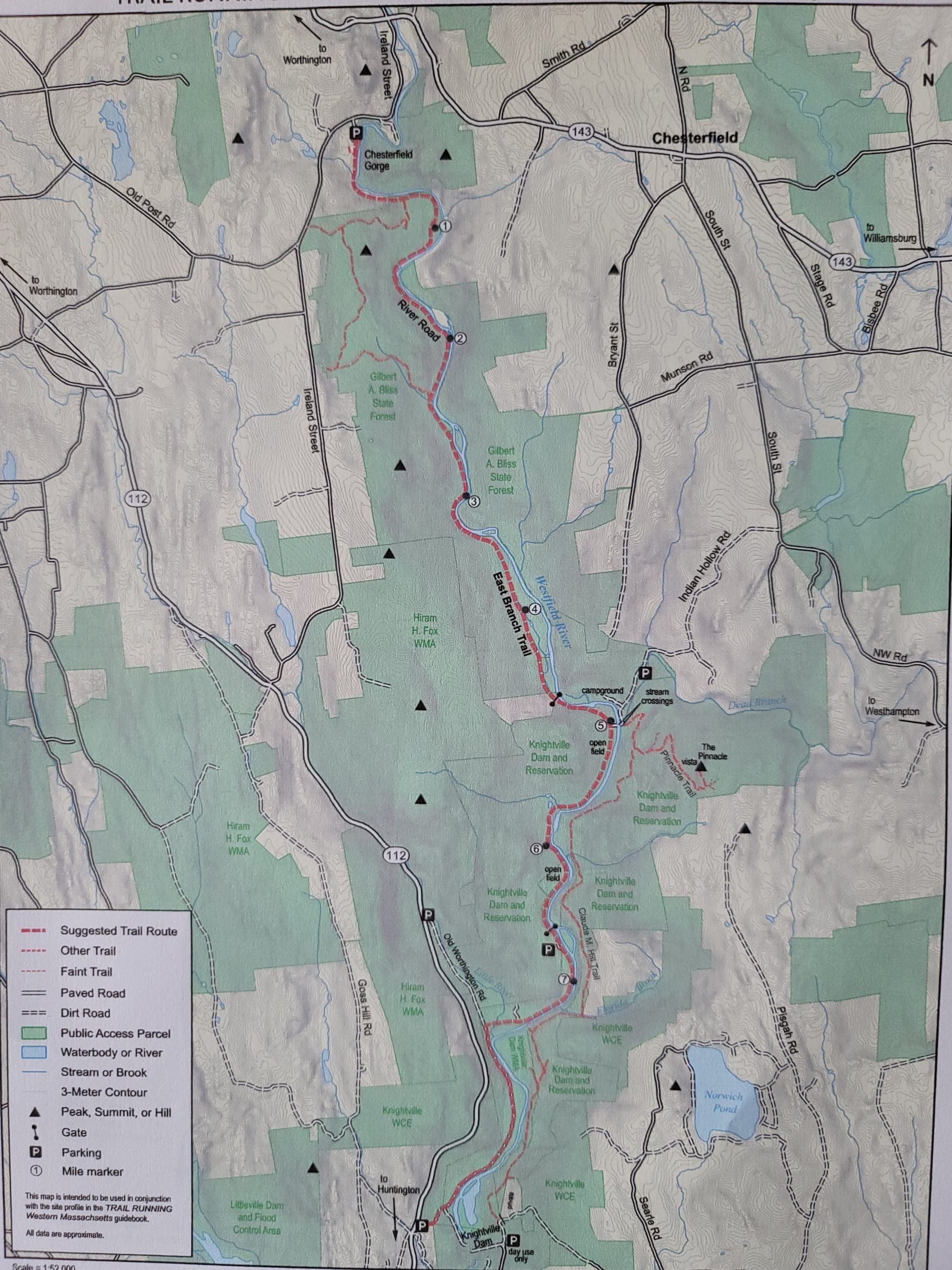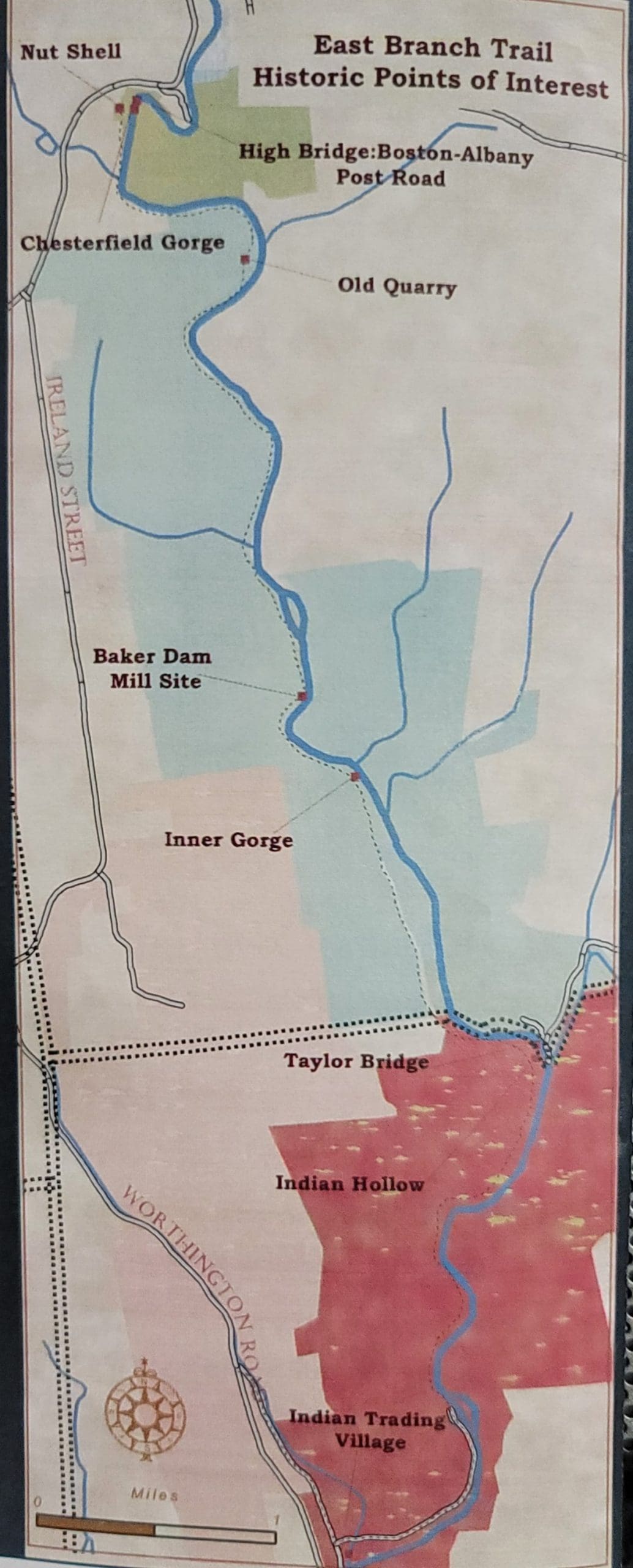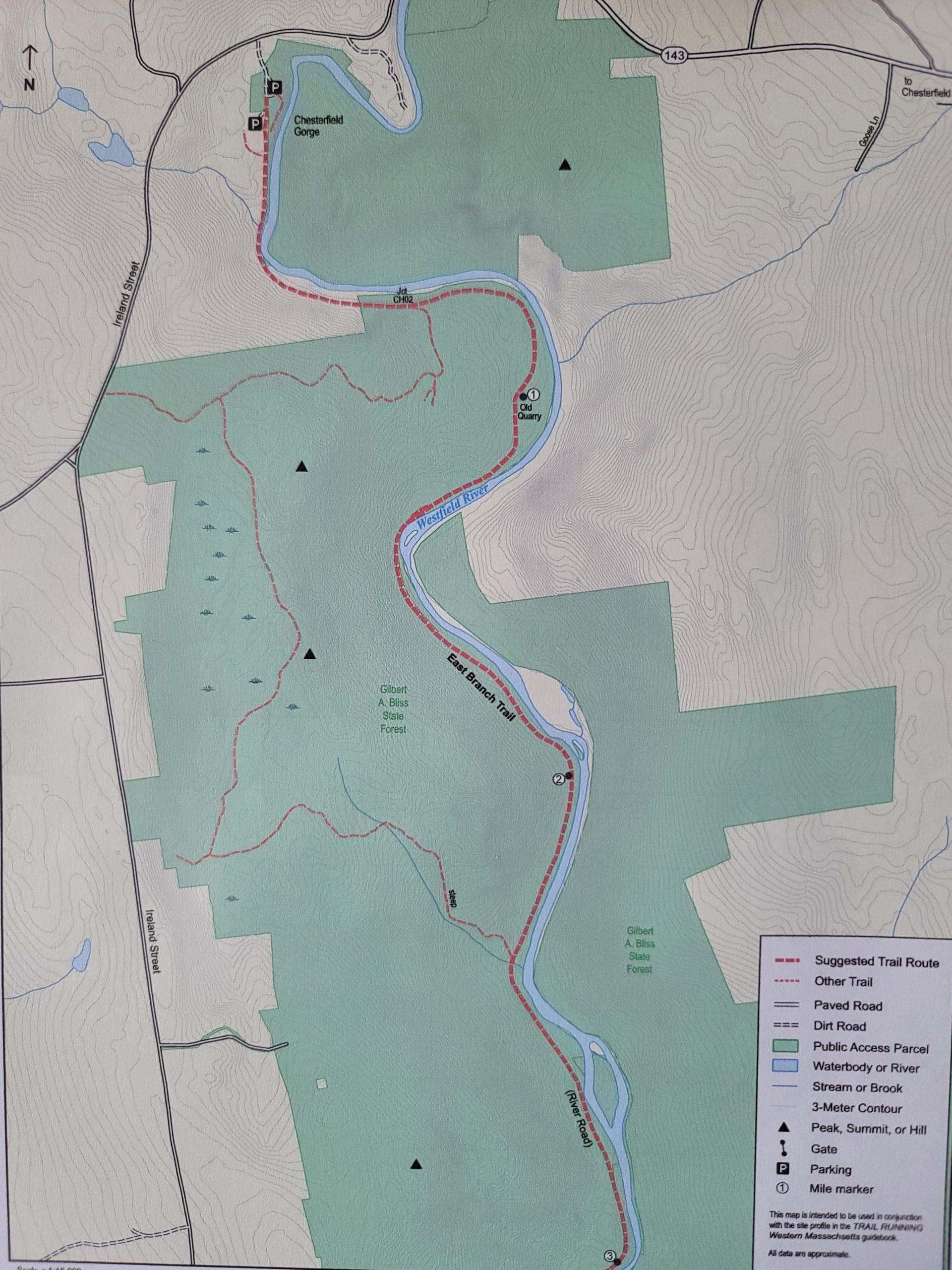 The East Branch Trail runs 6.6 miles from the Chesterfield Gorge trailhead (The Trustees) to the Knightville Dam in Huntington, traveling thru the Gilbert A Bliss State Forest (DCR) along the East Branch of the Westfield River. Wide and relatively flat, the trail winds thru the most scenic and wild scenery including the old quarry site for the old bridge, and further along at the 3 mile marker the Baker Dam Mill Site and 5 miles in the Taylor Bridge and Indian Trading Village.