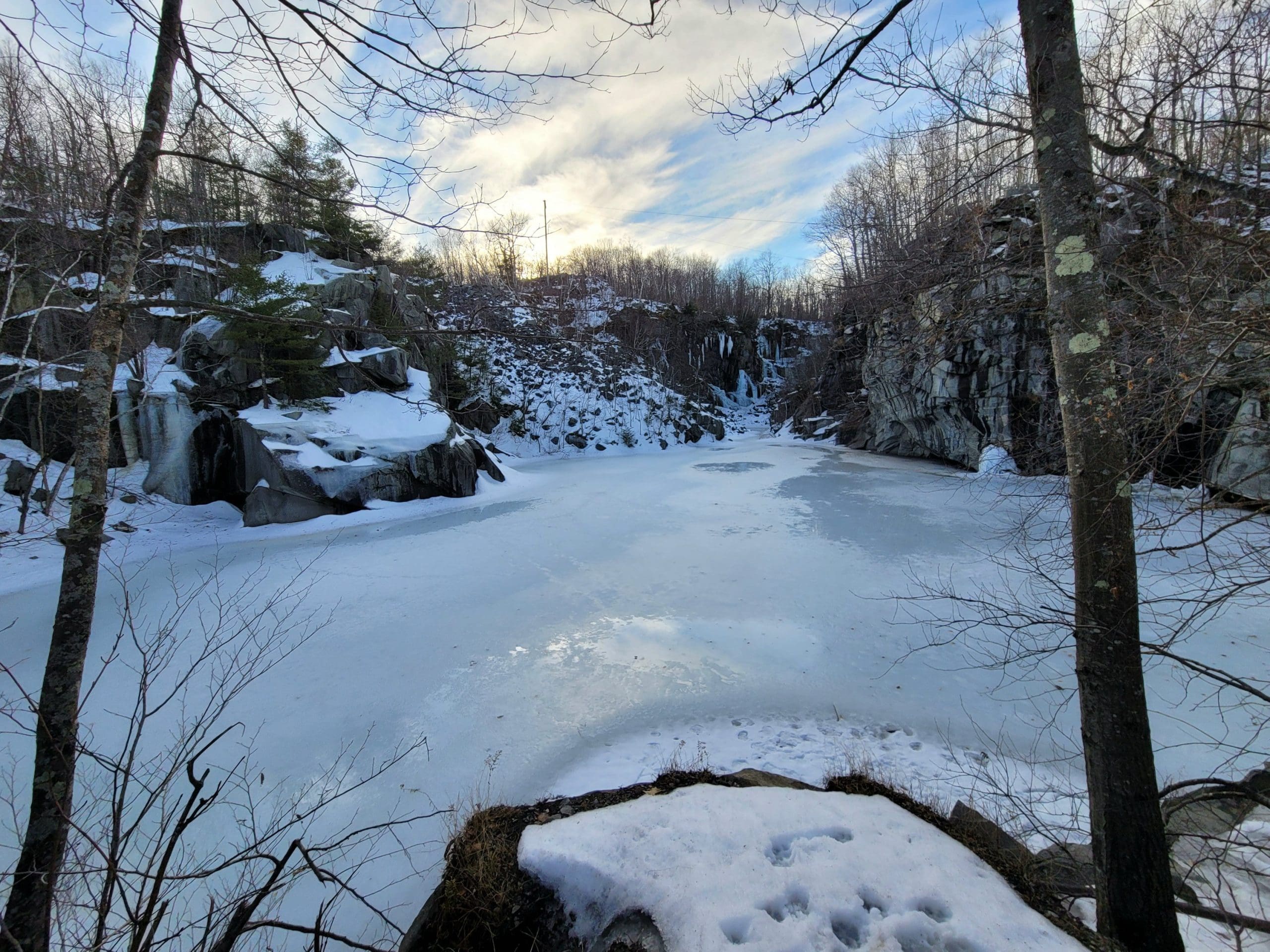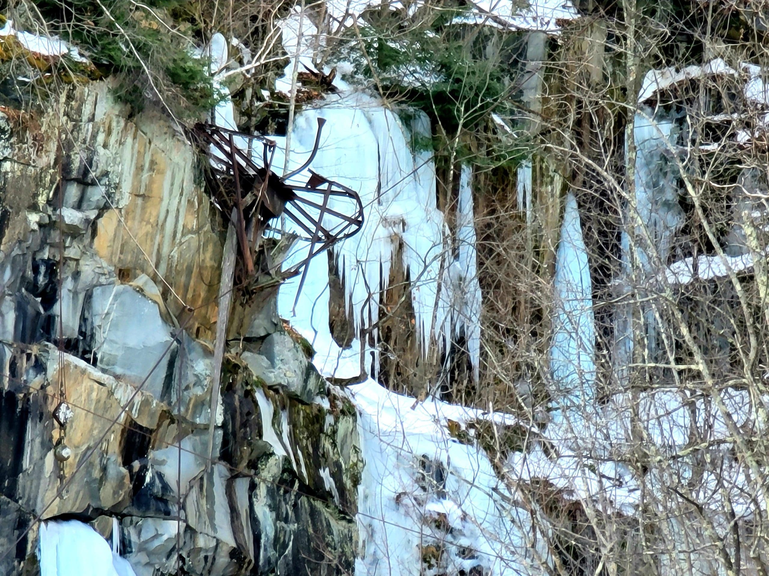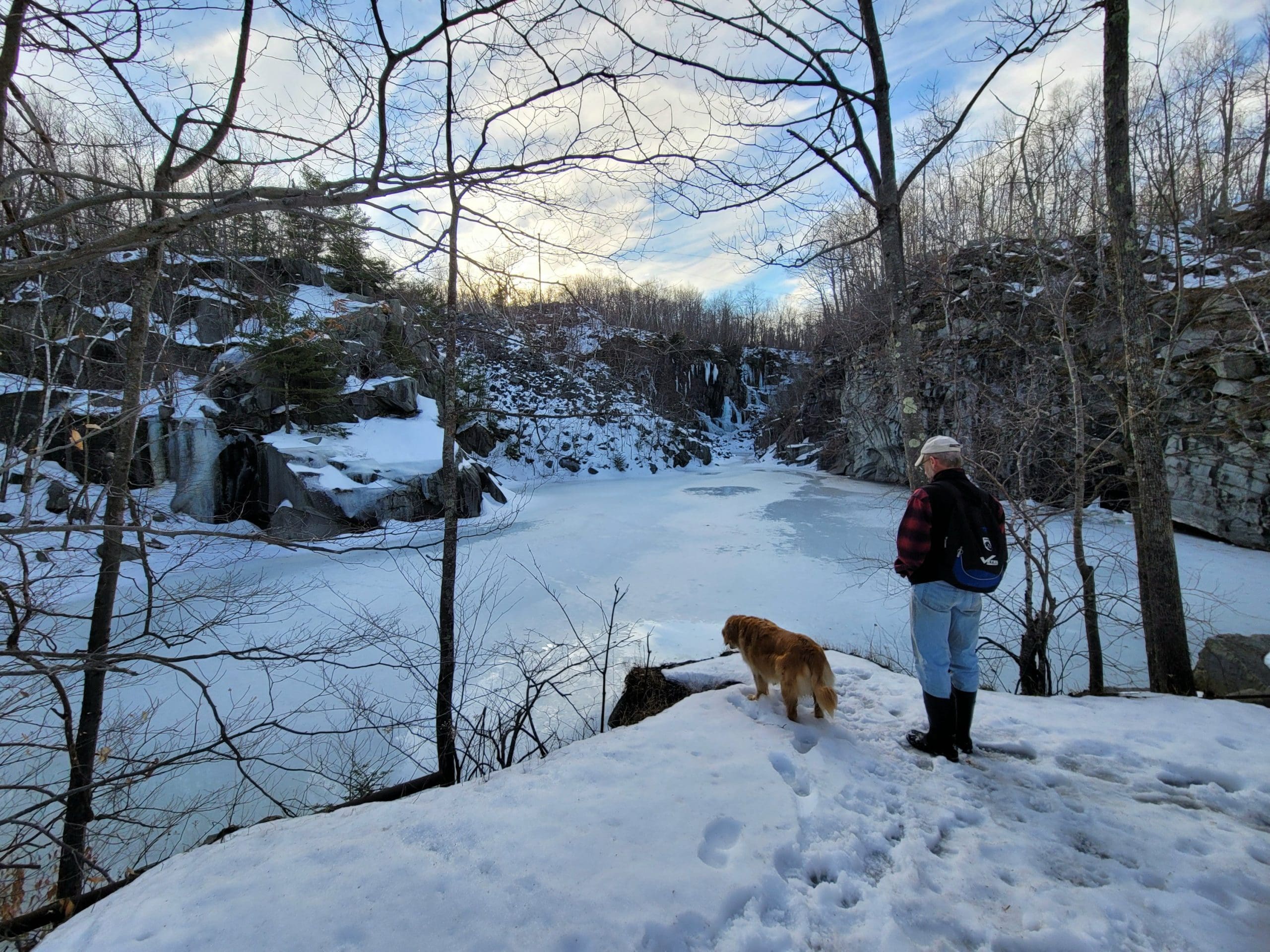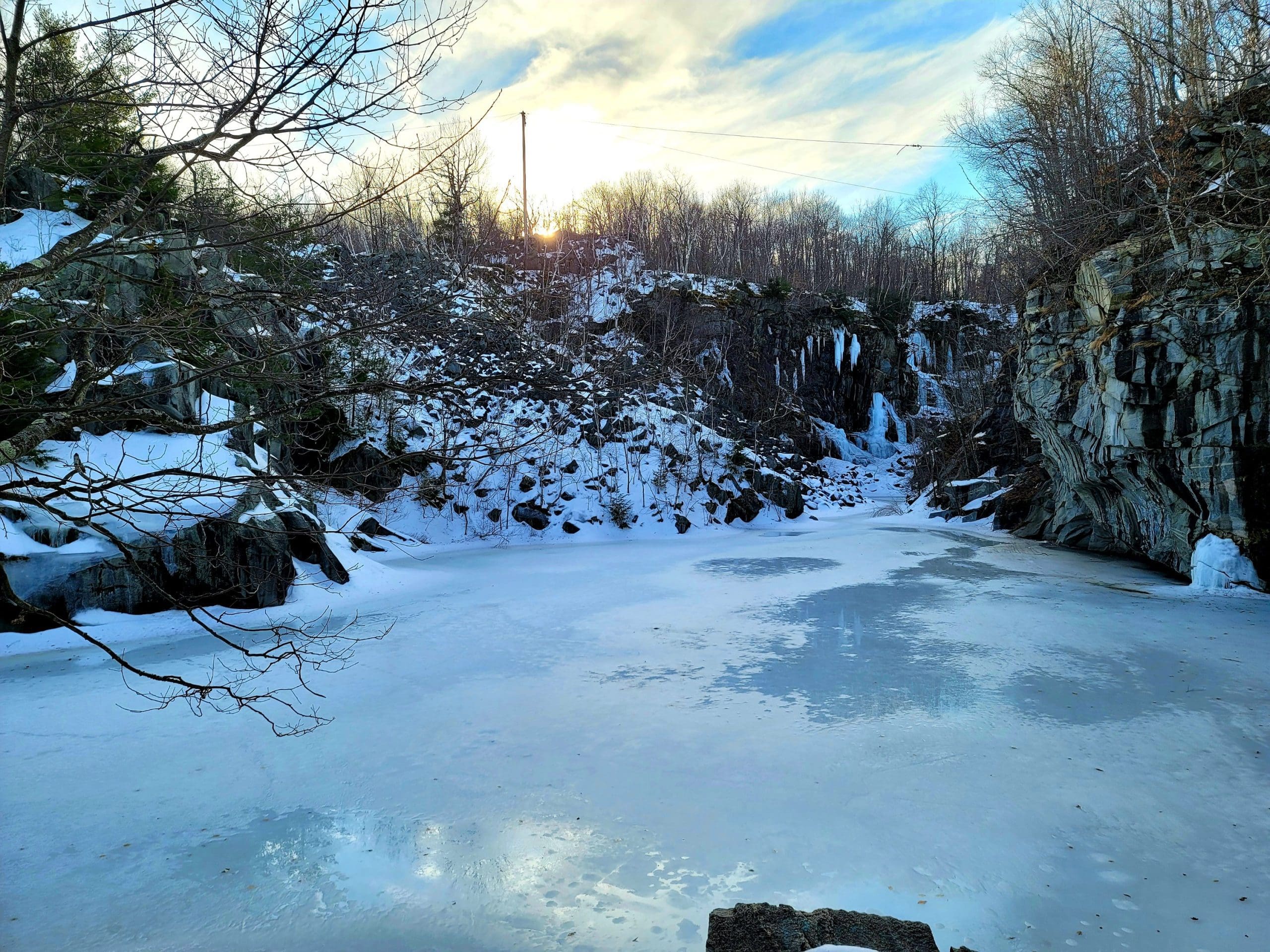 Becket Quarry winter hiking. Going in on the main trail, the smaller grout pile on your left offers sweeping views East and North to Gobble Mountain in Chester and the County line of Berkshire and Hampden County. The main quarry and its old derricks can be seen this time of the year hanging down the quarry walls.