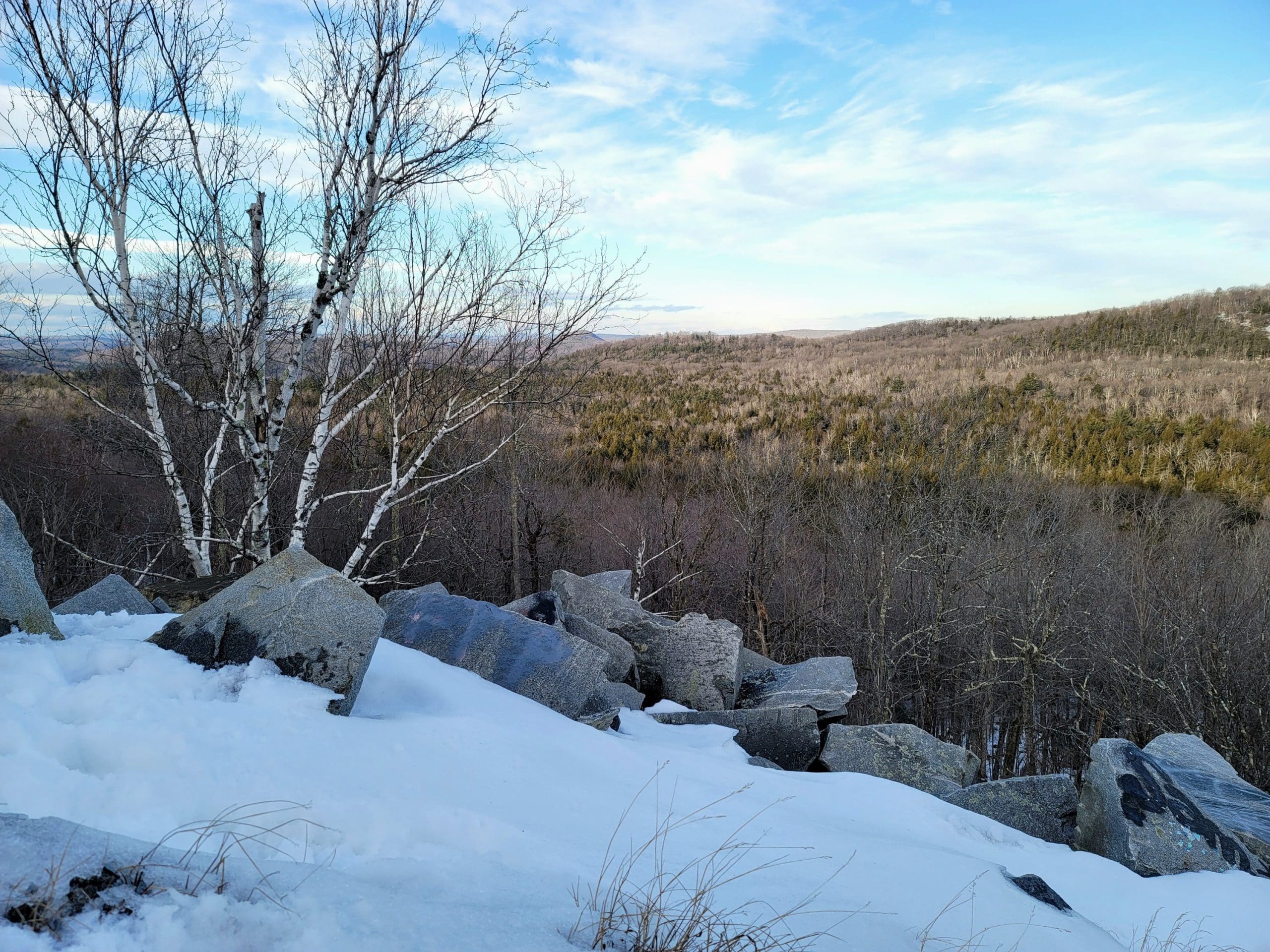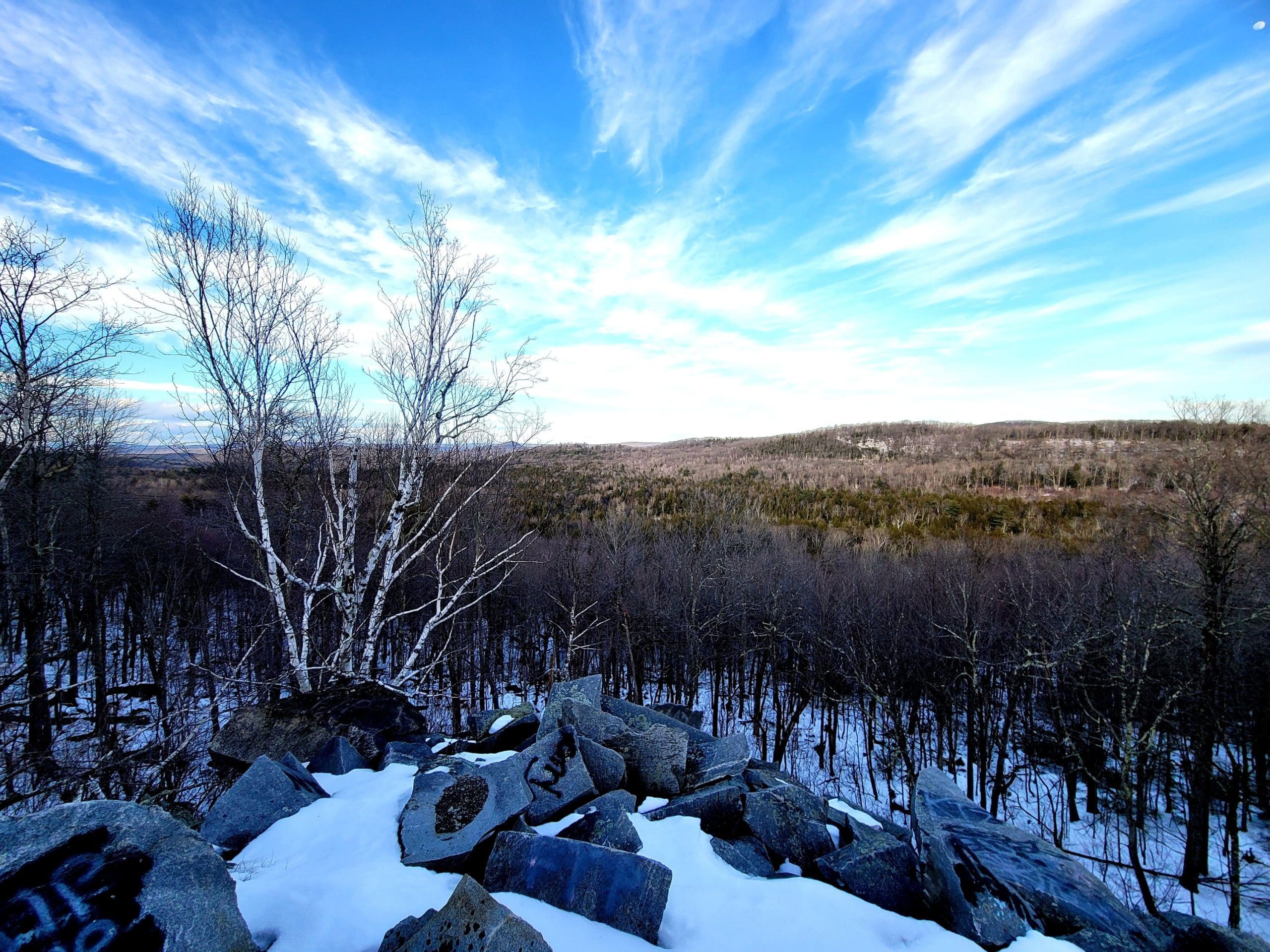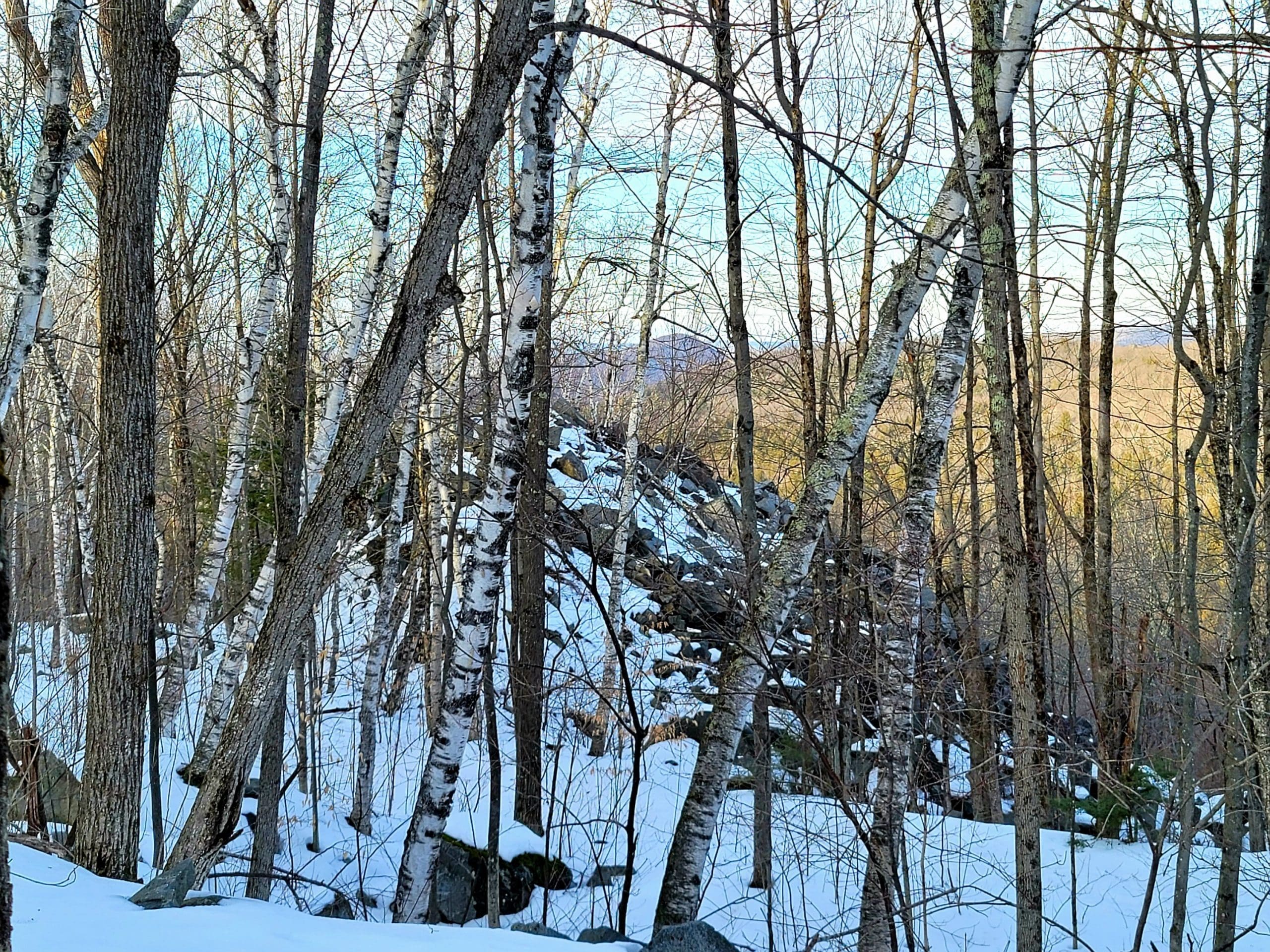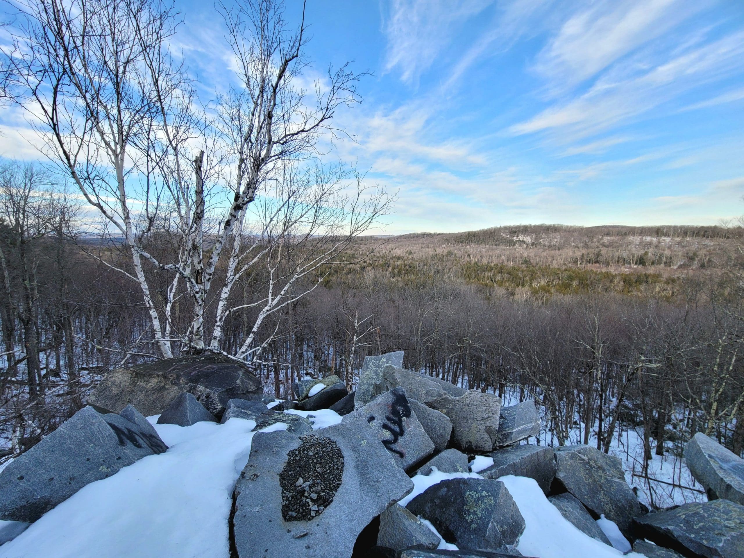 Becket Quarry winter hiking. Going in on the main trail, the smaller grout pile on your left offers sweeping views East and North to Gobble Mountain in Chester and the County line of Berkshire and Hampden County. The main quarry and its old derricks can be seen this time of the year hanging down the quarry walls.