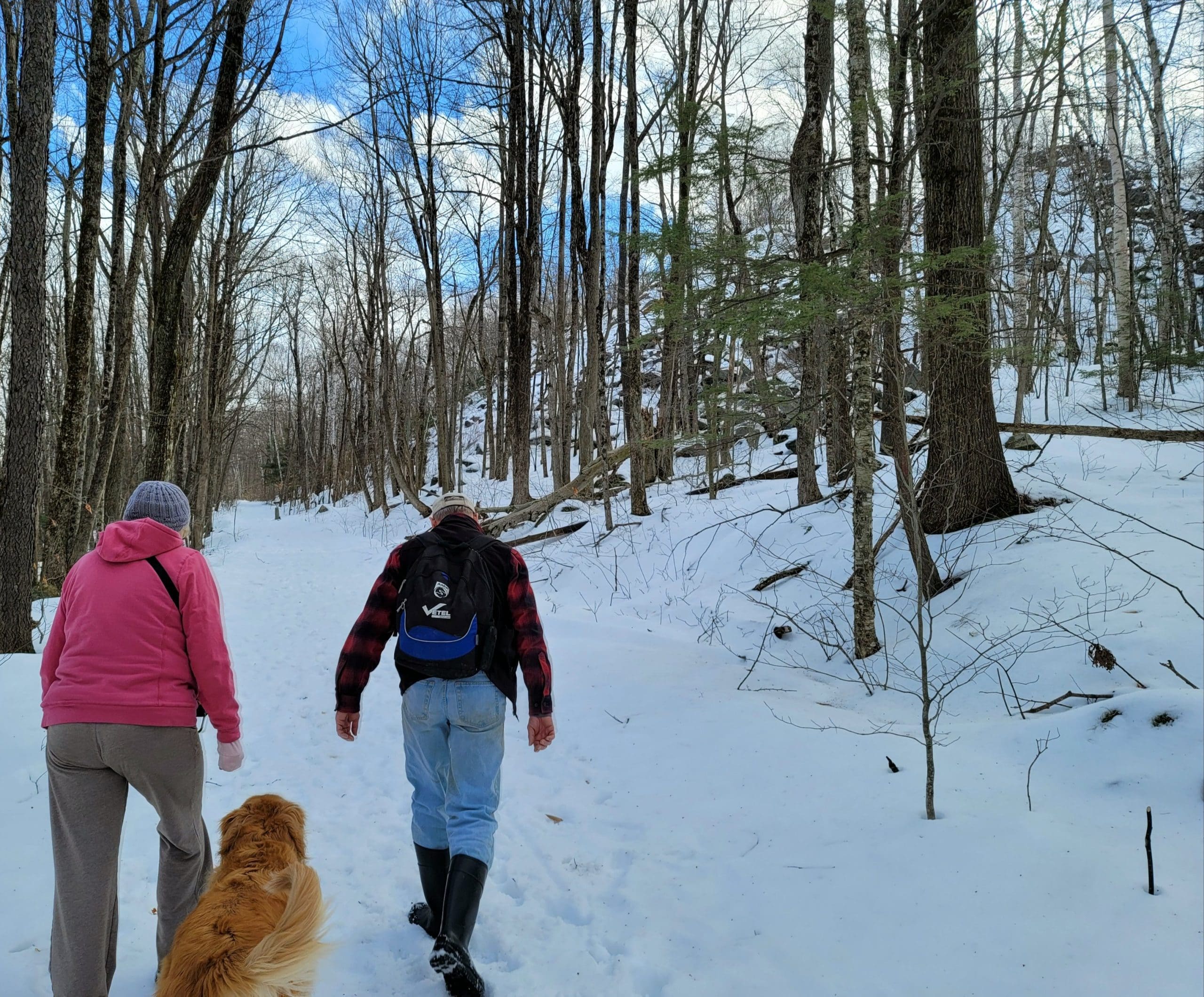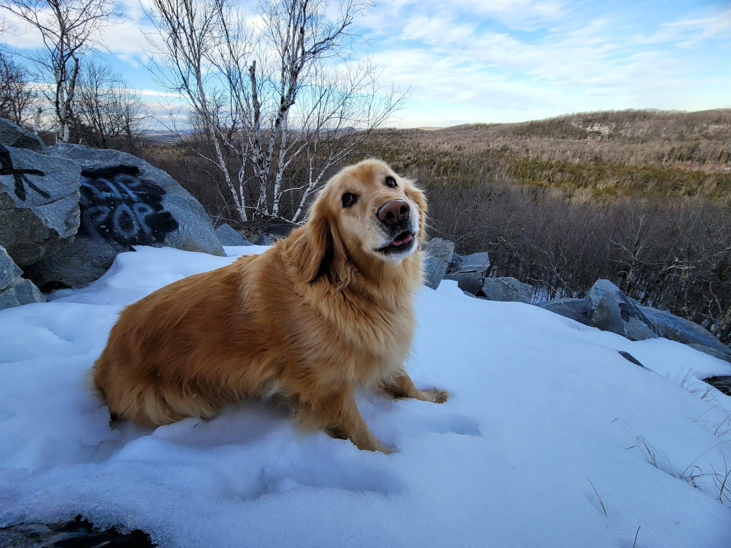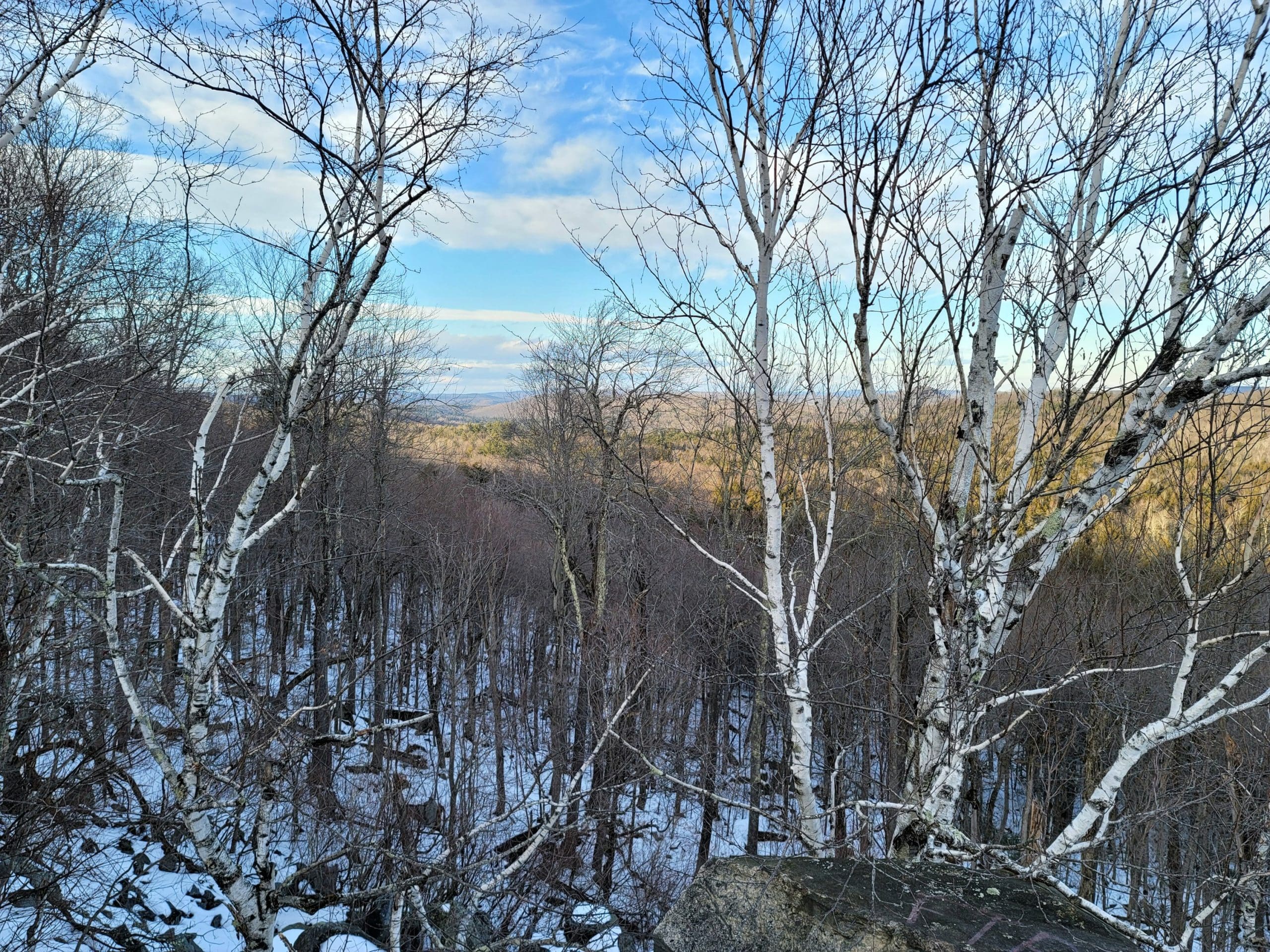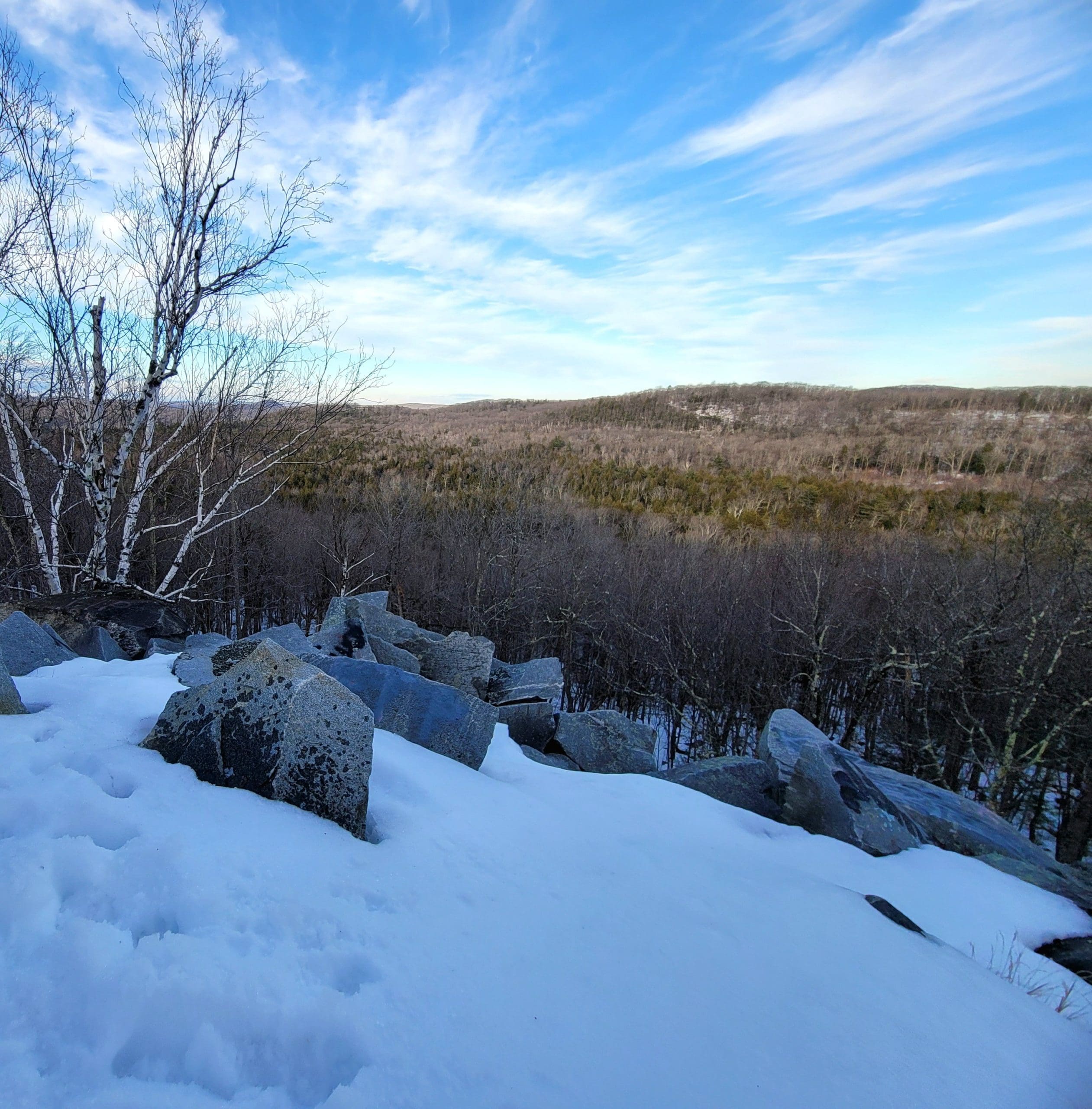 Becket Quarry winter hiking. Going in on the main trail, the smaller grout pile on your left offers sweeping views East and North to Gobble Mountain in Chester and the County line of Berkshire and Hampden County. The main quarry and its old derricks can be seen this time of the year hanging down the quarry walls.