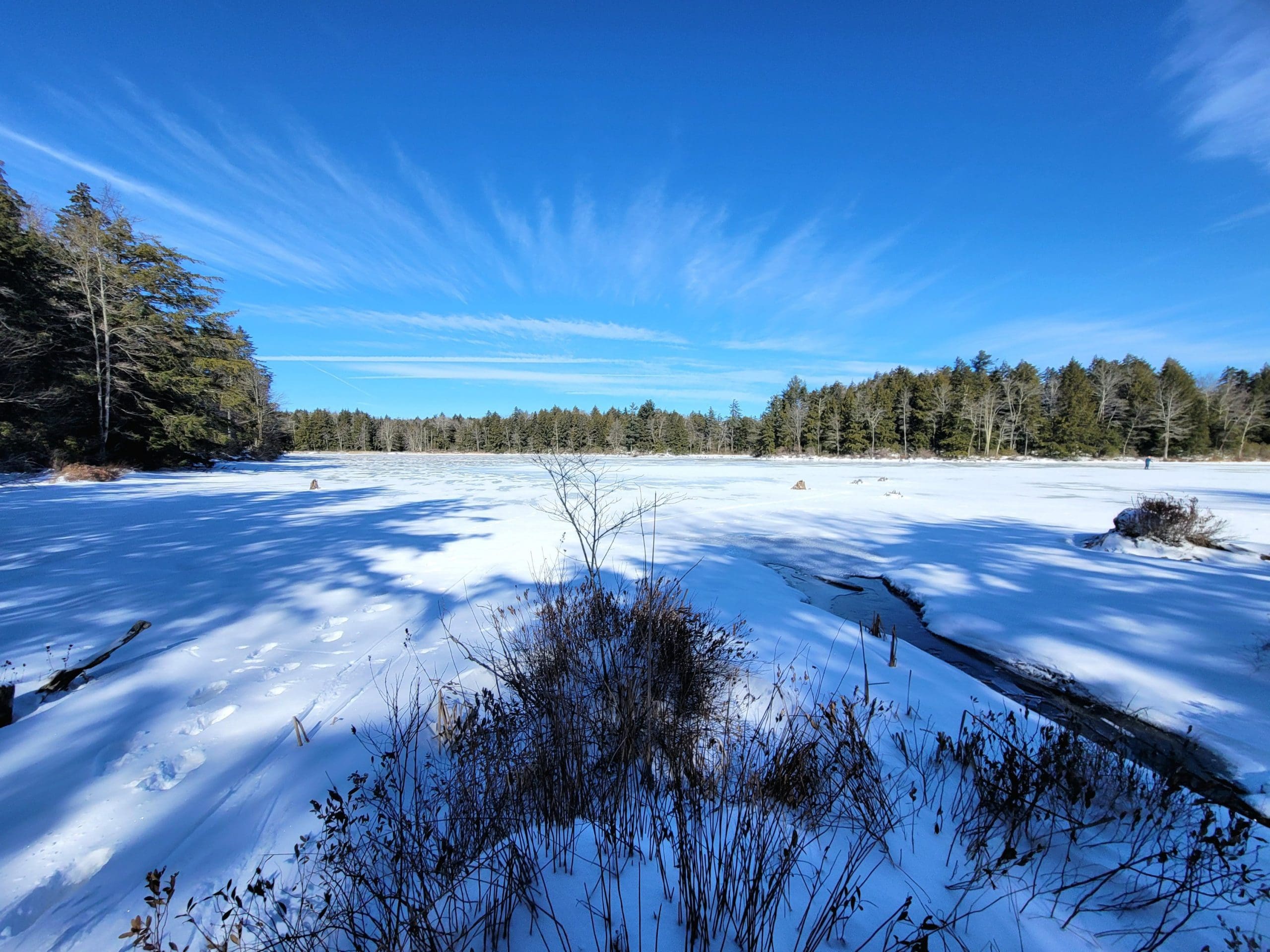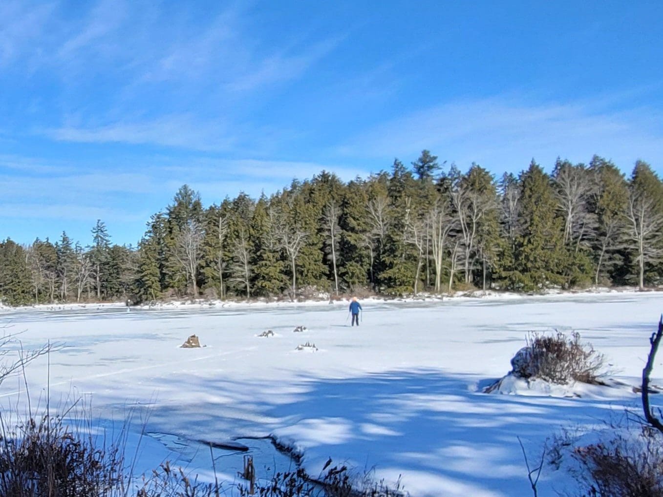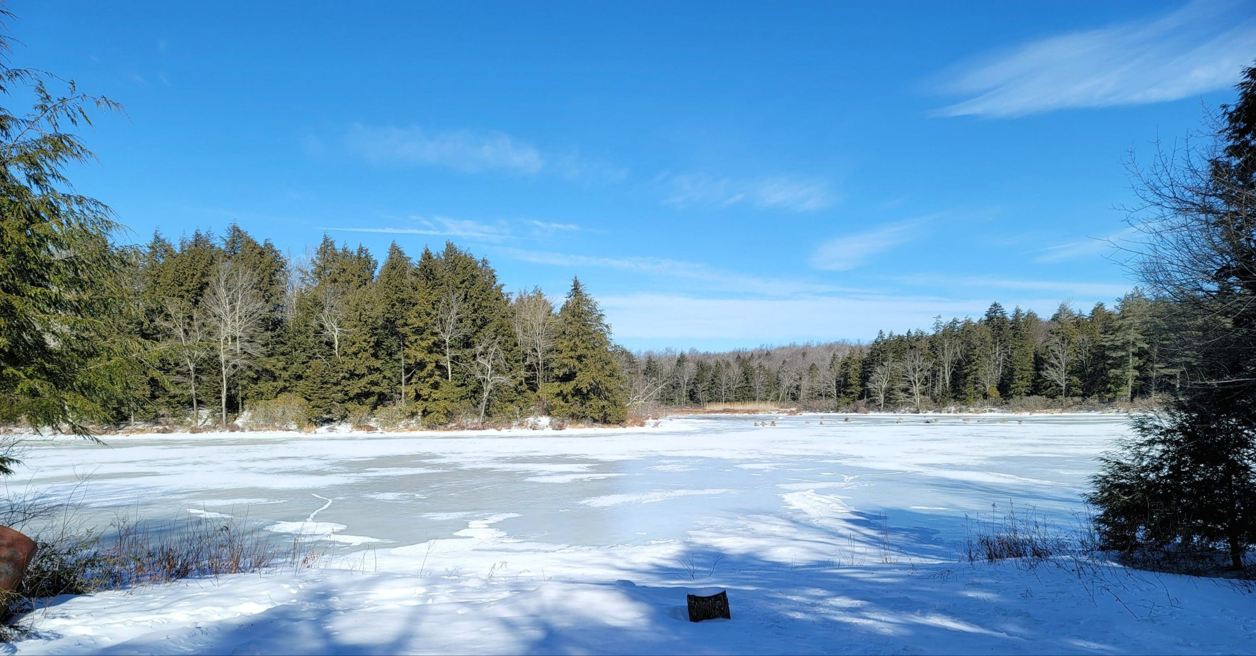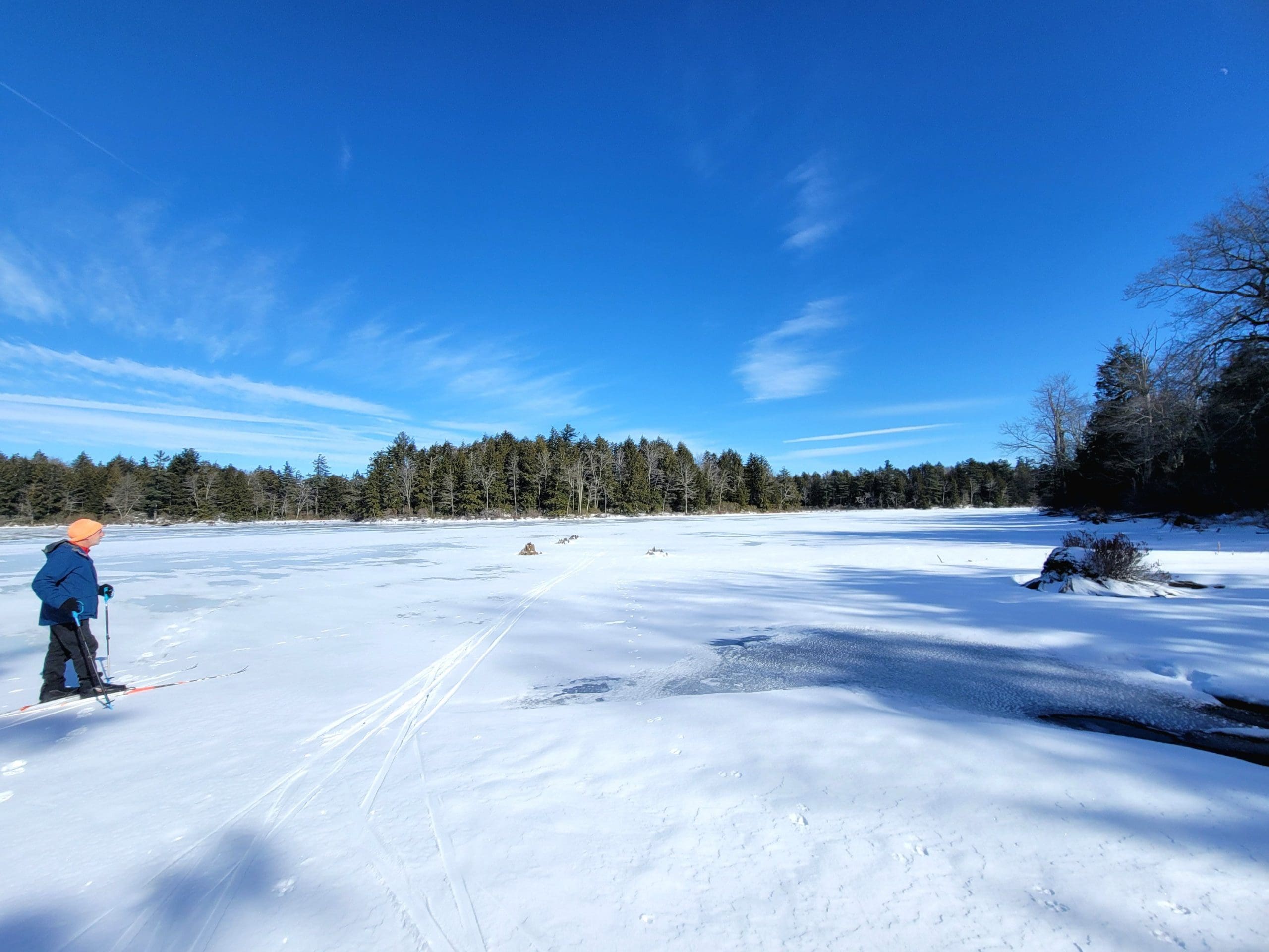 Watson Pond in Otis did not exist on the old maps, simply a brook until a dam was built…or was it the Huckleberry Trolley Line built up to cross the brook and swampy area. Forest skiing -Flash Hike in the Otis State Forest brought us out to this area. Angie thinks the snow is still too deep! Watson lived on the corner of Chandler and Lee Westfield Road in 1858. Iam told the dam was there then but in disrepair.