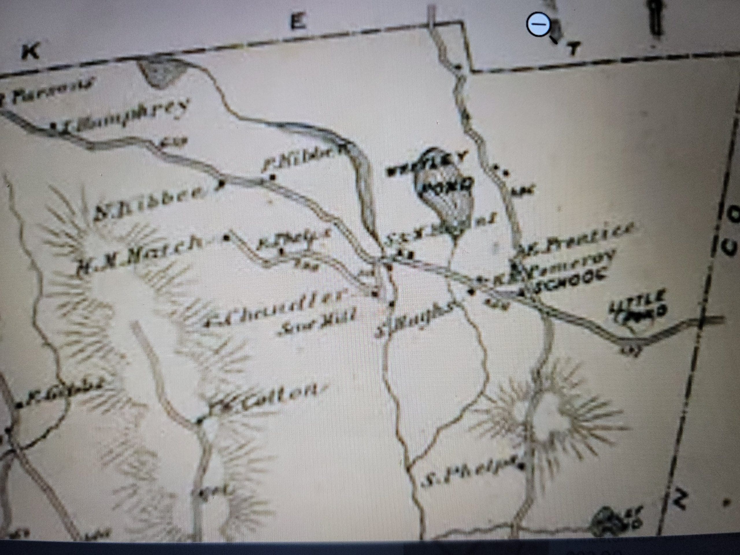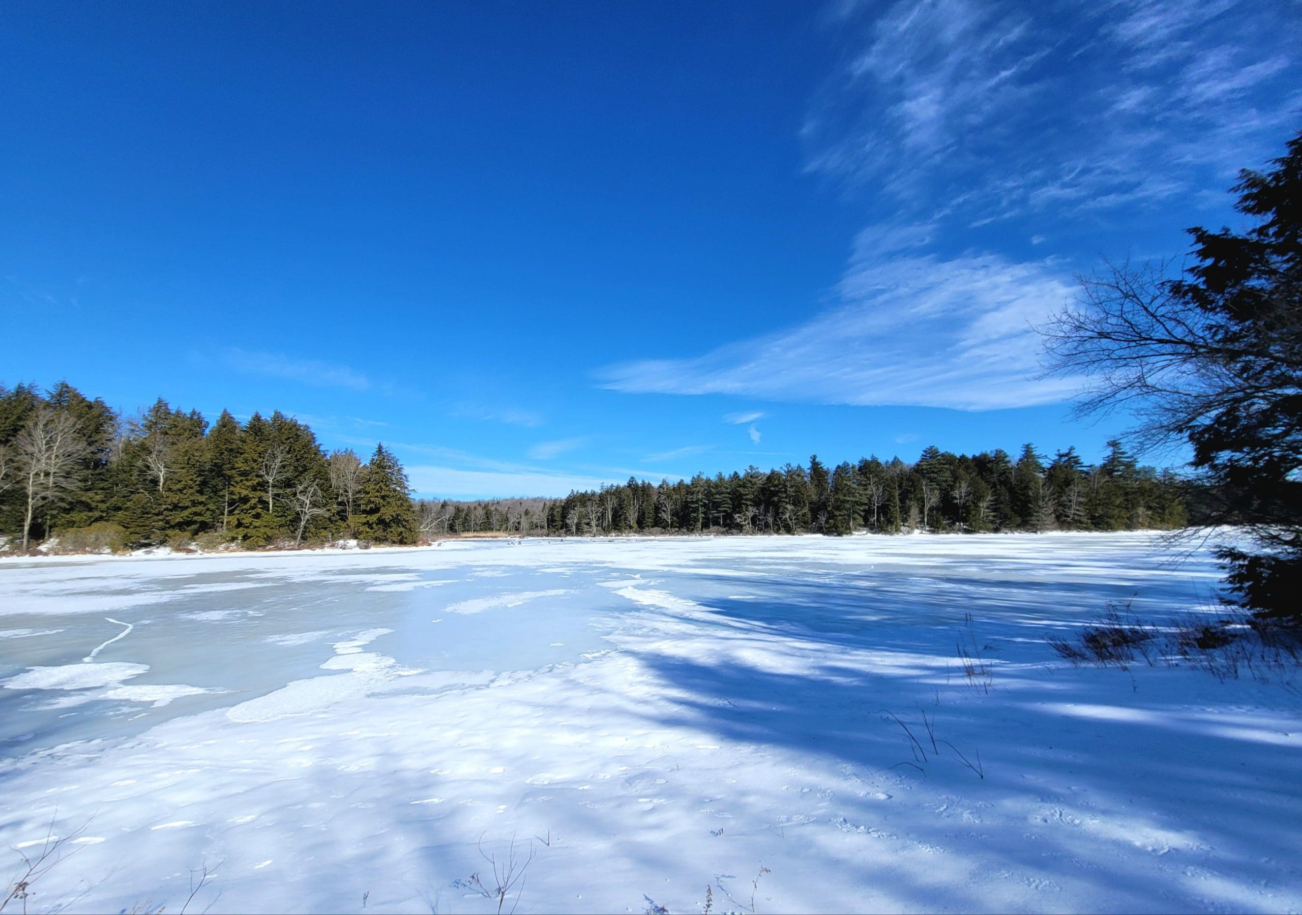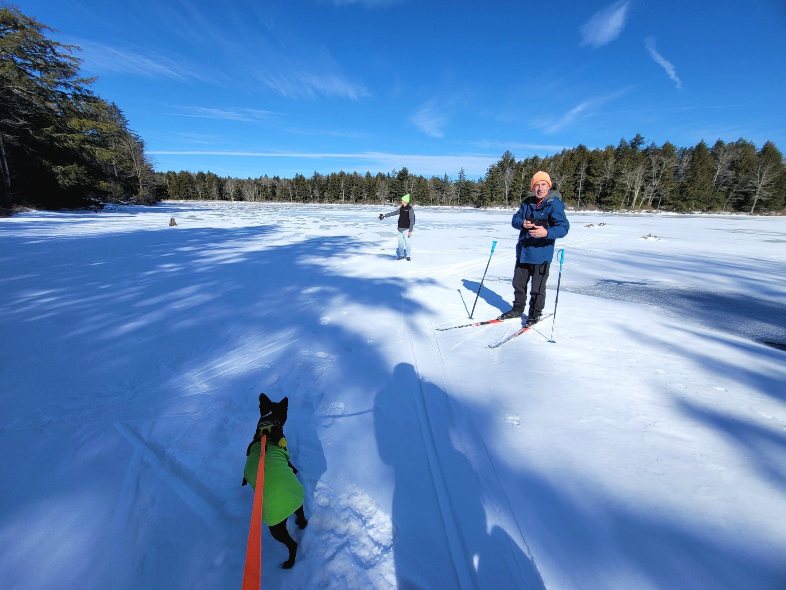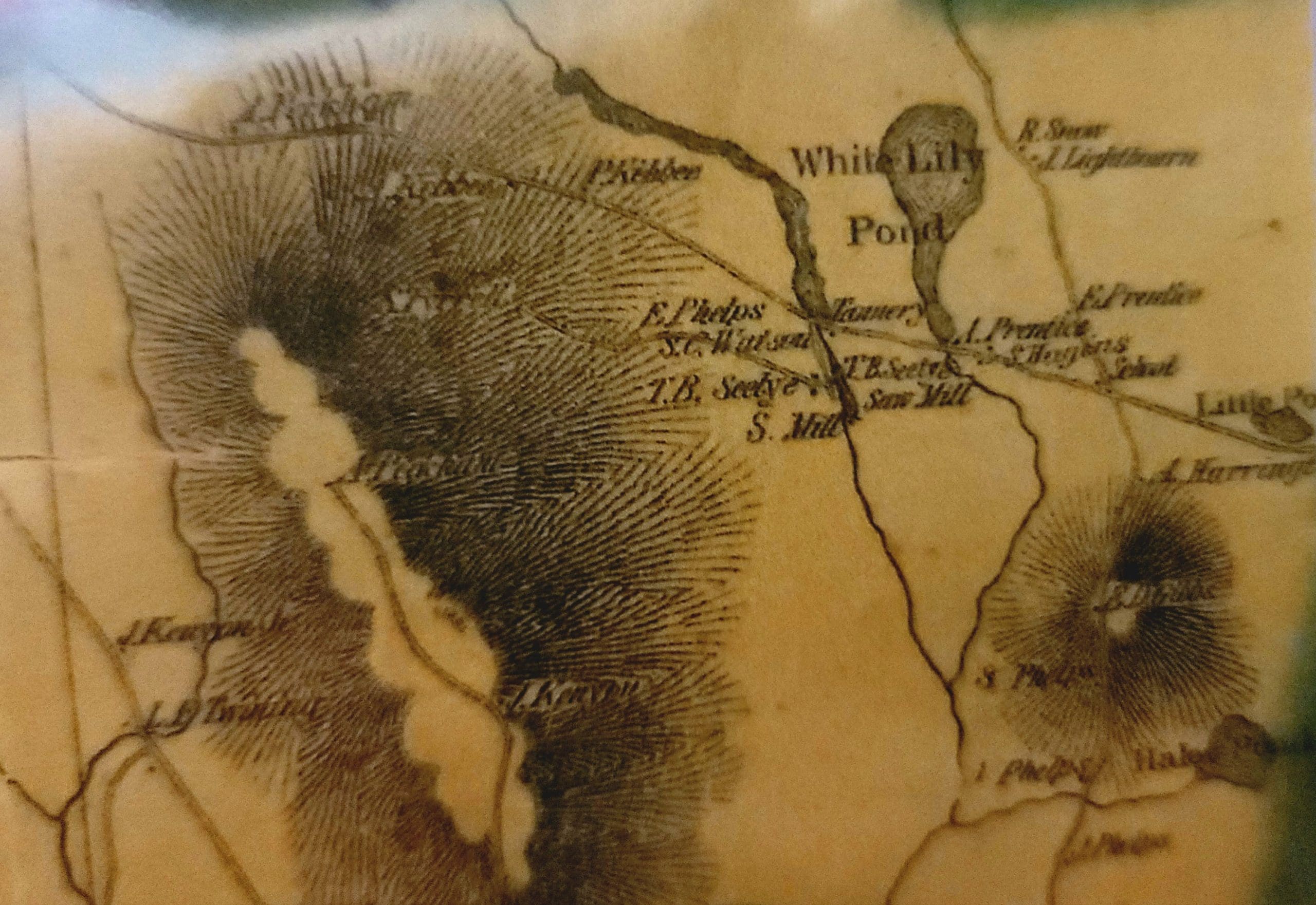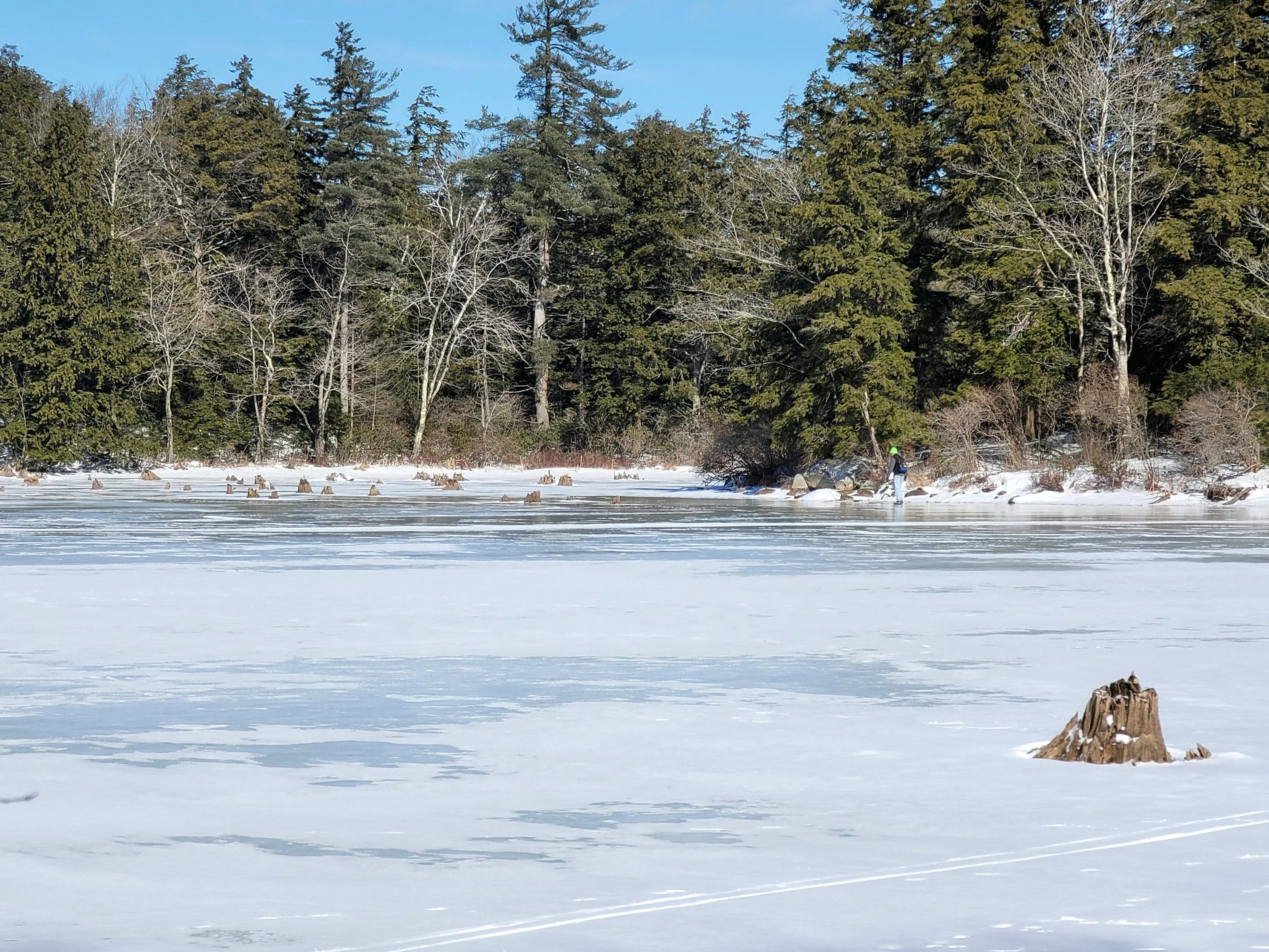 Watson Pond in Otis did not exist on the old maps, simply a brook until a dam was built…or was it the Huckleberry Trolley Line built up to cross the brook and swampy area. Forest skiing -Flash Hike in the Otis State Forest brought us out to this area. Angie thinks the snow is still too deep! Watson lived on the corner of Chandler and Lee Westfield Road in 1858. Iam told the dam was there then but in disrepair.