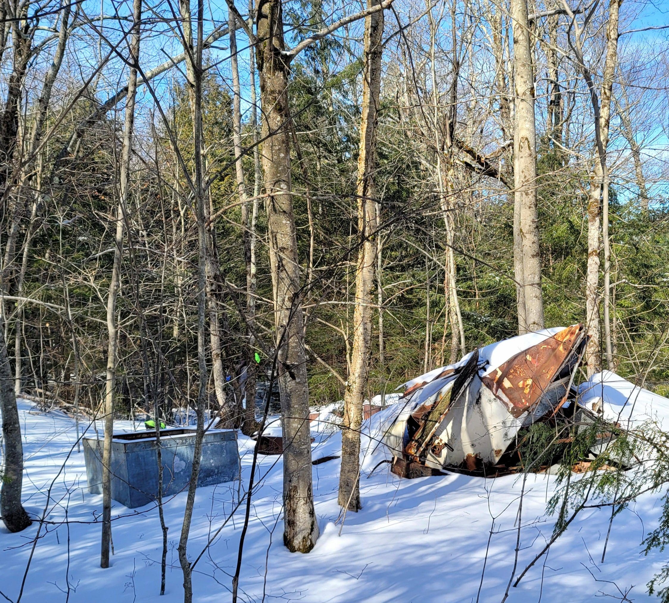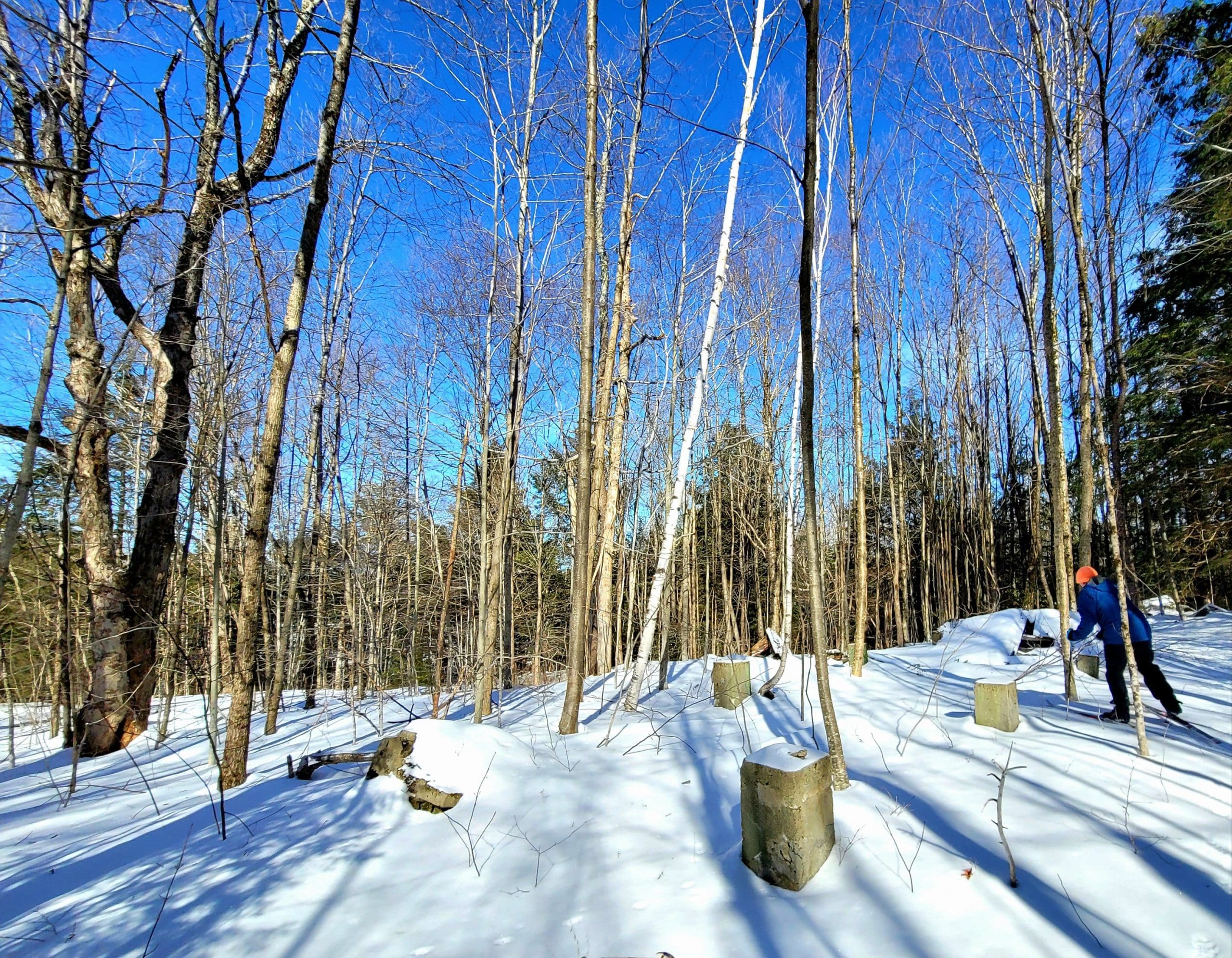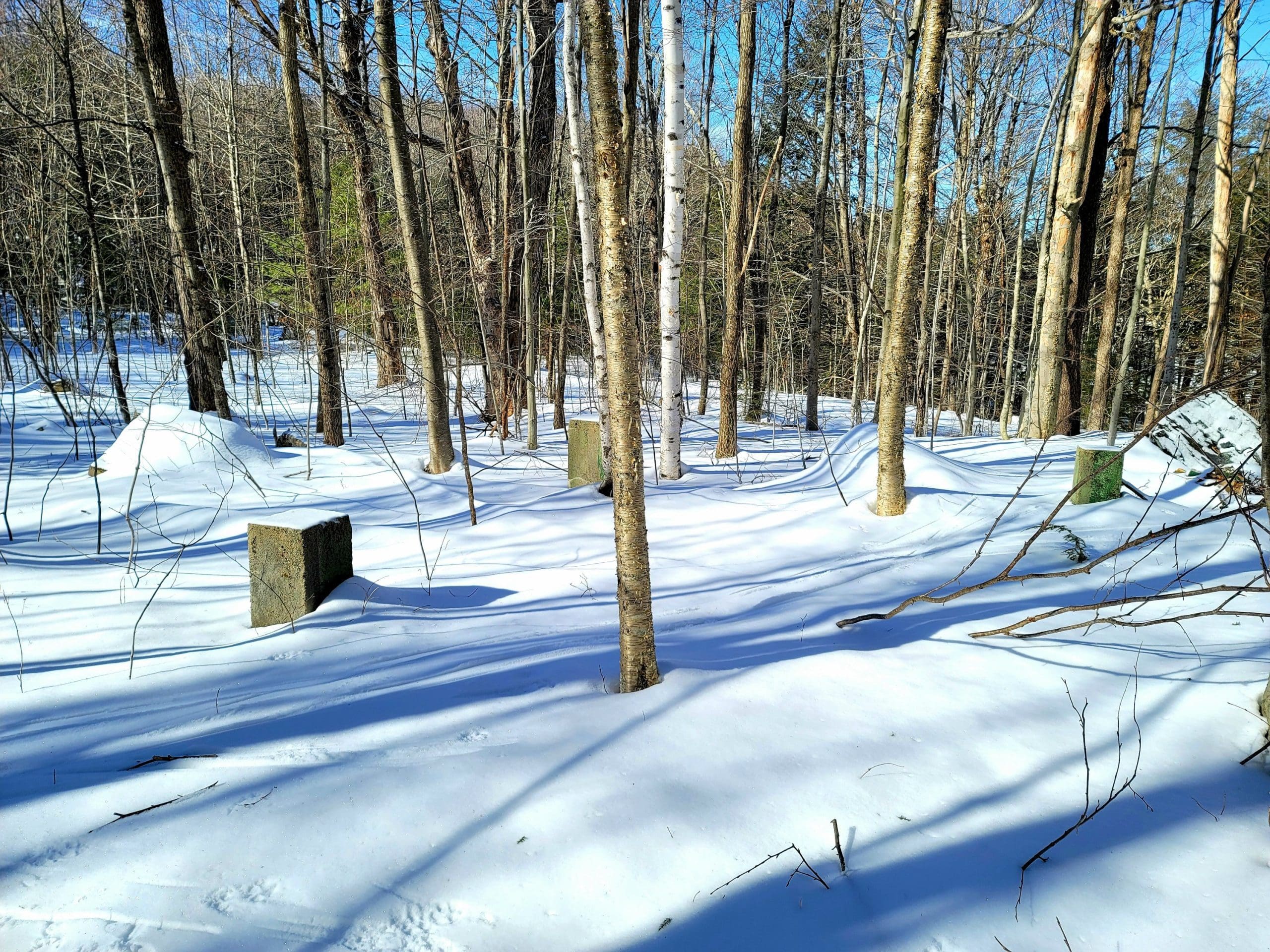 If we had not read everything we could get our hands on, we would of never found this one. On an old short path close to the Otis Substation on the Huckleberry Trolley Line we found the trolley workers camp. There were several along the line, which housed the Polish and Italian workers who dug the grades, laid the tracks. 1800’s map overlays show there were at least 20 small structures here. No doubt it was set up here because within a half mile radius was the power substation and a passenger trolley stop (former Kibbee cellar hole on Lee Westfield Rd)