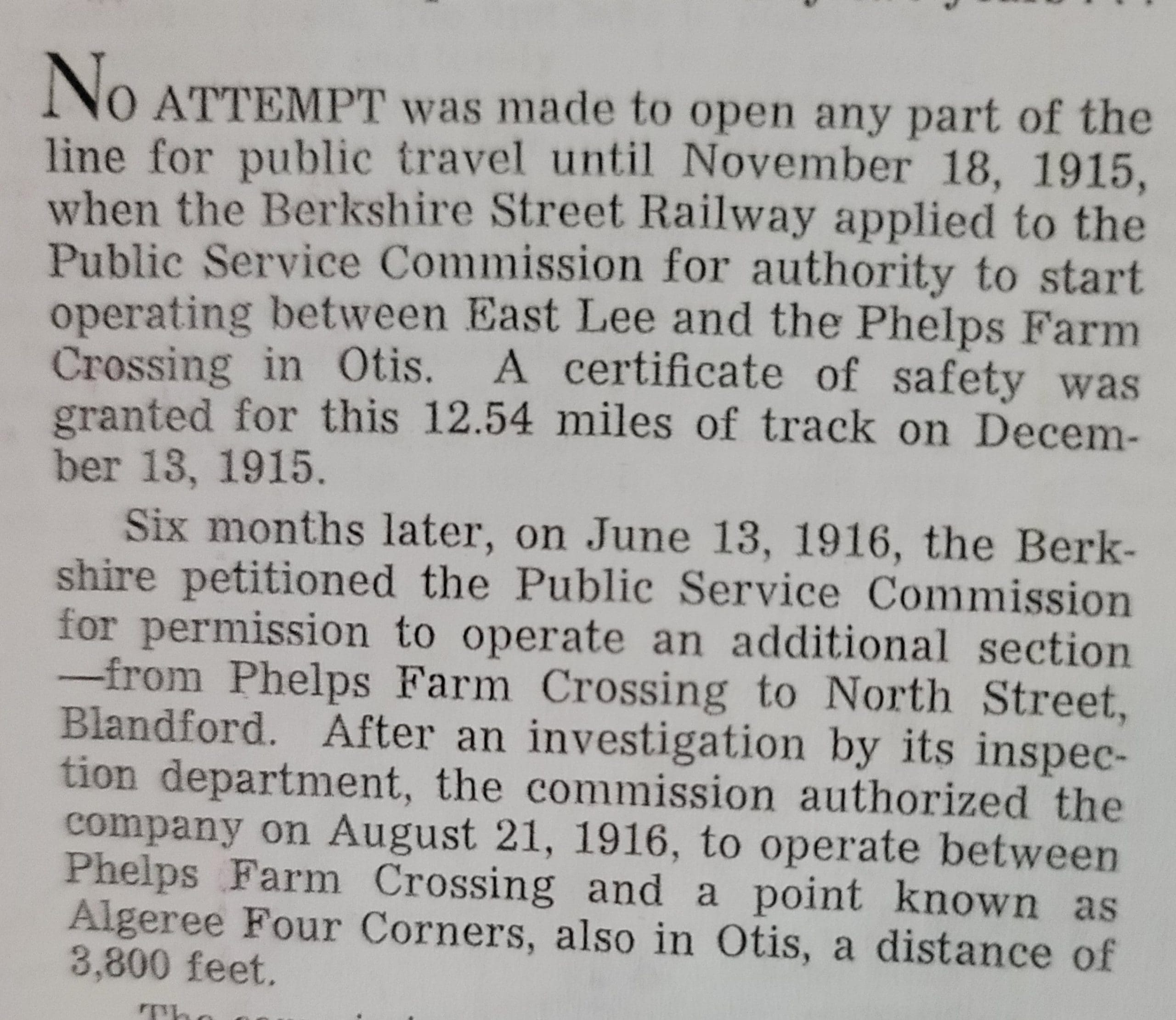 To serve the Huckleberry Line, a 33,000 volt transmission line was erected from East Lee to a point near Creek Pond in Otis, where the street. railway provided a permanent substation which was equipped with two 300 Kw.rotary converters, one new and one formerly located at Pittsfield. The necessary transformers were located out doors. From Otis, an 11,000 volt line ran easterly. to a portable substation at Cook Mountain in Huntington.(courtesy Berkshire Railway)