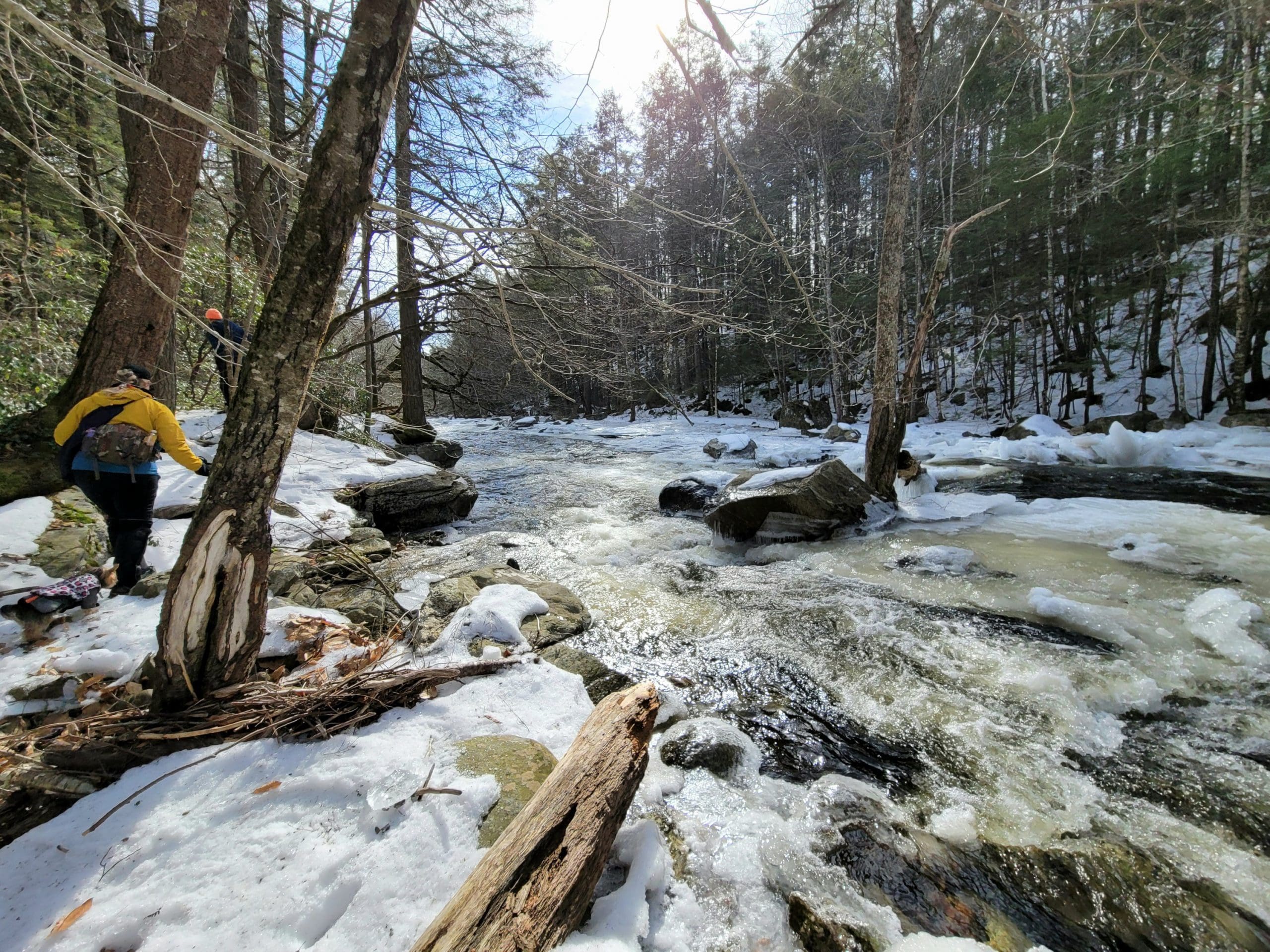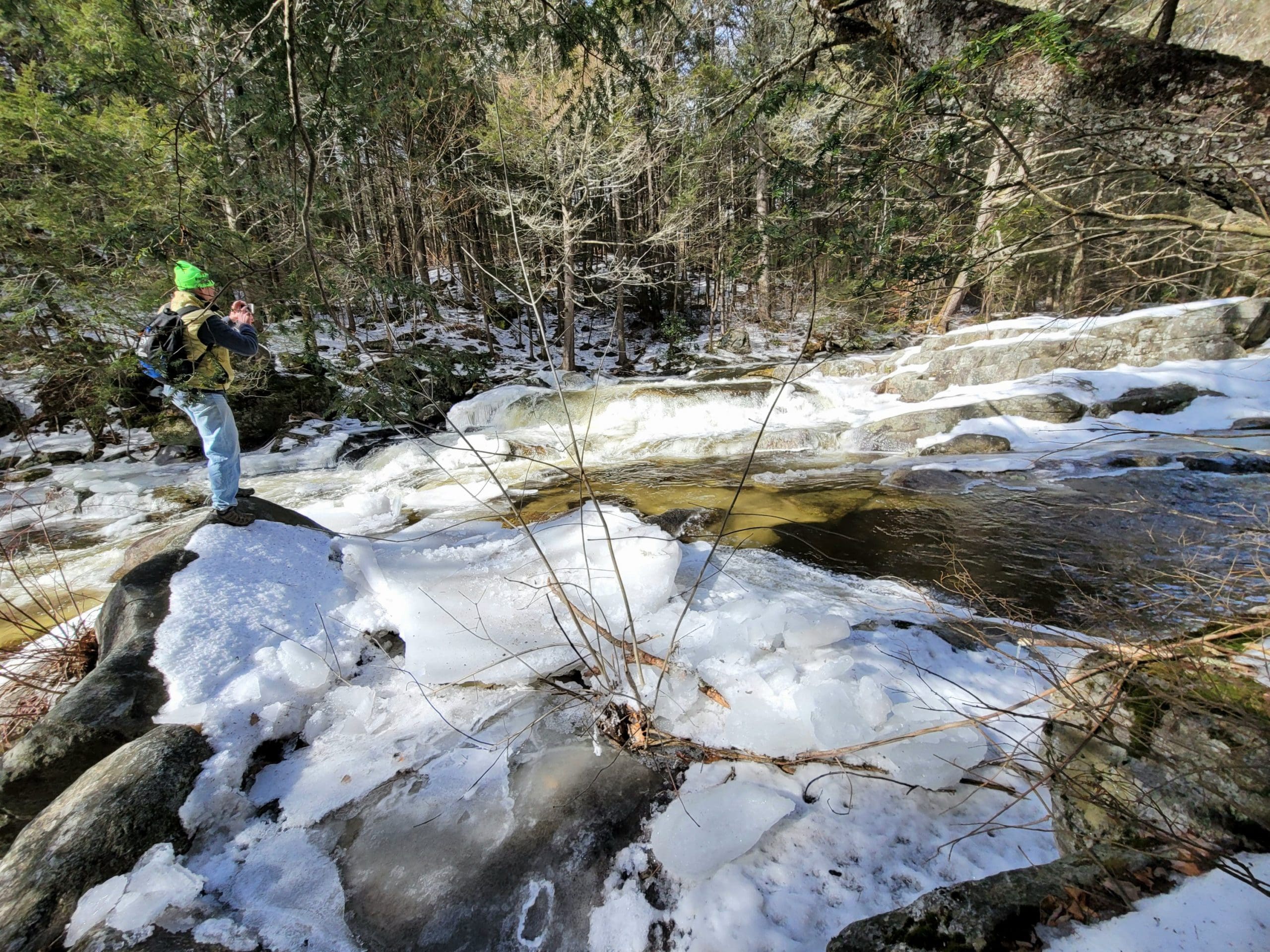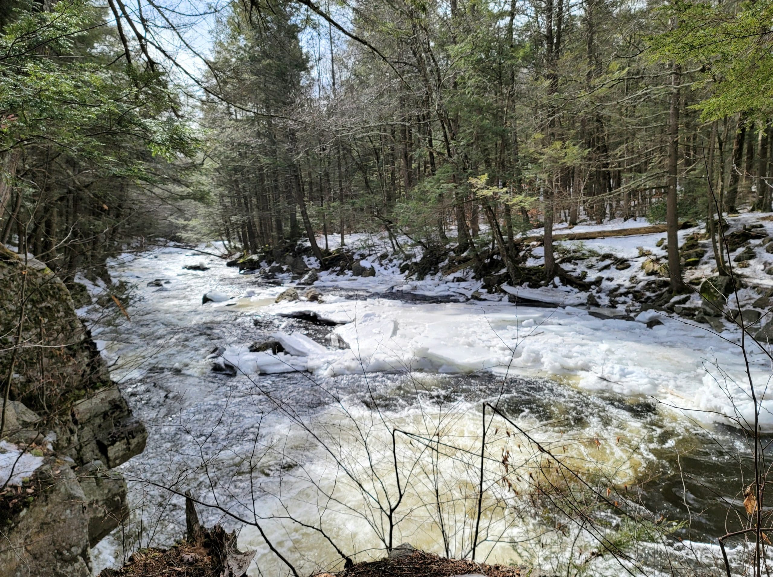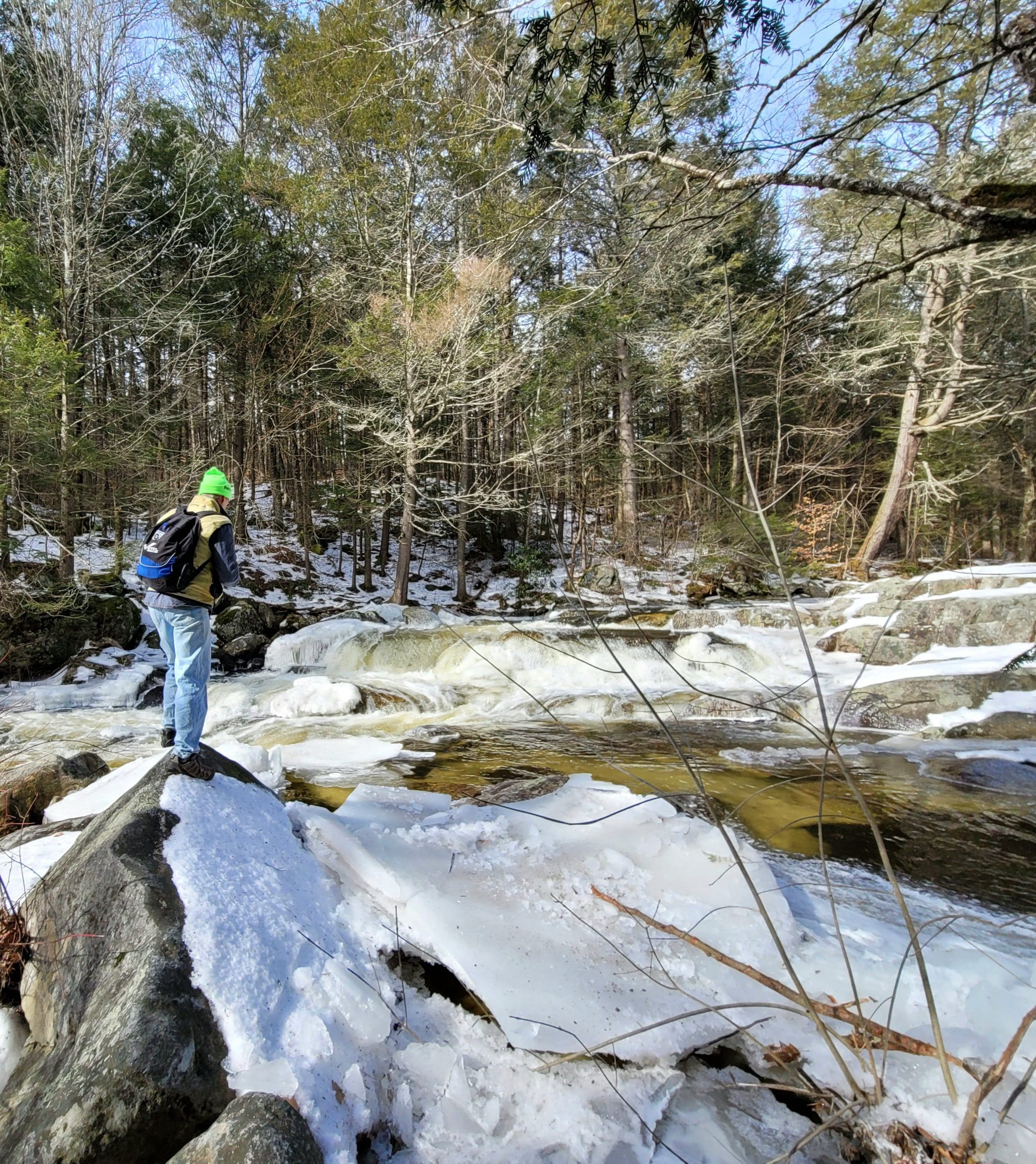 Granville State Forest on West Hartland Road offers beautiful hiking in winter! Set out on a Flash Hike before a blizzard. We hiked 2.5 miles on the Hubbard River Trail in and back, this trail is across from the parking lot and begins as paved. We saw fresh moose tracks, CCC workers stone laid bridges, the old camp sites from when the state forest was created during the Great Depression in the 1920’s. It was one of the first state forest campgrounds in 1933 and under the National Park Service. Beautiful rock formations in the river with tumbling waterfalls, endless photo opportunities and the trail is flat and enjoyable!