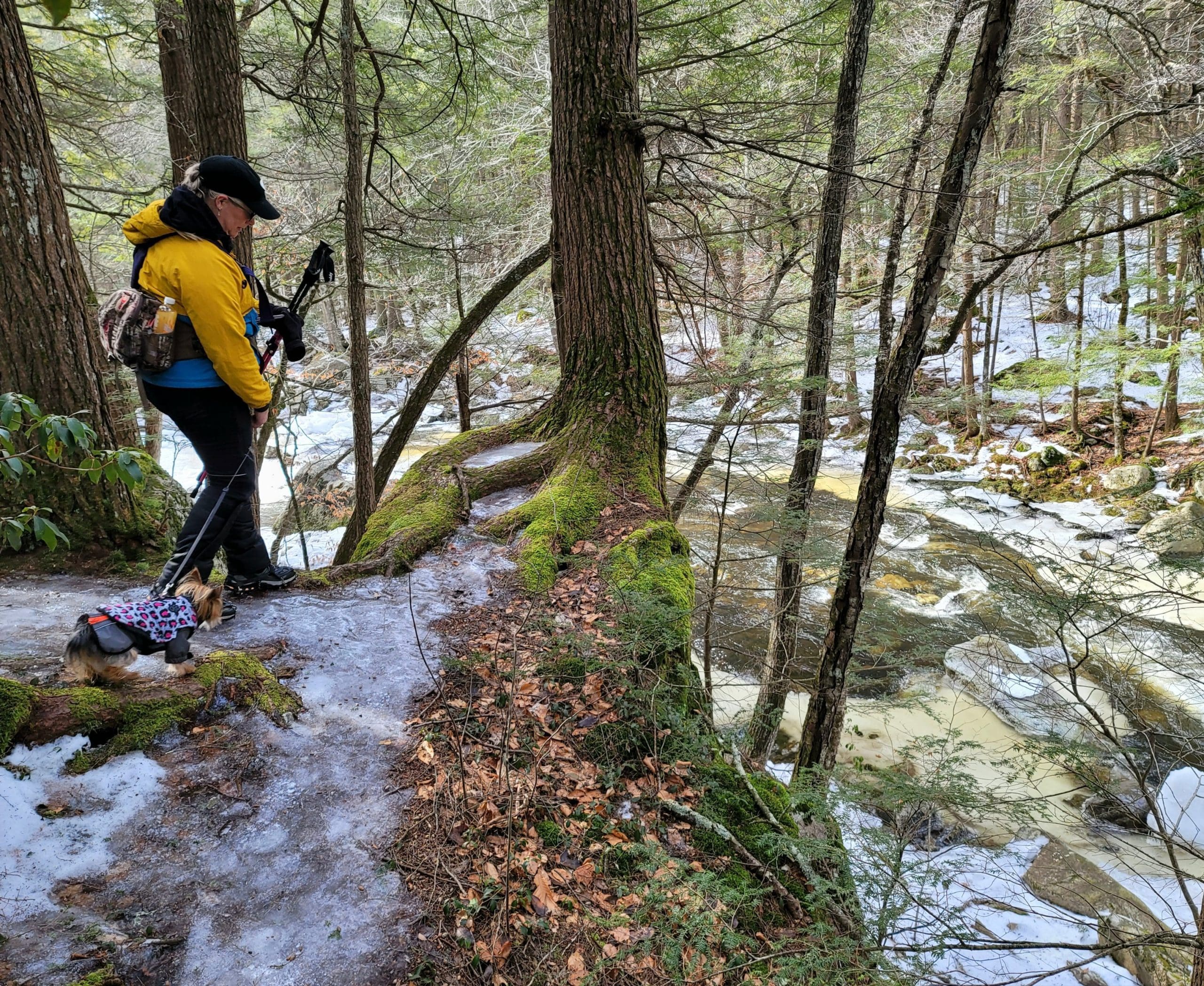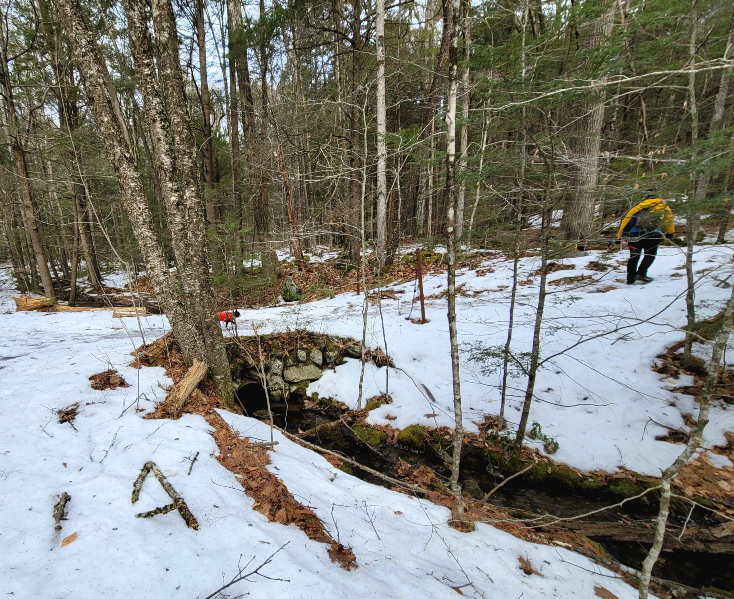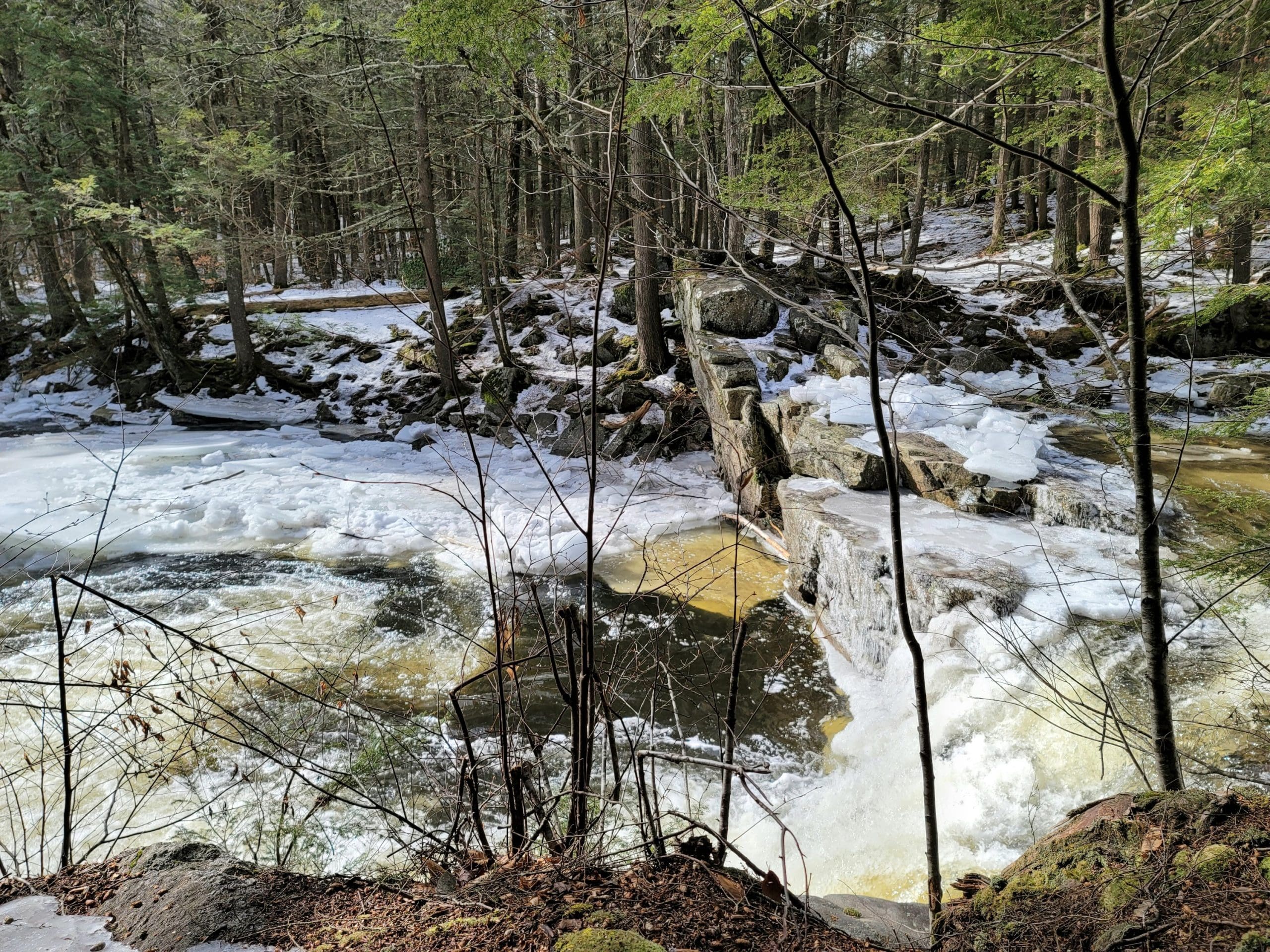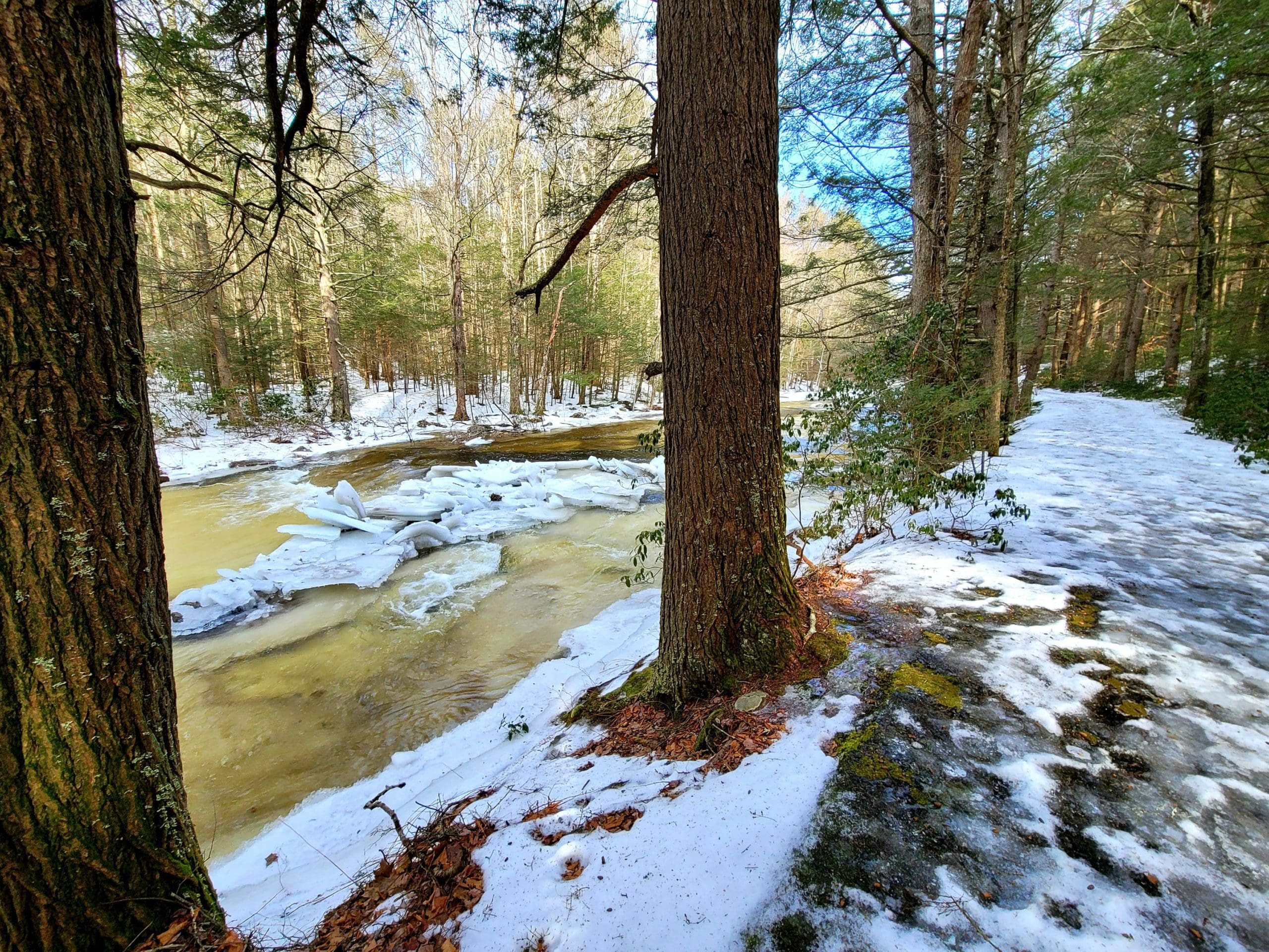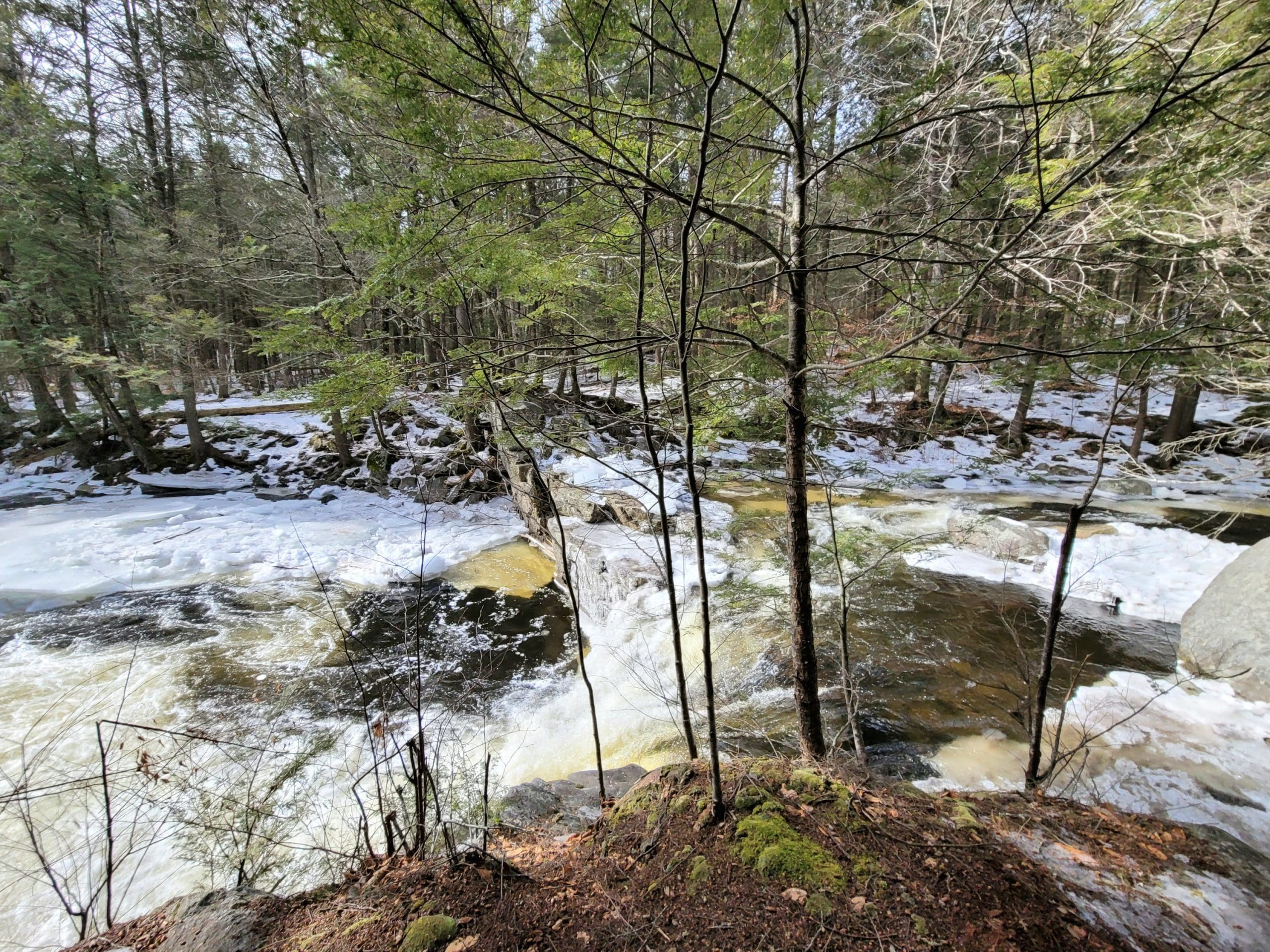 Granville State Forest on West Hartland Road offers beautiful hiking in winter! Set out on a Flash Hike before a blizzard. We hiked 2.5 miles on the Hubbard River Trail in and back, this trail is across from the parking lot and begins as paved. We saw fresh moose tracks, CCC workers stone laid bridges, the old camp sites from when the state forest was created during the Great Depression in the 1920’s. It was one of the first state forest campgrounds in 1933 and under the National Park Service. Beautiful rock formations in the river with tumbling waterfalls, endless photo opportunities and the trail is flat and enjoyable!