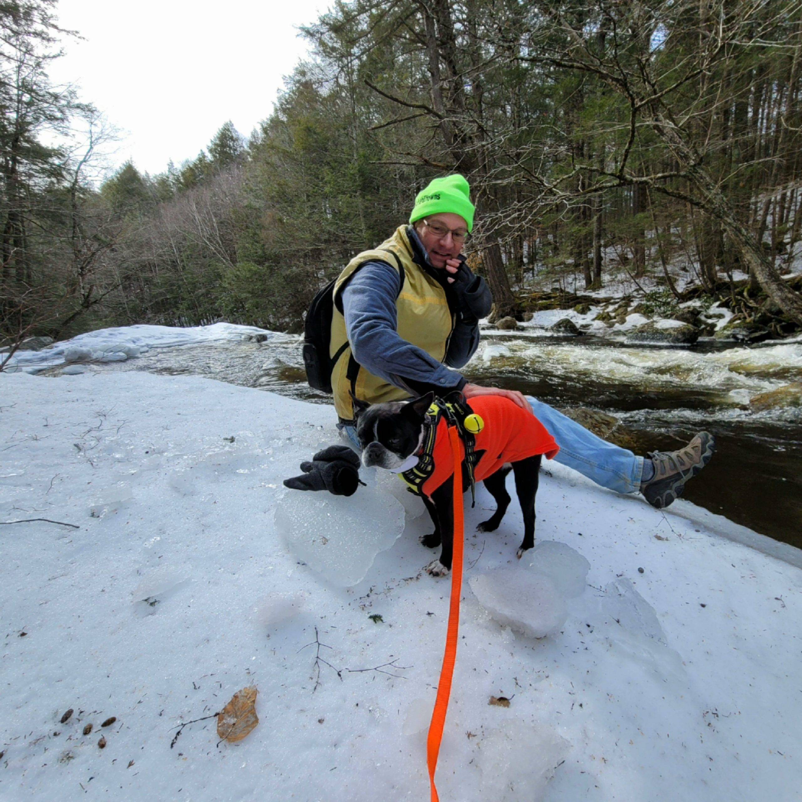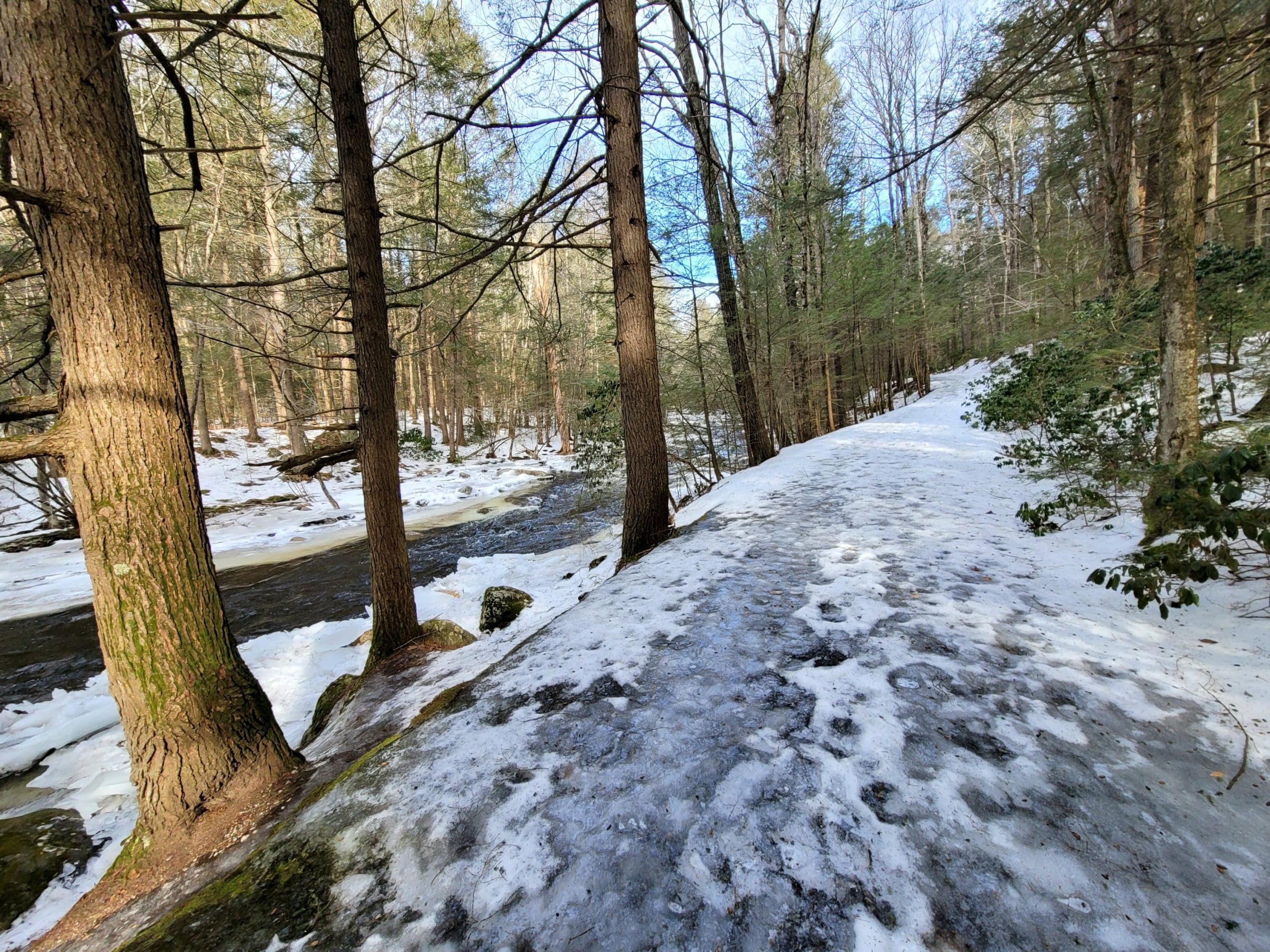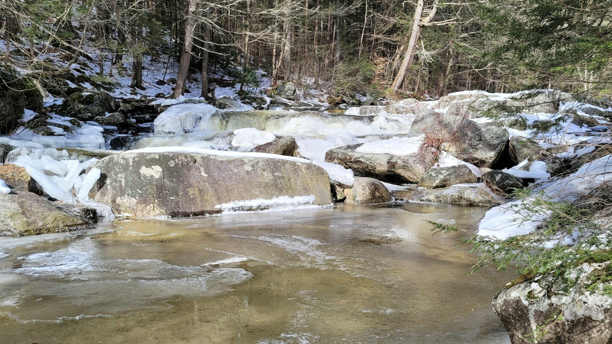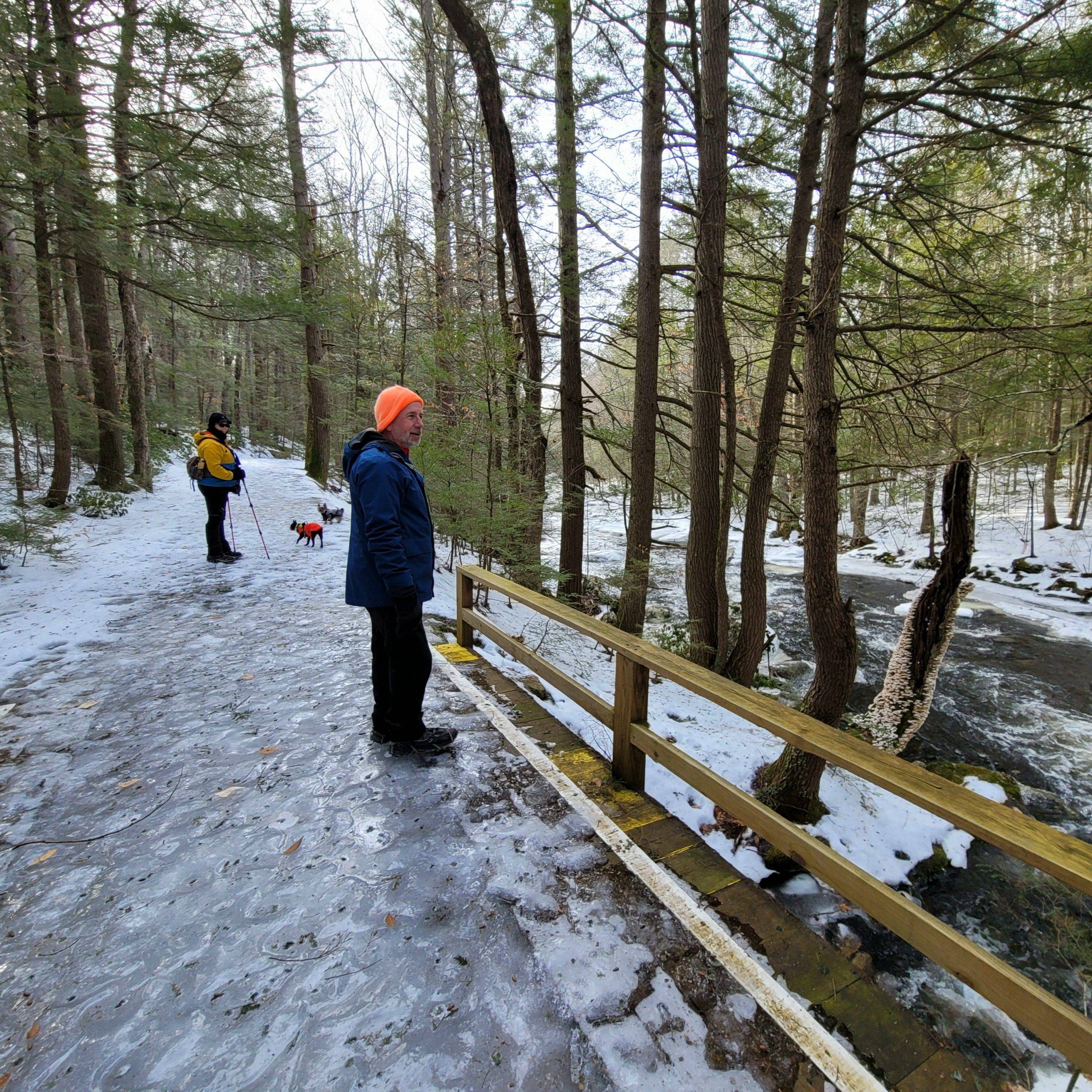 Granville State Forest on West Hartland Road offers beautiful hiking in winter! Set out on a Flash Hike before a blizzard. We hiked 2.5 miles on the Hubbard River Trail in and back, this trail is across from the parking lot and begins as paved. We saw fresh moose tracks, CCC workers stone laid bridges, the old camp sites from when the state forest was created during the Great Depression in the 1920’s. It was one of the first state forest campgrounds in 1933 and under the National Park Service. Beautiful rock formations in the river with tumbling waterfalls, endless photo opportunities and the trail is flat and enjoyable!