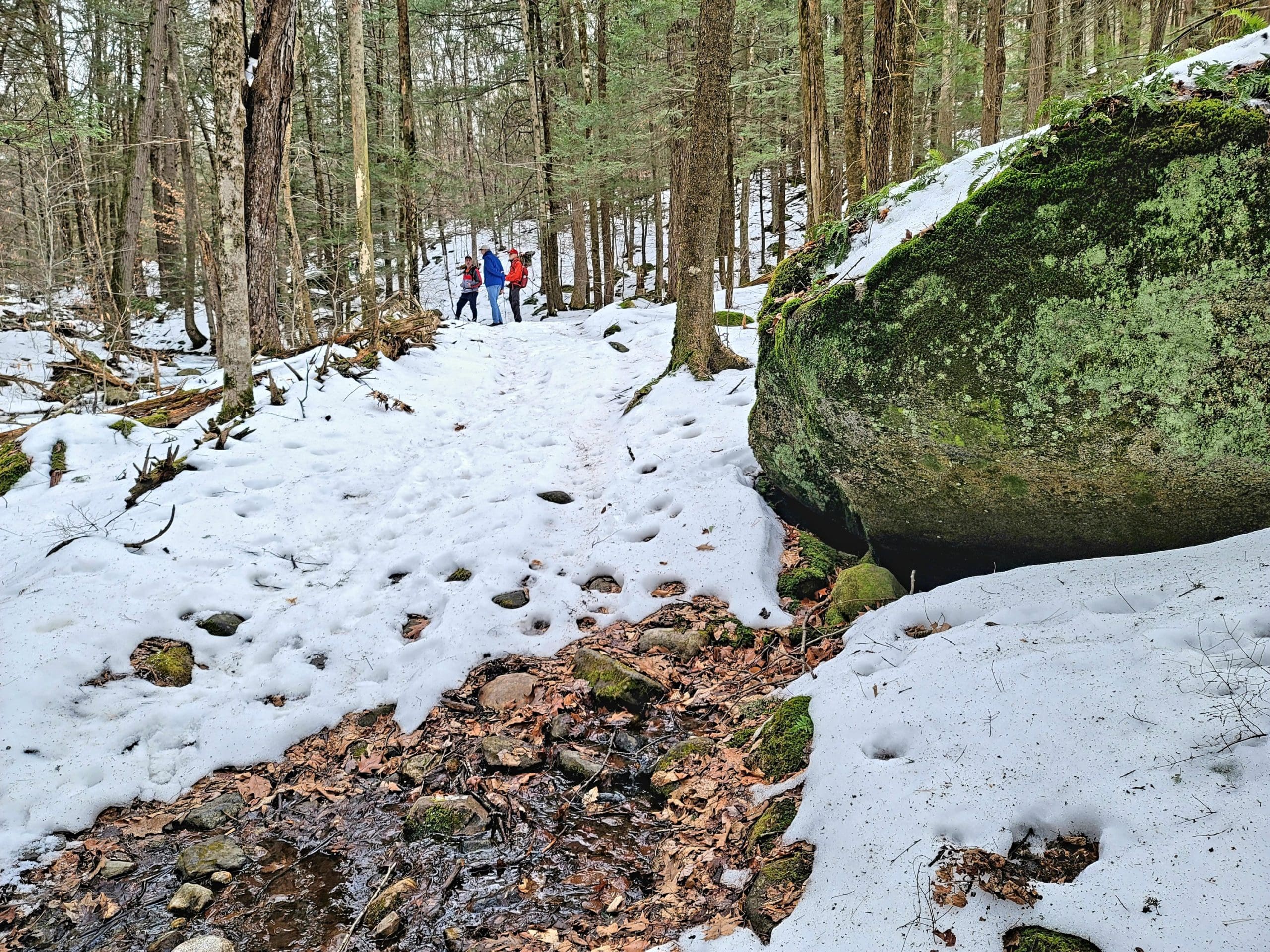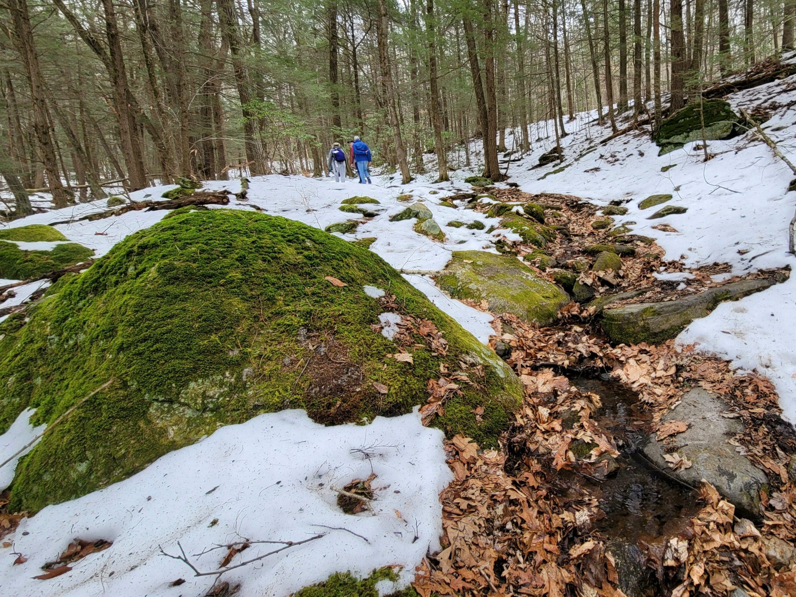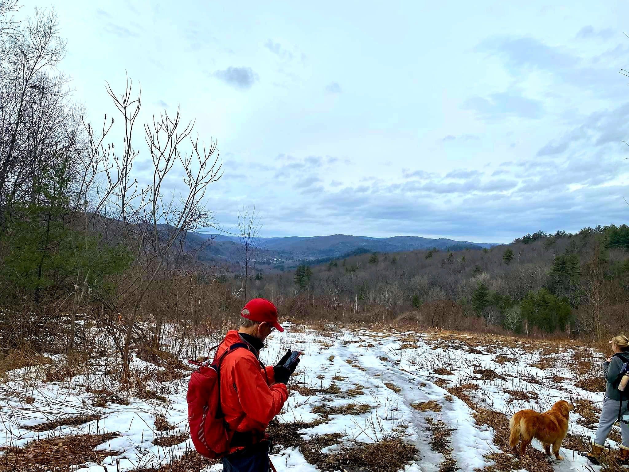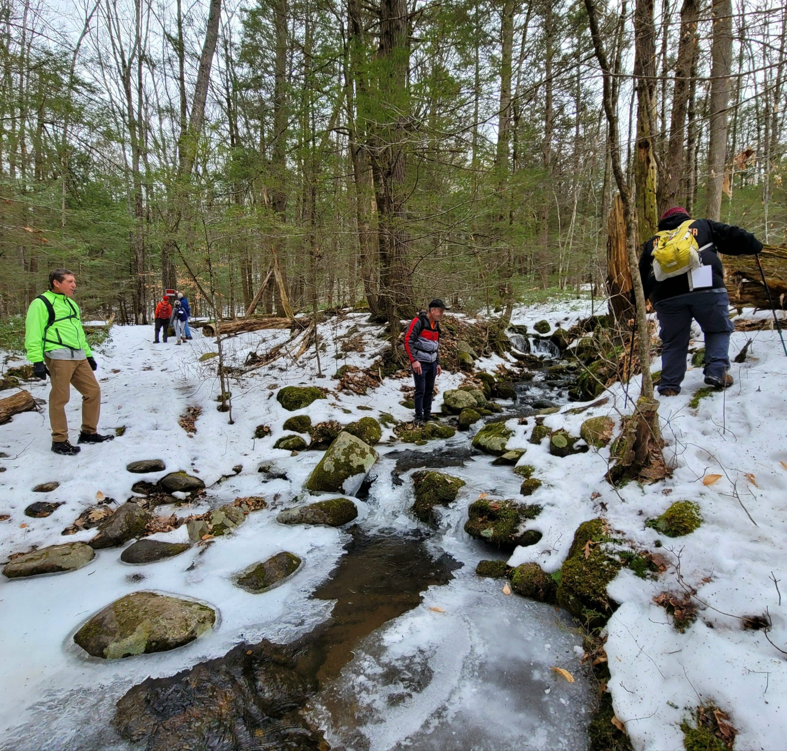 county road flash hike high up on the Montgomery hillside. This old road was once bustling with folks getting from Carrington Road to Pomeroy Road long before Russell Road was built up the mountain. The entire mountainside just east of the Shatterack ridge was used for grazing back in the 1800’s and was known as the Brant lot. Now wooded with young growth, the original 200+ year old oaks and ironwood are easy to spot. The overlook of Huntington is amazing. An old well formed meticulously by natural oval stones is the only one we have ever seen. The old road continues west to Bearden Brook, there it follows the brook both north and south. We saw amazing amounts of animal tracks.