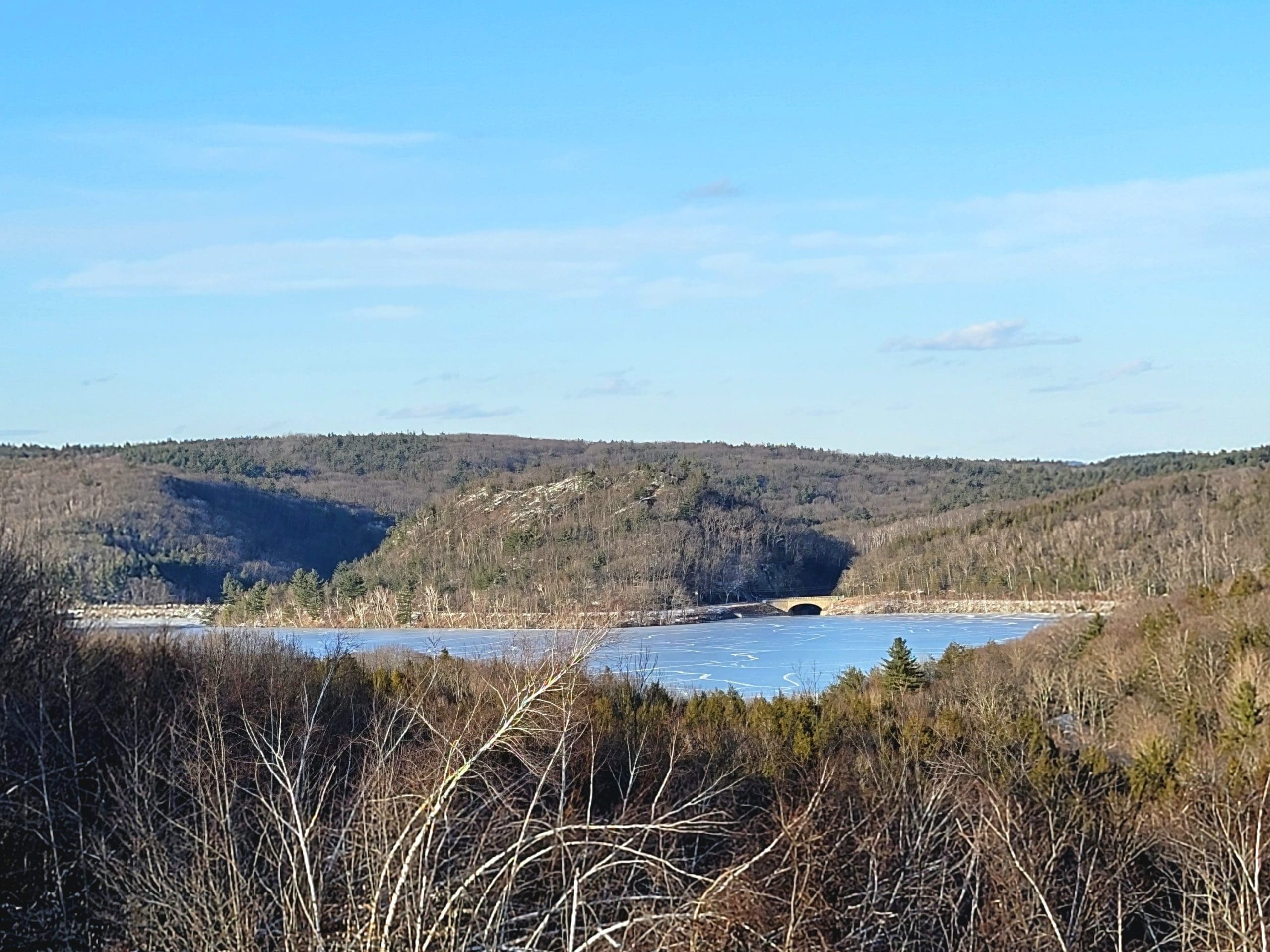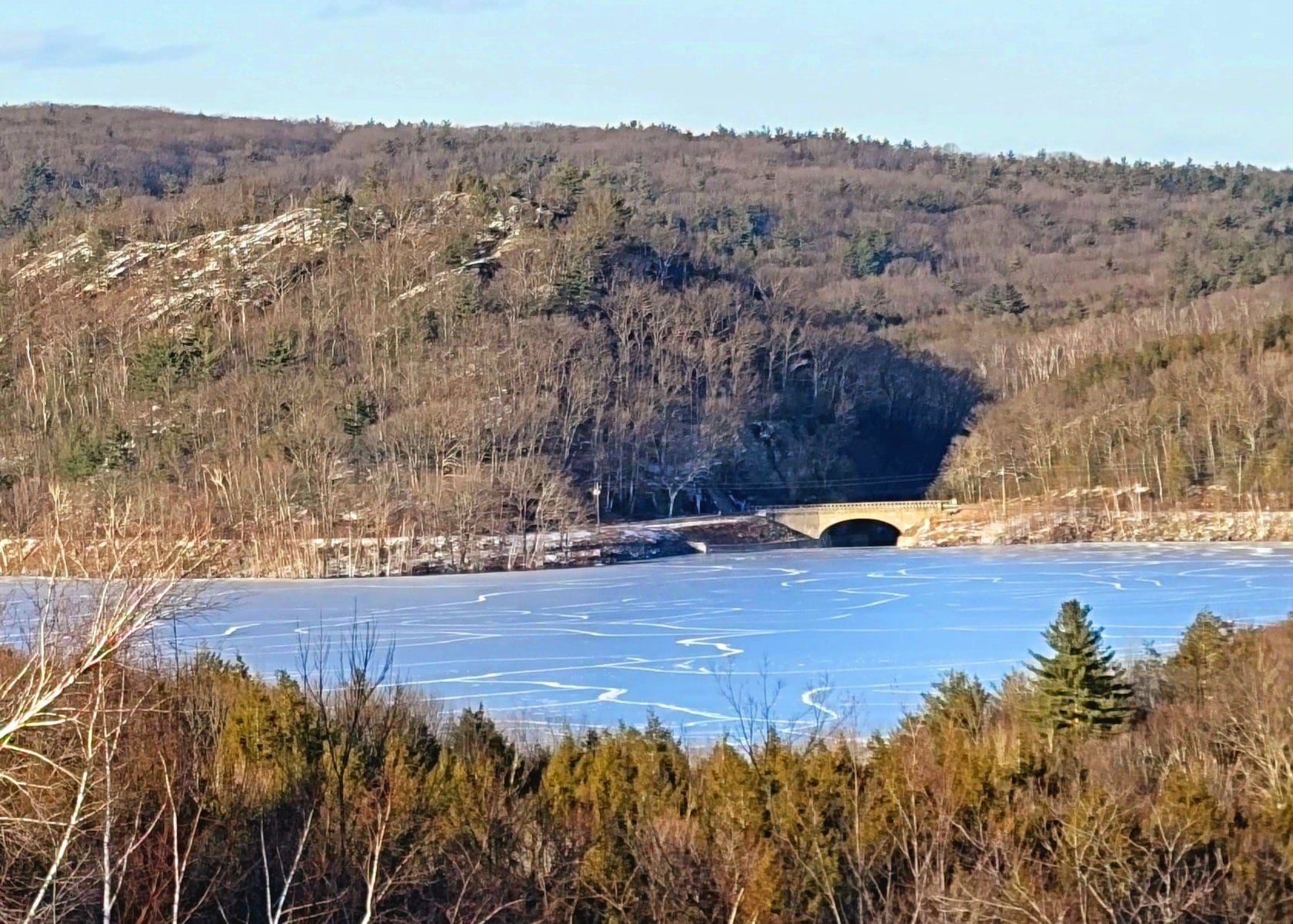 As seen from Blandford Road in Granville, the only water supply in the country with no passive recreation. Rare rock found here are calc-silicate rock, feldspar gneiss, coticule and cummingtonite schist. Notice the cobble to the left of the arch bridge, geologic formation of exposed bedrock existing high on a ridge. Other cobbles are Tyringham Cobble, Cheshire Cobble, Pine Cobble, and Bartholomew’s Cobble, and Mahanna Cobble. They are evidence of tectonic movement that shifted the land.