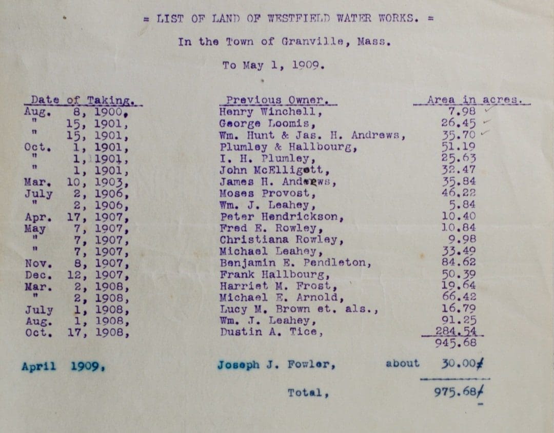 The late John M. Stevenson, of Pittsfield and Granville, was an enterprising summer resident, who was always forward looking and up to date. He felt that in a town where the supply of drinking water was not scarce, there ought to be some way of supplying its people from some adequate system, instead of every family being forced to have its own well, or other more or less inconvenient supply. He tried to get the villages of Granville and Granville Center interested in a water system, with but indifferent success. The Center was mildly interested, but Granville village was not. However, he had the courage of his convictions and purchased a small watershed situated between Regan Road and North Lane, put in a reservoir and piped the water to his own house at the Center, as well as to a few other houses. He organized a small corporation, the Granville Water Company, to operate the system, so that Granville, as well as other larger places, has its own water works. After the death of Mr. Stevenson, certain shares of the capital stock of the Water Company came to his daughter, Mrs. Merle D. Graves. Later she offered them to the Town upon certain terms, and at the annual meeting of the Town on February 14, 1921, it was voted to accept the shares so offered by Mrs. Graves.