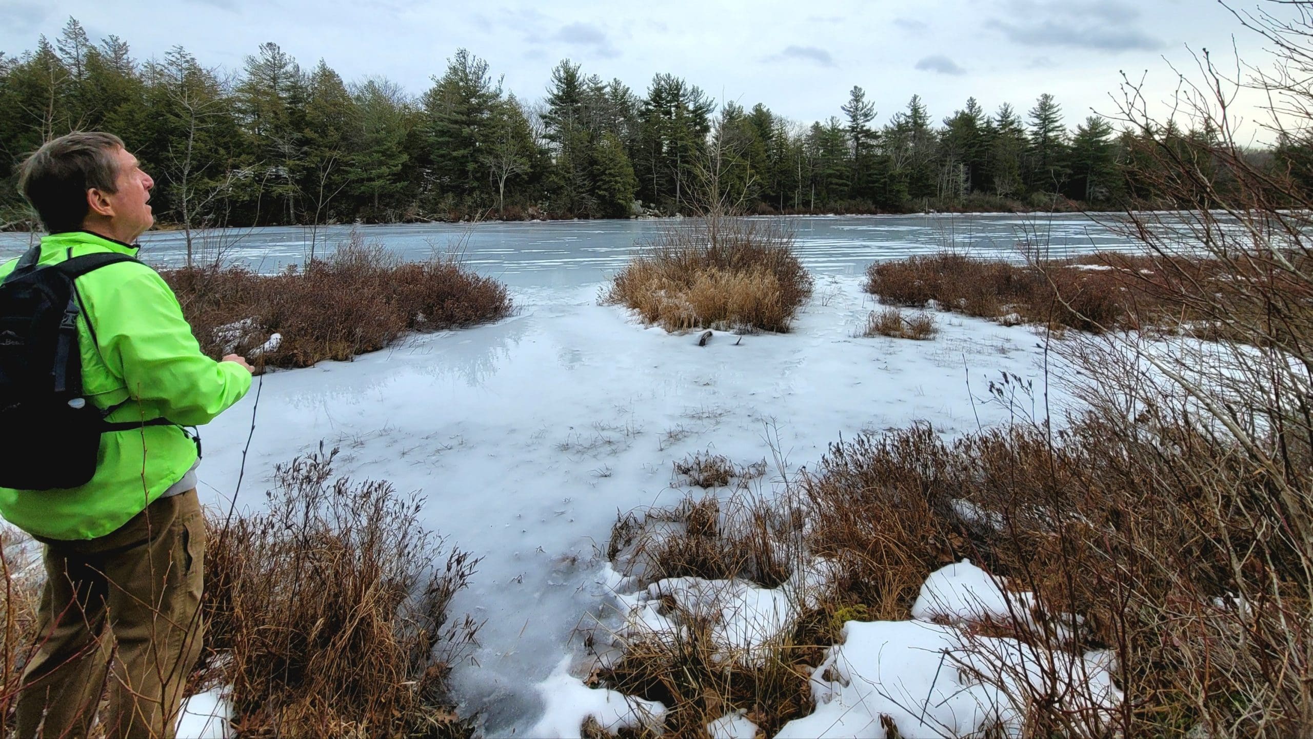 A Friday Flash Hike ended at Shatterack Pond in Montgomery thanks to one of our members giving us a tour of his private property. This high elevation pond has unique birds and a rocky swampy shore. Beautiful and Peaceful. Holyoke watershed lies to the West and old roads connect to Main Road. Upper Pomeroy and the County Road were the only roads for the settlers on this mountain.