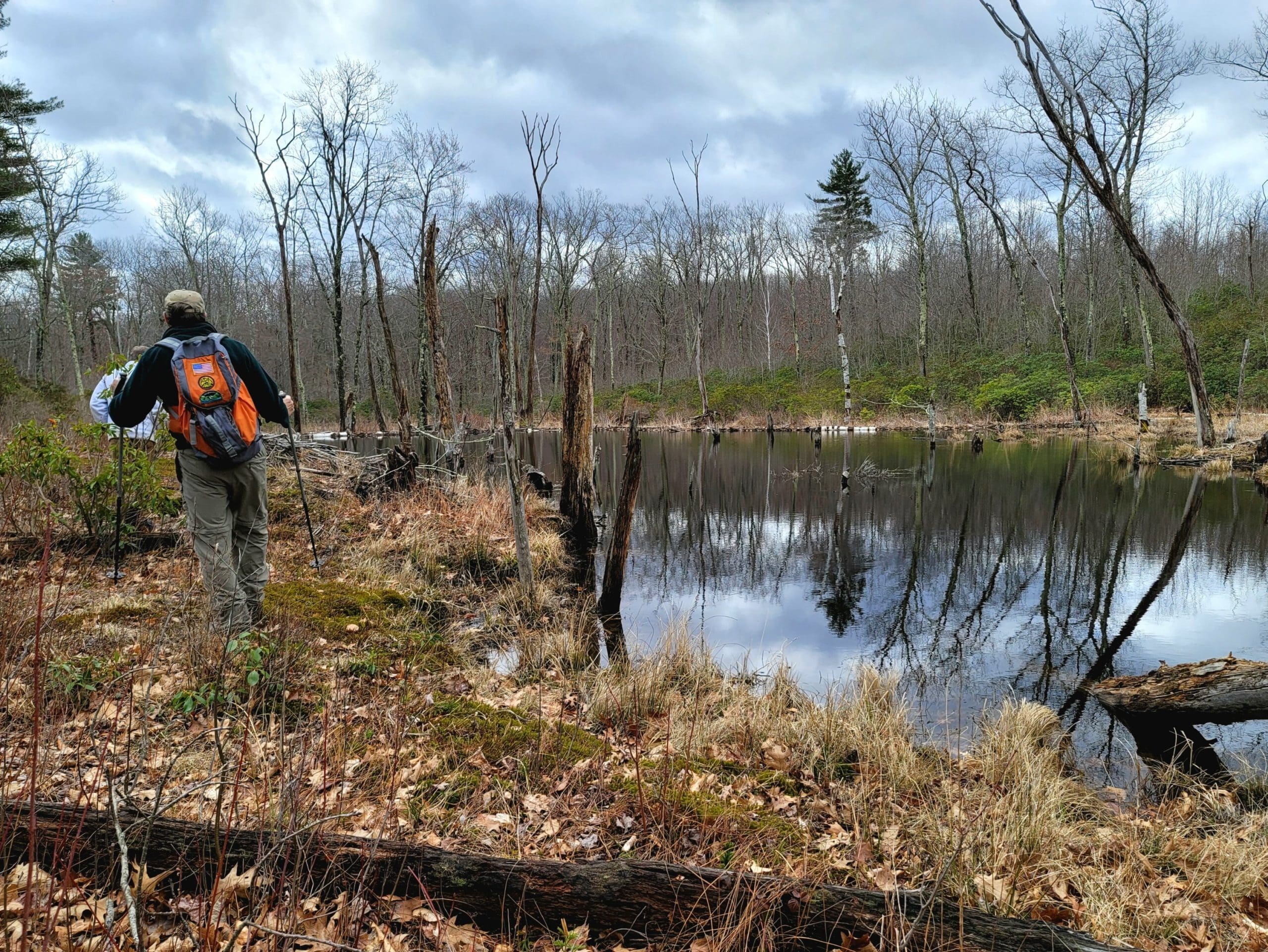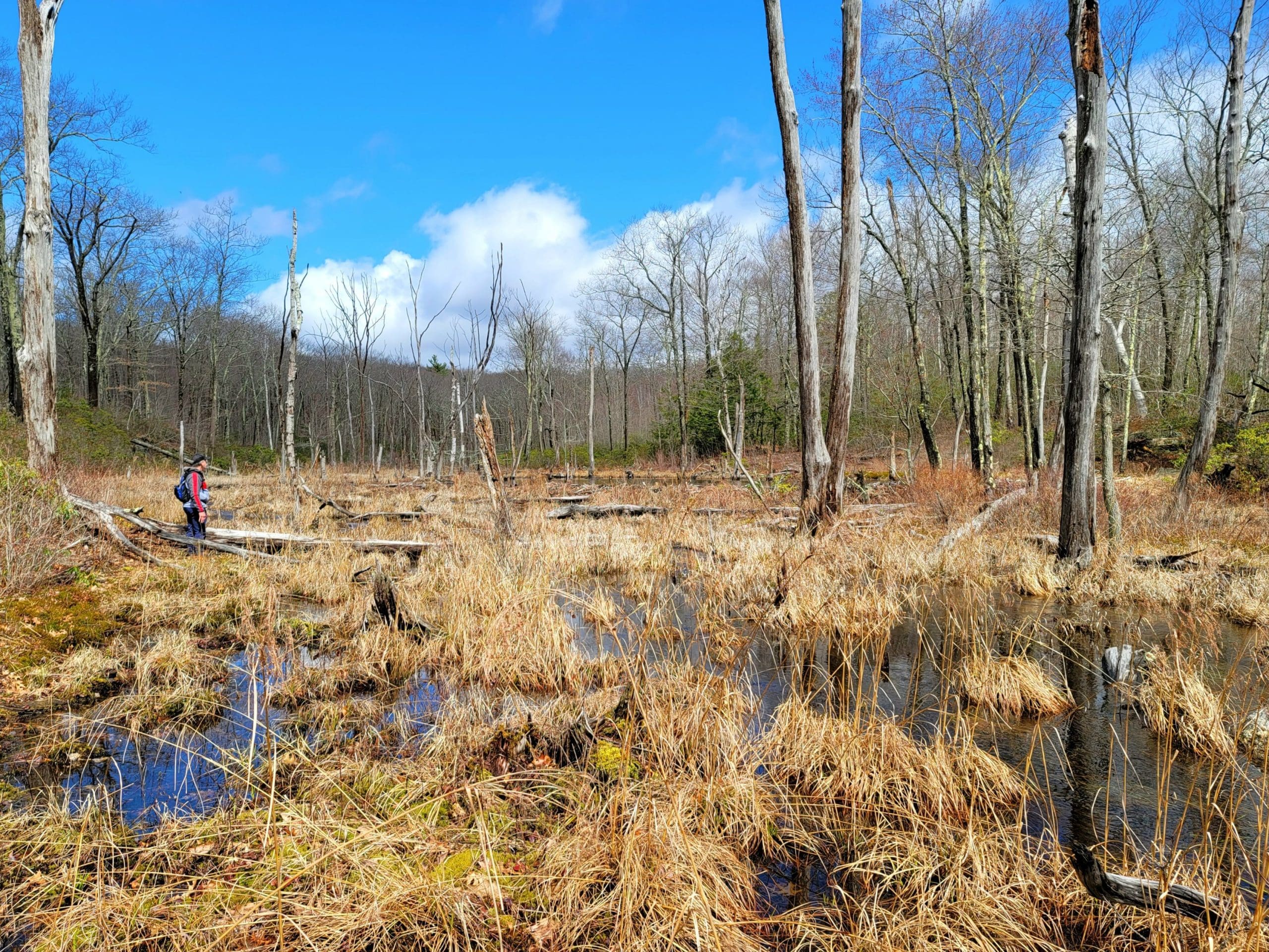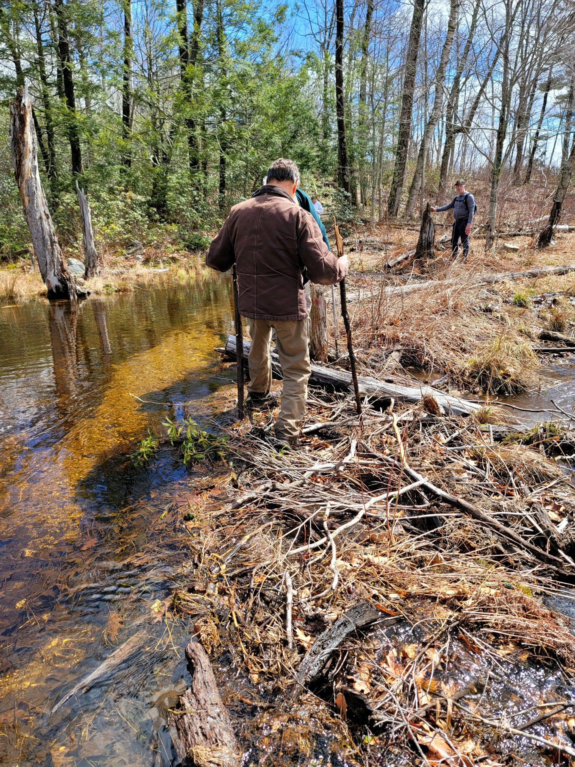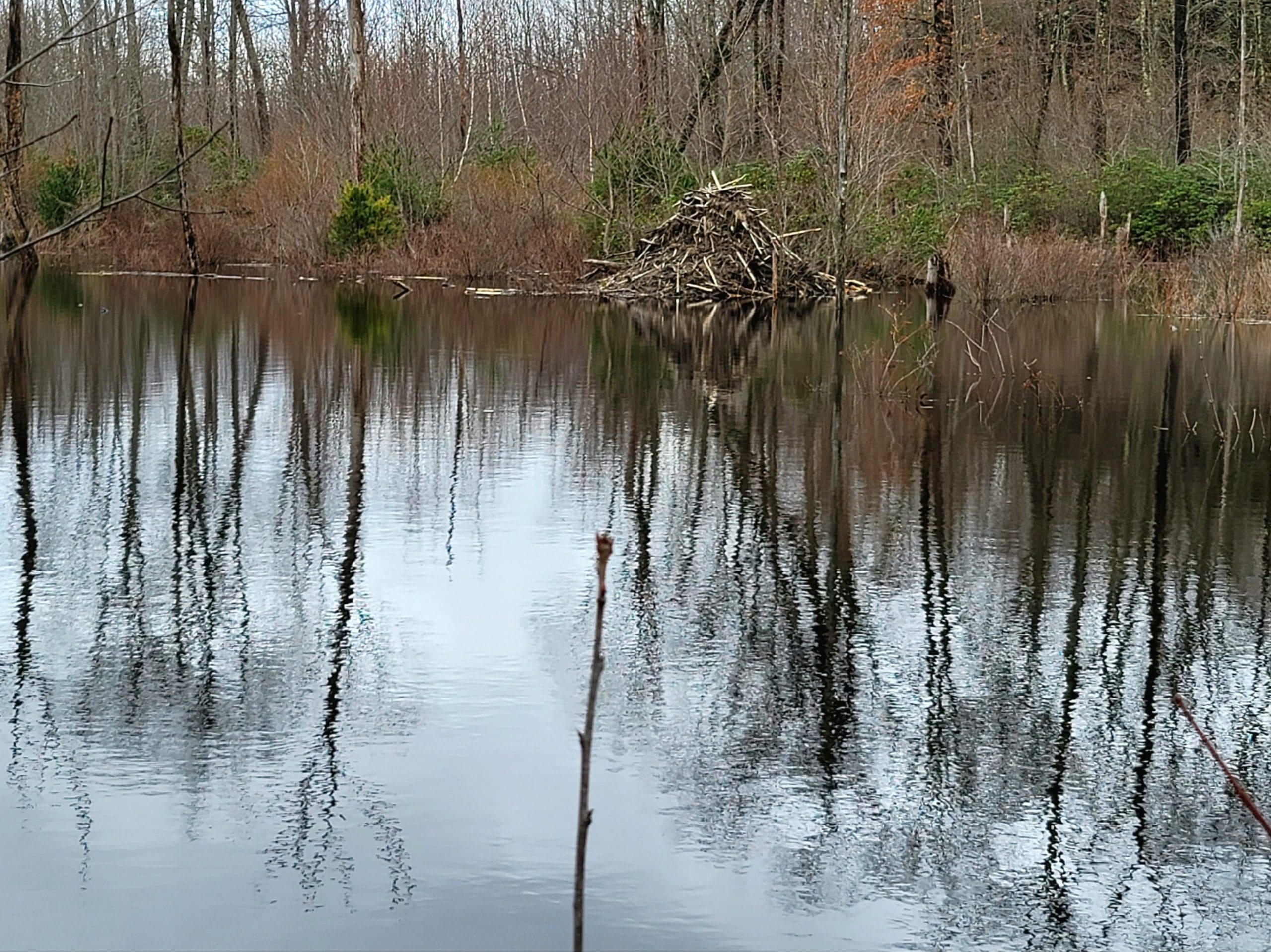 We had the pleasure of naturalist Mr. Ray Asselin joining us at our Flash Hike Friday five-miler to narrate our tour of the Tekoa Beaver Pond in Montgomery and the newly flooded and formed second beaver pond there as well. Starting at the gate at the corner of Tekoa and Mountain House Road we went in past the Westfield Reservoir and viewed the newly flooded pond on the right, this is also the trail to the English Grass Cave, we did find one sign but looks like the beavers have taken it over! Ray described the family structure of beavers, only one pair in the lodge with young, the “corn on the cob” style of bark eating of branches. Food sources are the greens under water and around the edges of the water as well as pretty much all bark. This pond now has three tiered dams as we could see. The water was also full of eggs, including the spotted salamander as they grow in the jelly sack until they mature and walk out. On to the main Tekoa Beaver Pond, very full with the rains. The trail here is also flooded so we ventured across the top of the dam, which was much more difficult than last week! We toured completely around this pond following its edges observing beaver activity, moose scat and birds. Most interesting was a beaver lodge built low on the bank as this is how they provide initial shelter from predators when building a new lodge.