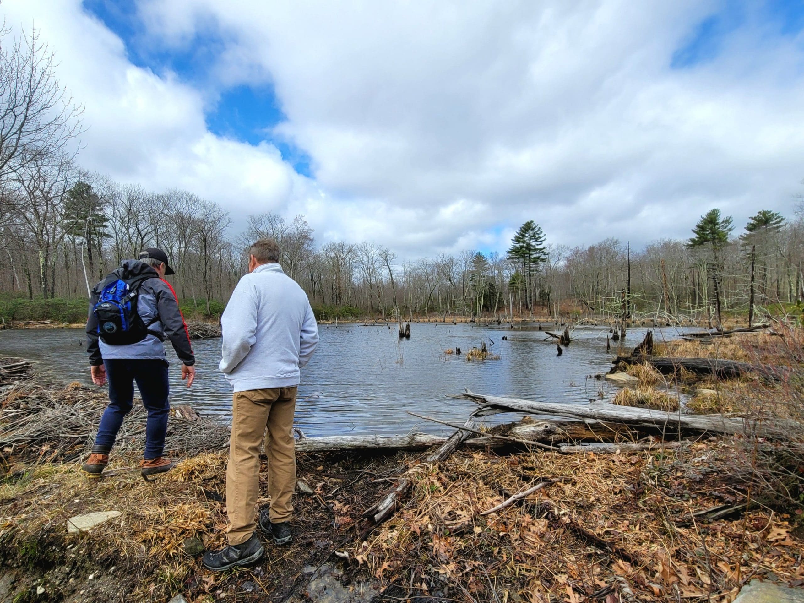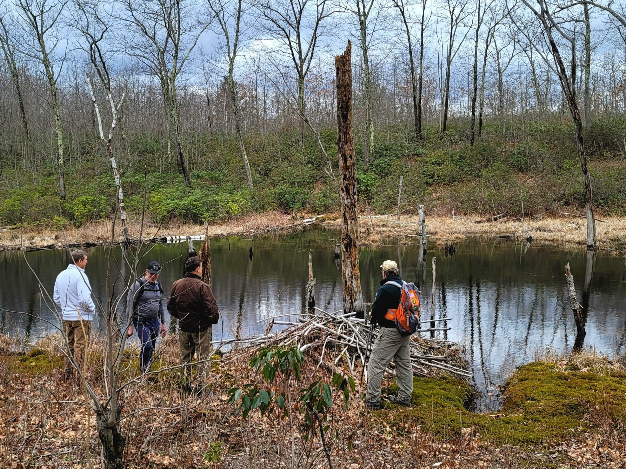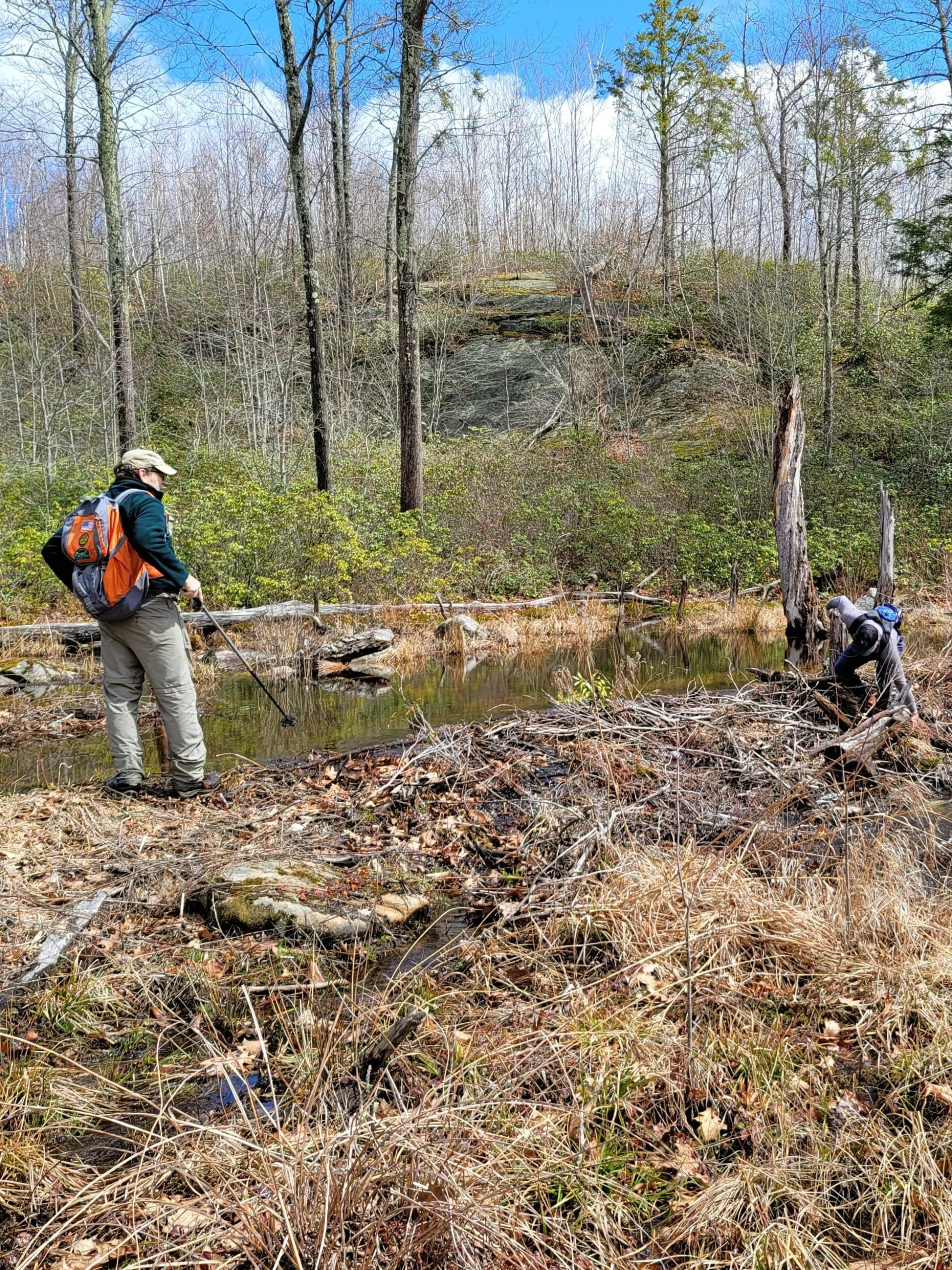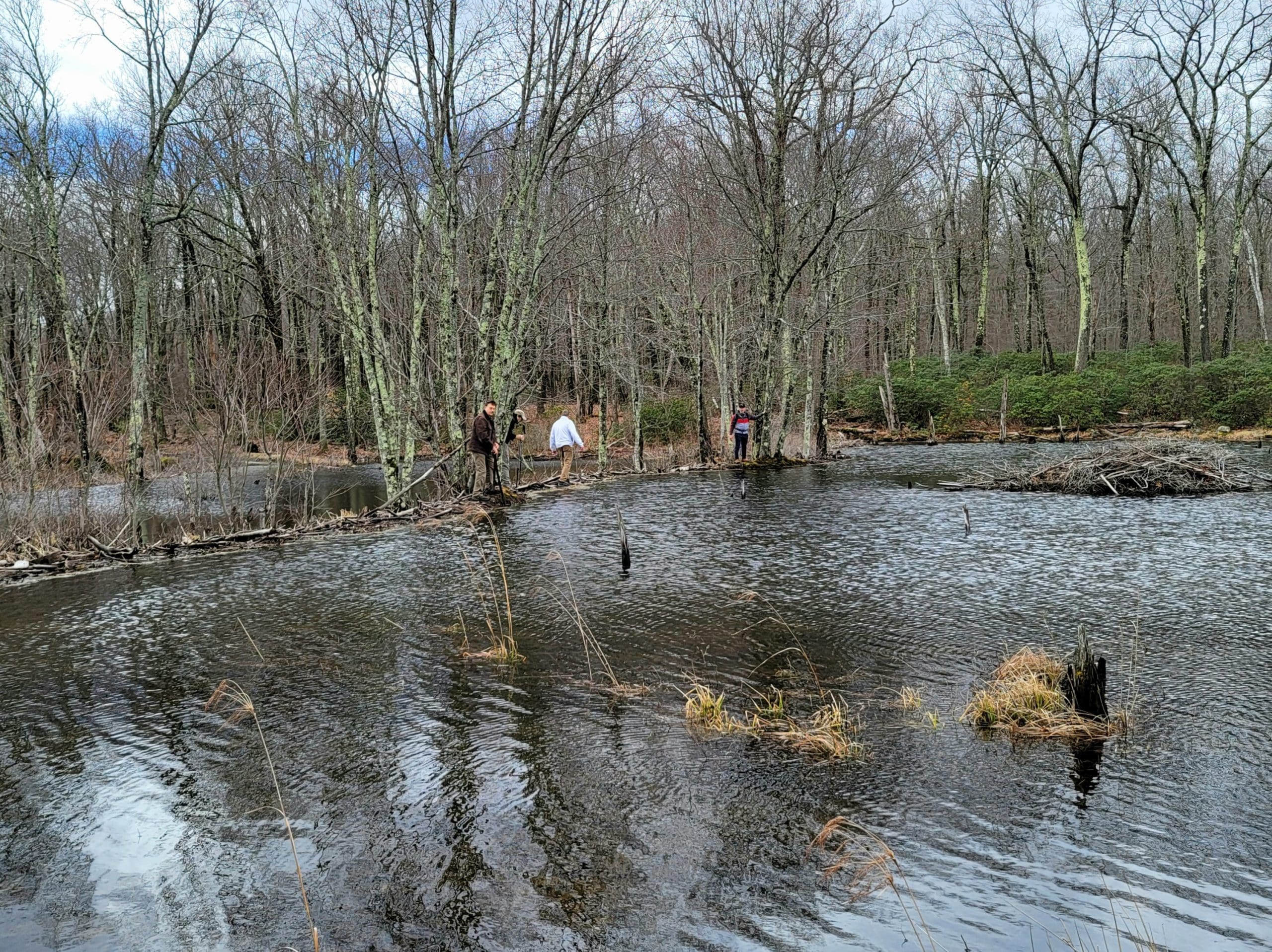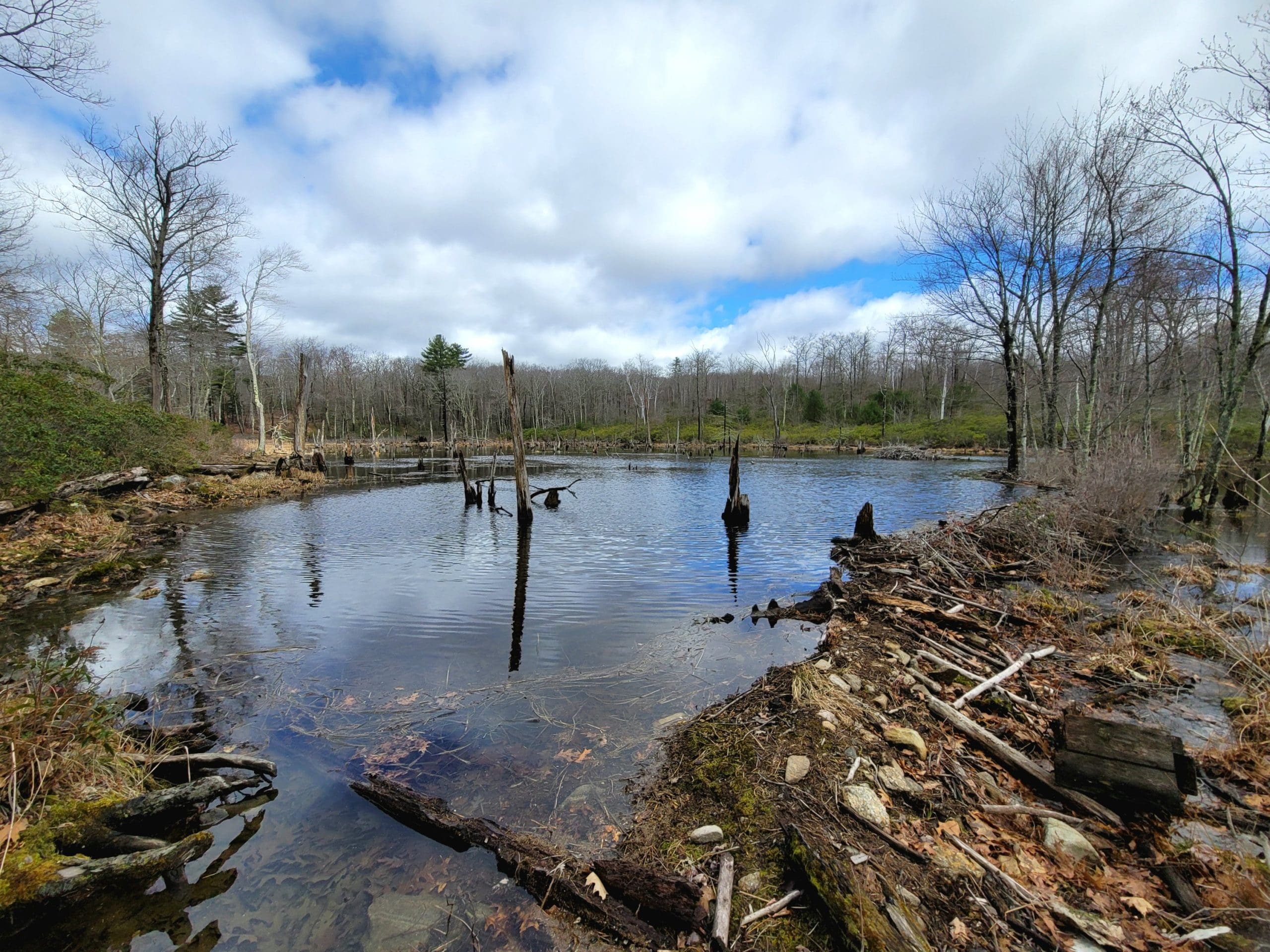 We had the pleasure of naturalist Mr. Ray Asselin joining us at our Flash Hike Friday five-miler to narrate our tour of the Tekoa Beaver Pond in Montgomery and the newly flooded and formed second beaver pond there as well. Starting at the gate at the corner of Tekoa and Mountain House Road we went in past the Westfield Reservoir and viewed the newly flooded pond on the right, this is also the trail to the English Grass Cave, we did find one sign but looks like the beavers have taken it over! Ray described the family structure of beavers, only one pair in the lodge with young, the “corn on the cob” style of bark eating of branches. Food sources are the greens under water and around the edges of the water as well as pretty much all bark. This pond now has three tiered dams as we could see. The water was also full of eggs, including the spotted salamander as they grow in the jelly sack until they mature and walk out. On to the main Tekoa Beaver Pond, very full with the rains. The trail here is also flooded so we ventured across the top of the dam, which was much more difficult than last week! We toured completely around this pond following its edges observing beaver activity, moose scat and birds. Most interesting was a beaver lodge built low on the bank as this is how they provide initial shelter from predators when building a new lodge.
