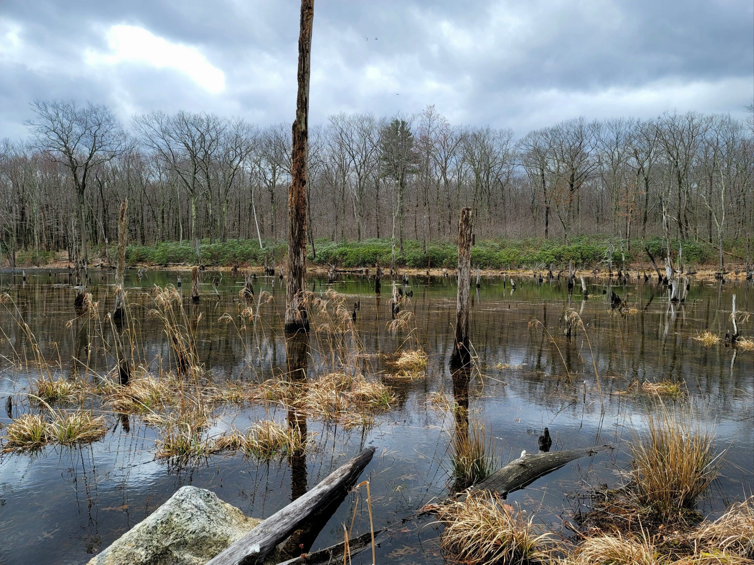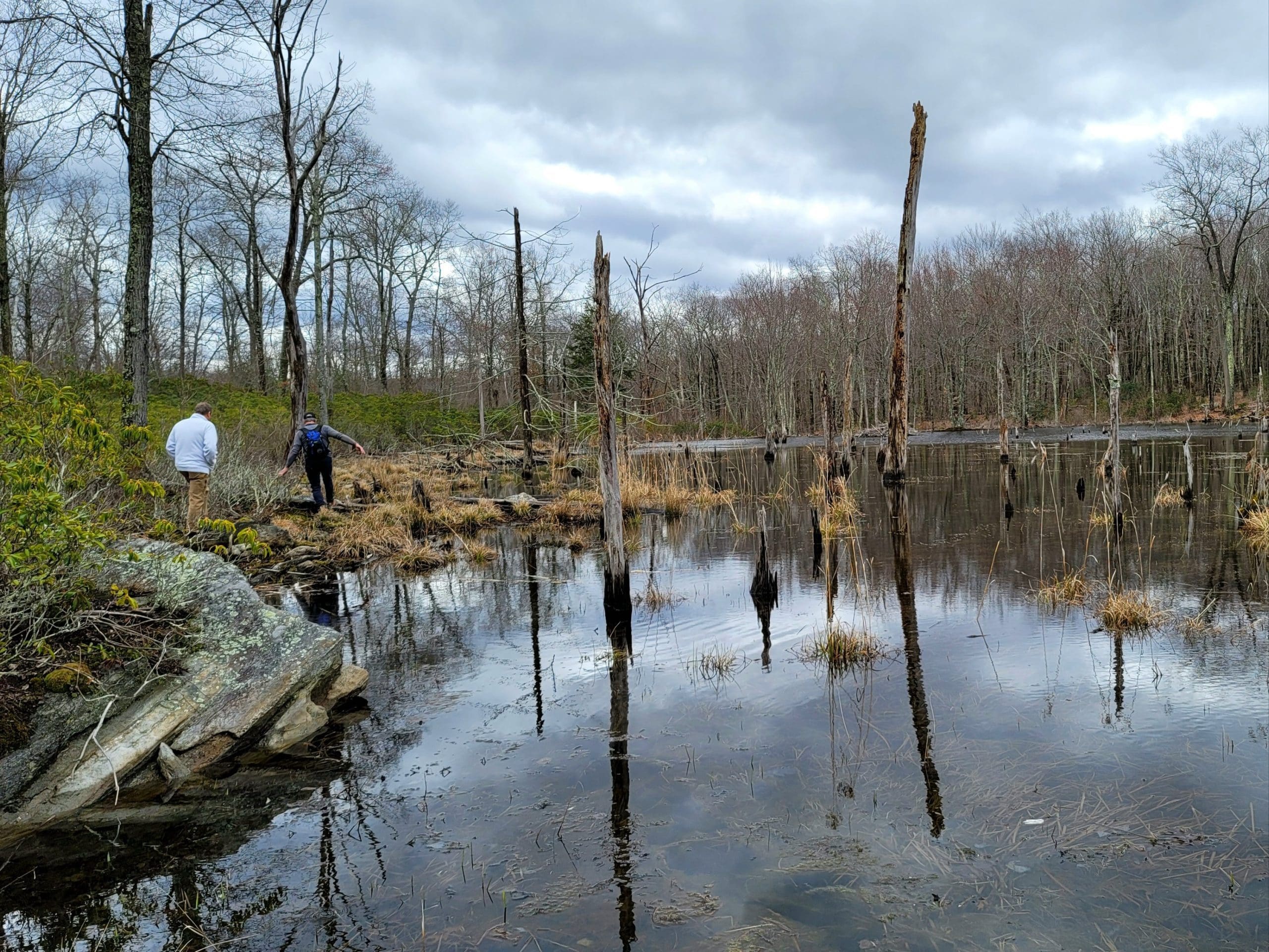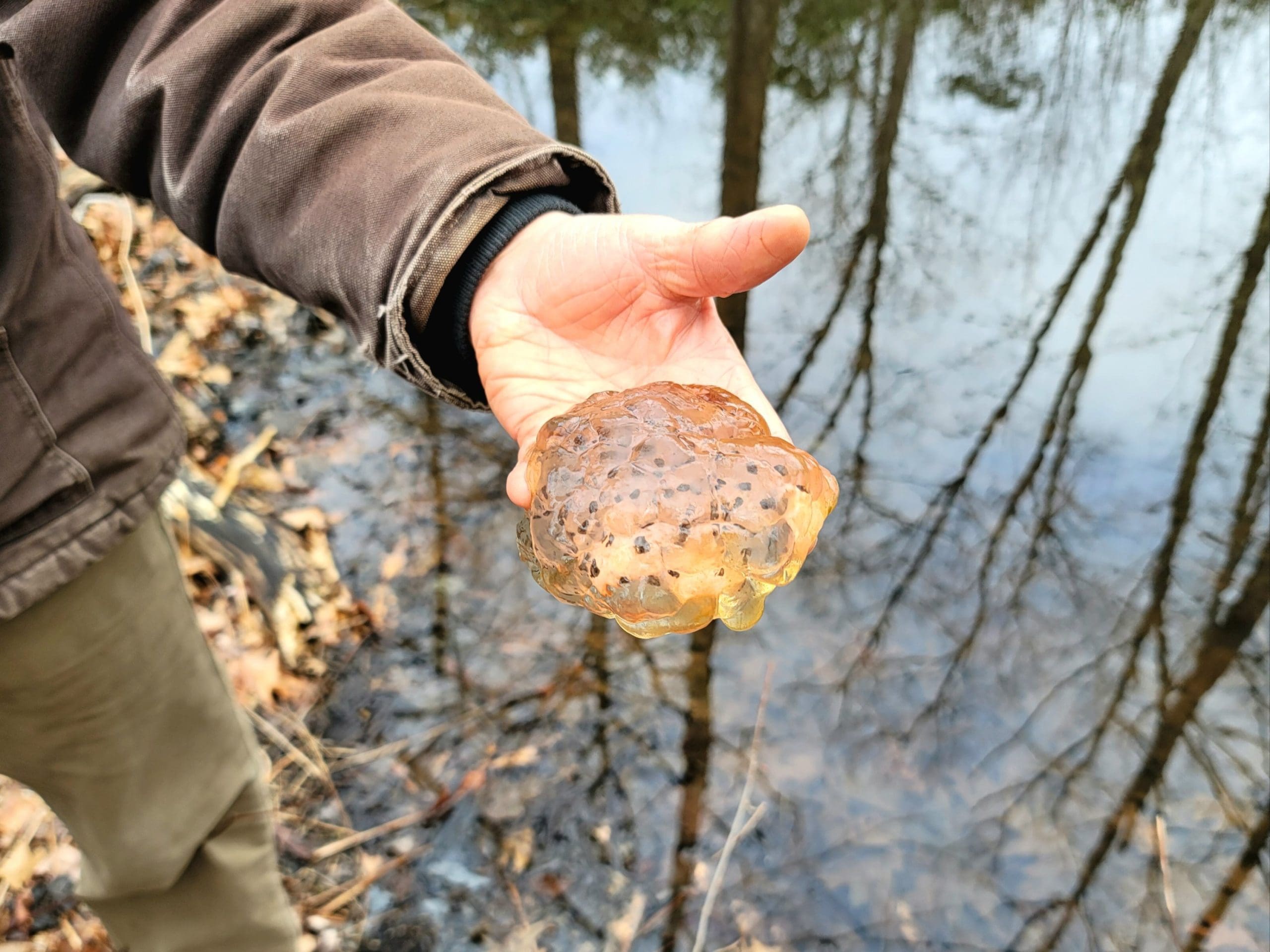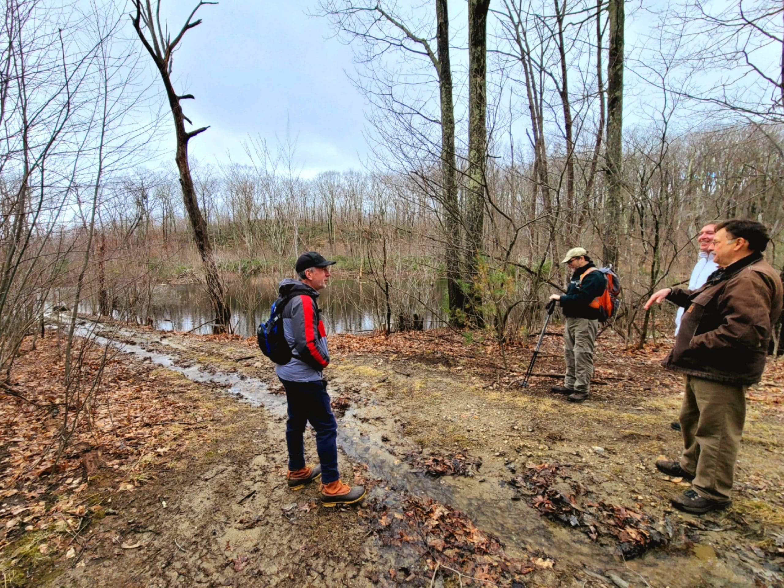 We had the pleasure of naturalist Mr. Ray Asselin joining us at our Flash Hike Friday five-miler to narrate our tour of the Tekoa Beaver Pond in Montgomery and the newly flooded and formed second beaver pond there as well. Starting at the gate at the corner of Tekoa and Mountain House Road we went in past the Westfield Reservoir and viewed the newly flooded pond on the right, this is also the trail to the English Grass Cave, we did find one sign but looks like the beavers have taken it over! Ray described the family structure of beavers, only one pair in the lodge with young, the “corn on the cob” style of bark eating of branches. Food sources are the greens under water and around the edges of the water as well as pretty much all bark. This pond now has three tiered dams as we could see. The water was also full of eggs, including the spotted salamander as they grow in the jelly sack until they mature and walk out. On to the main Tekoa Beaver Pond, very full with the rains. The trail here is also flooded so we ventured across the top of the dam, which was much more difficult than last week! We toured completely around this pond following its edges observing beaver activity, moose scat and birds. Most interesting was a beaver lodge built low on the bank as this is how they provide initial shelter from predators when building a new lodge.