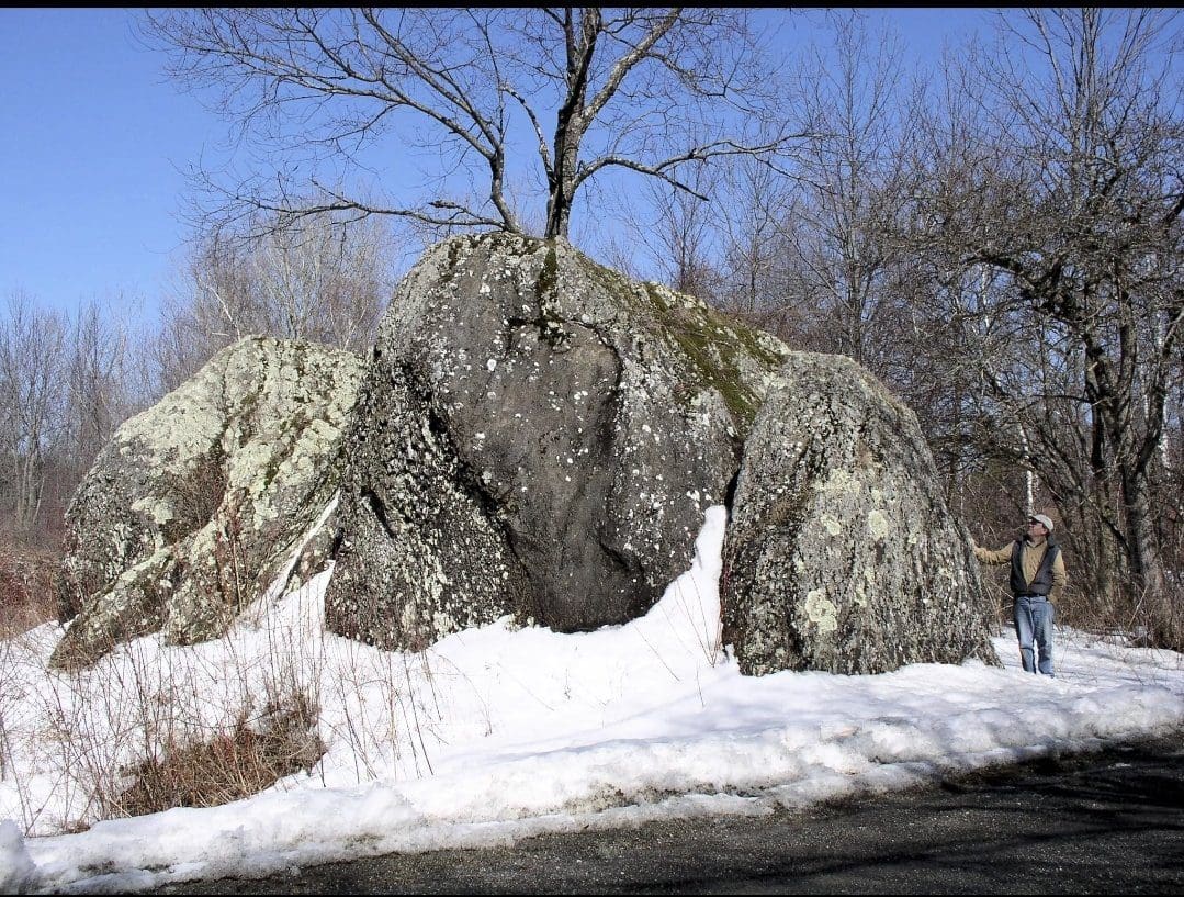 Then and Now by Gary Leveille Sept 21, 2007. The Berkshire Record Beartown school, also known as the “Rock school,” was arguably the most remote schoolhouse in Monterey. It was located next to a giant glacial erratic along Beartown Mountain Road, about 4 miles from the intersection with Tyringham Road. Although the small school is long gone, the scholarly stone still sits on the northeast side of the road near the old Ariail house (now owned by the Coburn family). The Rock school illustration shown above (courtesy of the Berkshire Historical Society) was drawn by Marshall “Blue” Bidwell, Jr. in 1861. According to the Bidwell House Museum records, Blue Bidwell got his nickname because the medication he was taking for a nervous disorder turned his face blue.