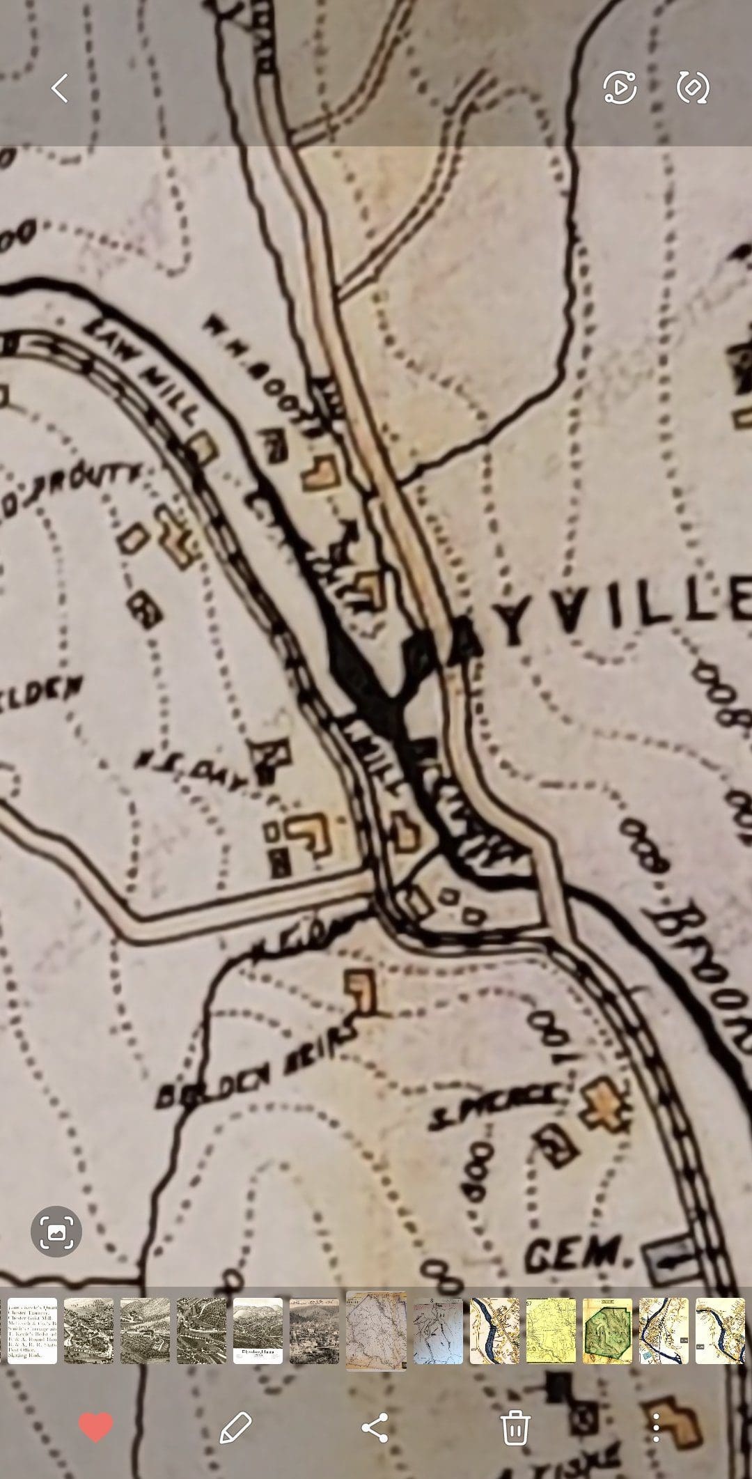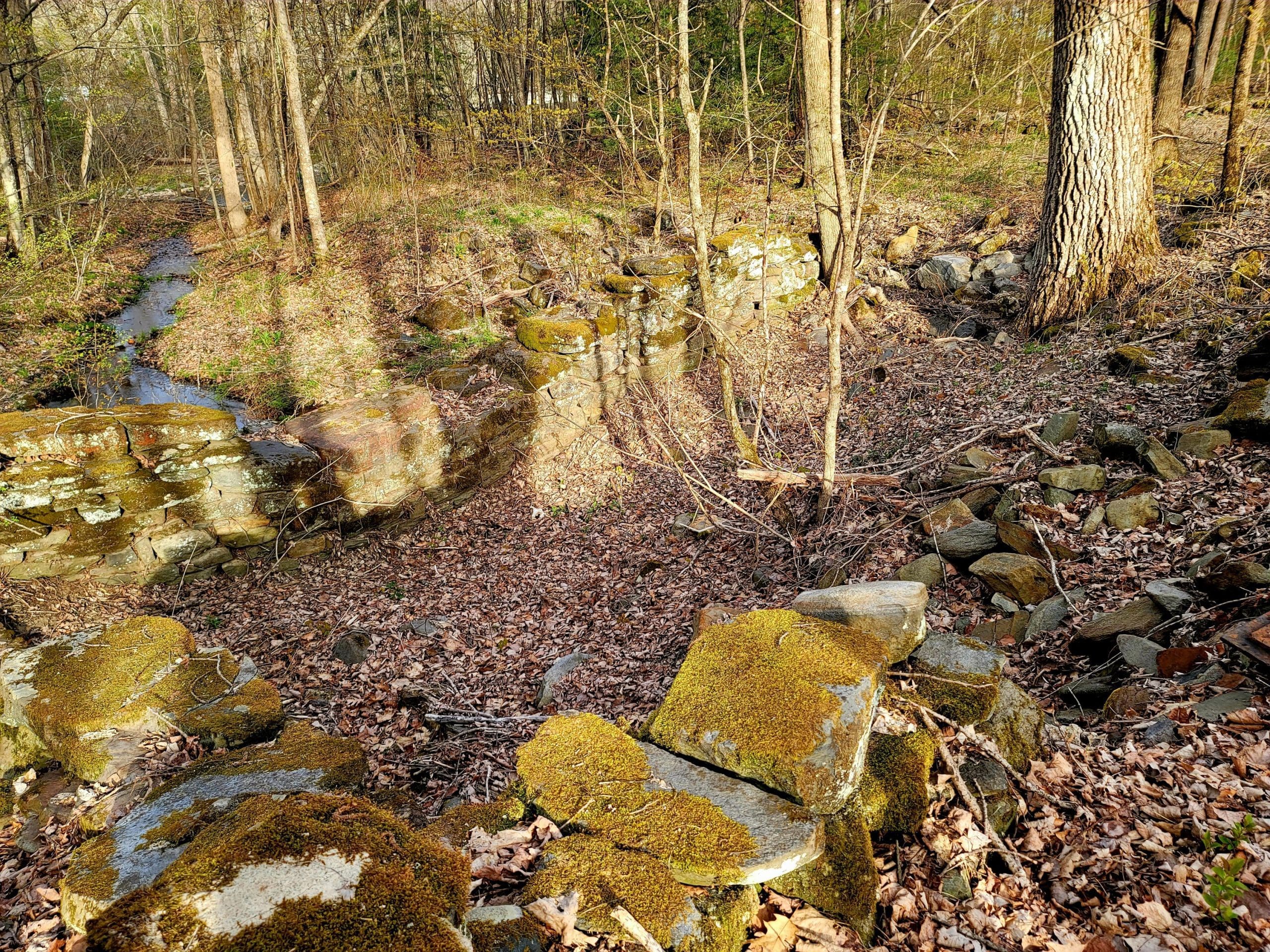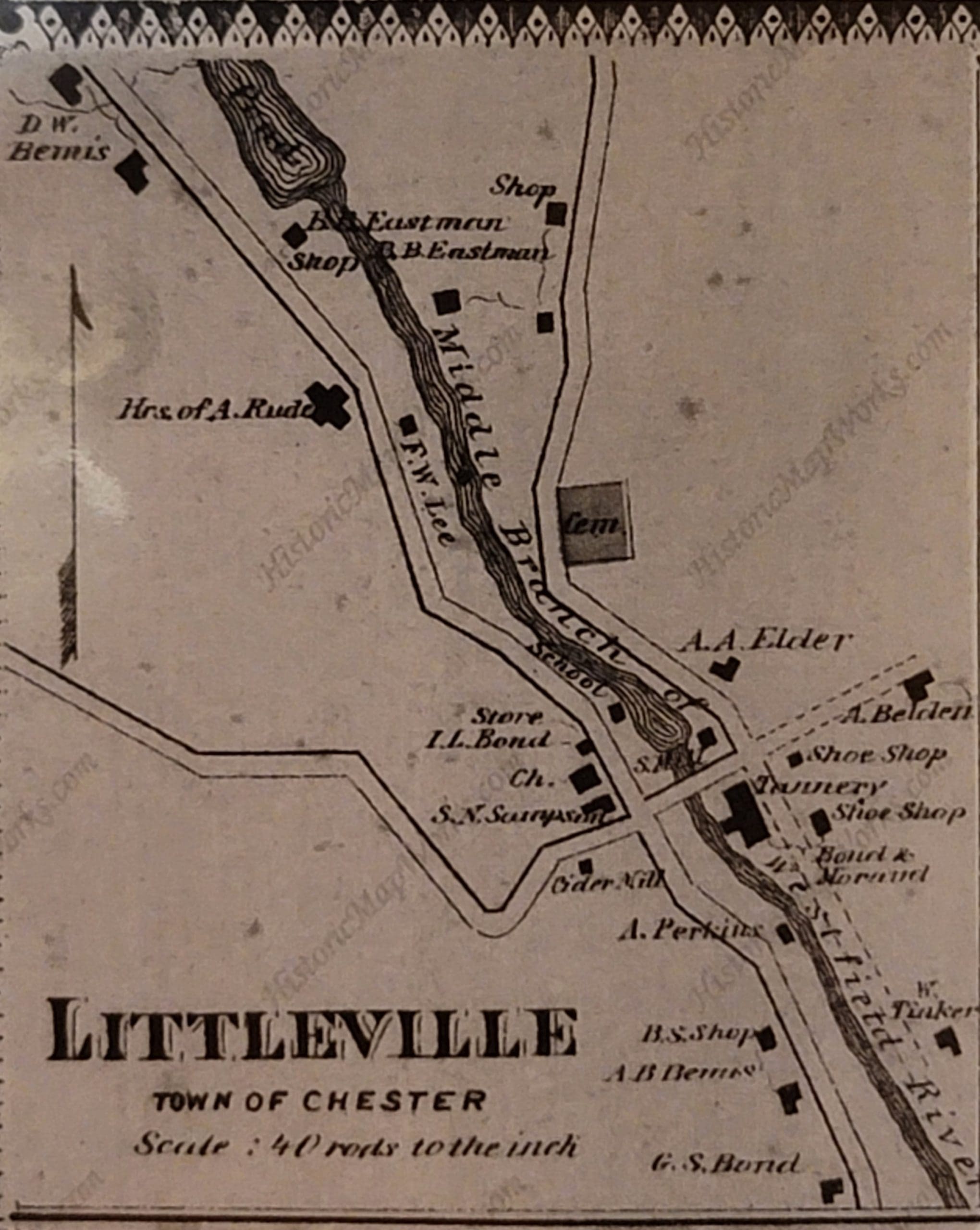 Here is the shoe peg and bedstead facory, you can see the walls off the dam to harness the power of the West Branch. The third manufacturing business to be established in North Chester was a bedstead factory and dam upstream of the Cook cotton mills. Noted on a map of 1855 as a sawmill and linseed mill, it was owned by Elbridge Howe, who manufactured hardwood bedsteads at the site for several decades and ran a sawmill as well. The 1870 atlas indicates the property was in the Howe estate. The New England Business Directory of 1860 lists Howard Cooley in North Chester as a tanner and currier, but the location of his operations is not known.-historic North Chester