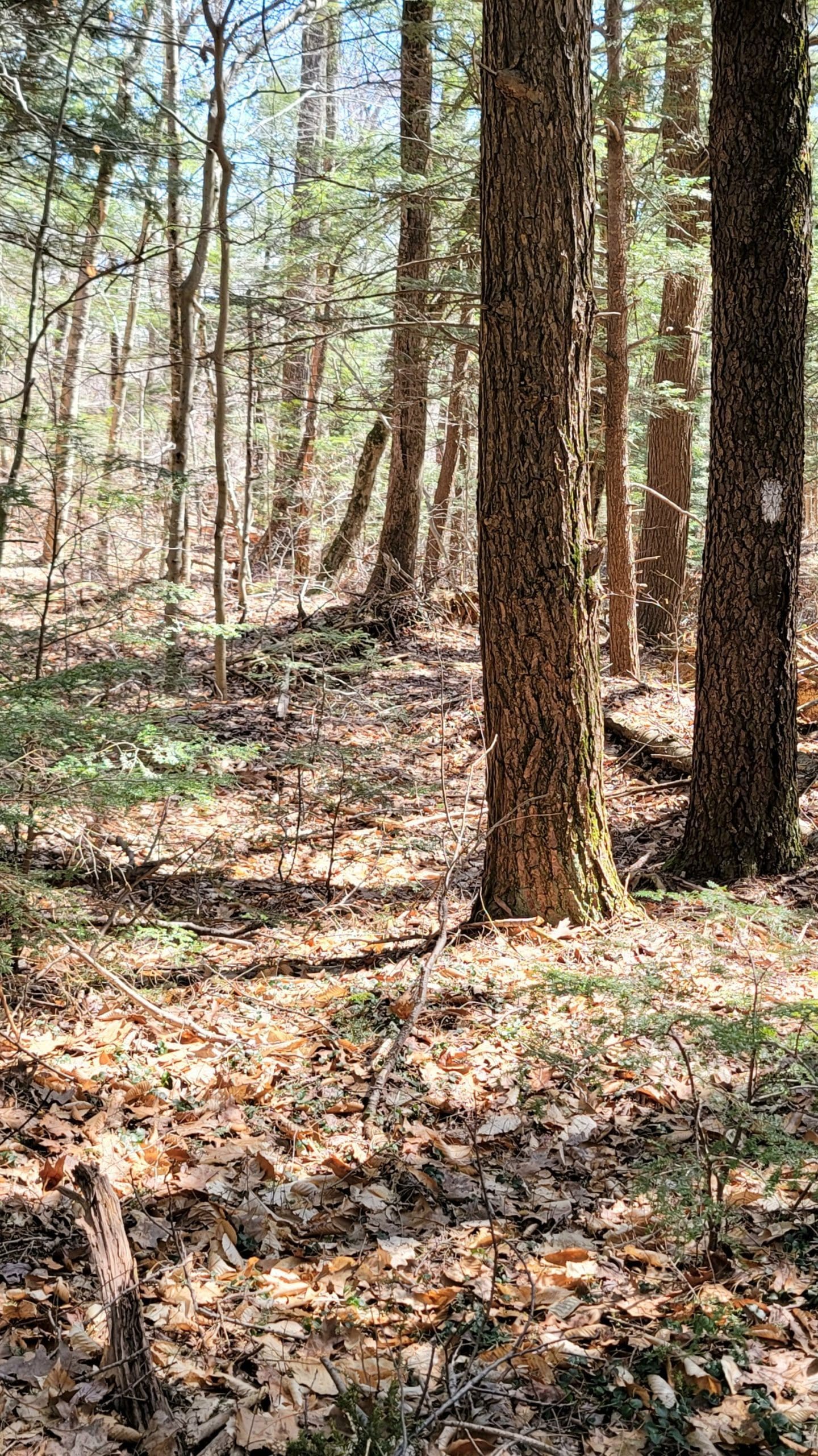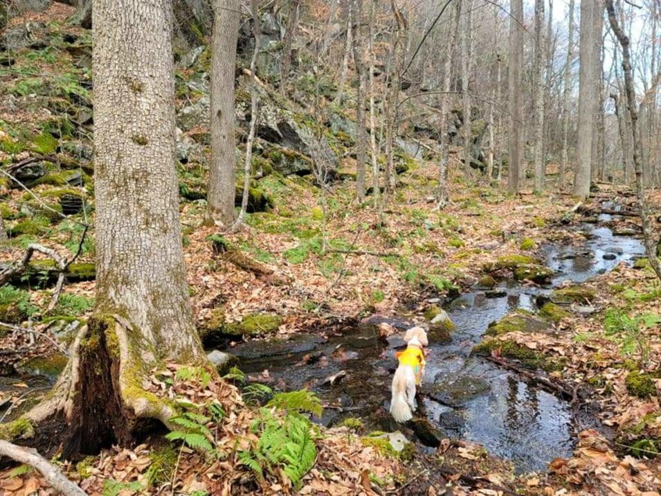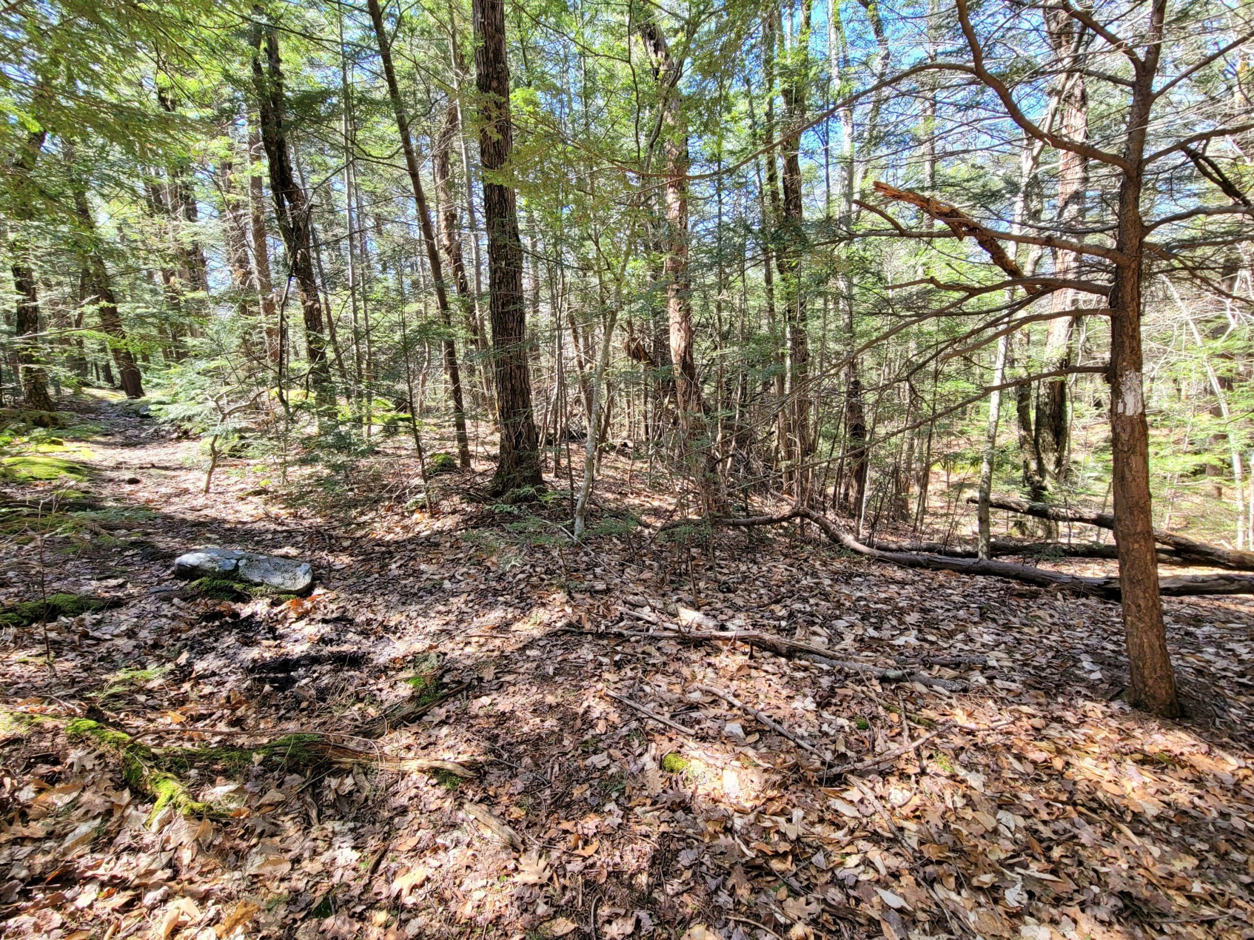 Section #5 of Unkamit’s Path (white dot blazed) travels across Chester and Blandford over the highest rocky peaks and the most memorable cellar holes, streams, natural and unique rock formations, and waterfalls, crossing the upper Sanderson Brook, over the top of Goldmine Falls and crosses Goldmine Brook on to Blandford. Highlands Footpath is officially blazing this trail, however it has been grass roots, all volunteer maintaned since the 1960’s when Henry Warchol and John Murphy blazed it with white oil paint and colored yarn.