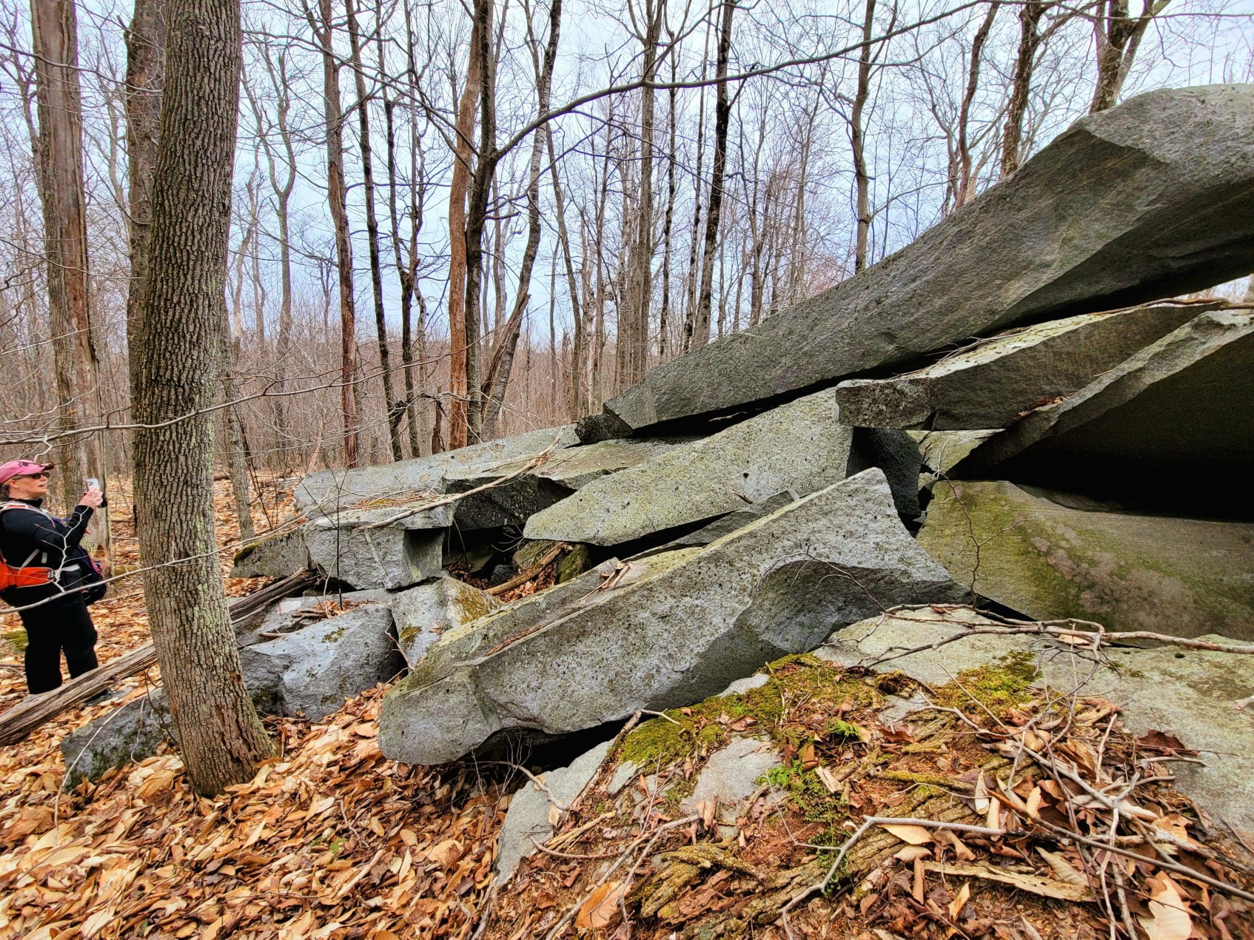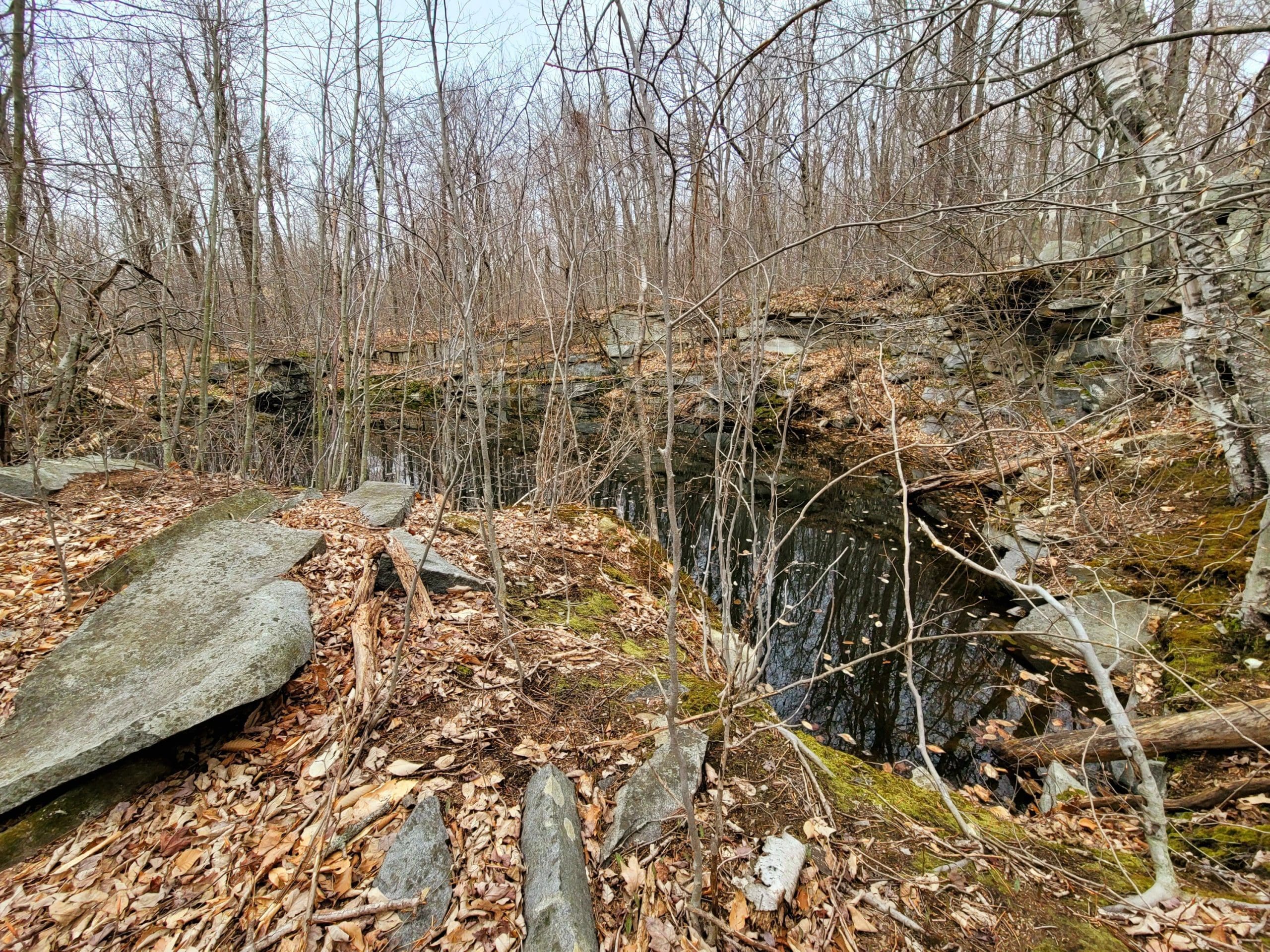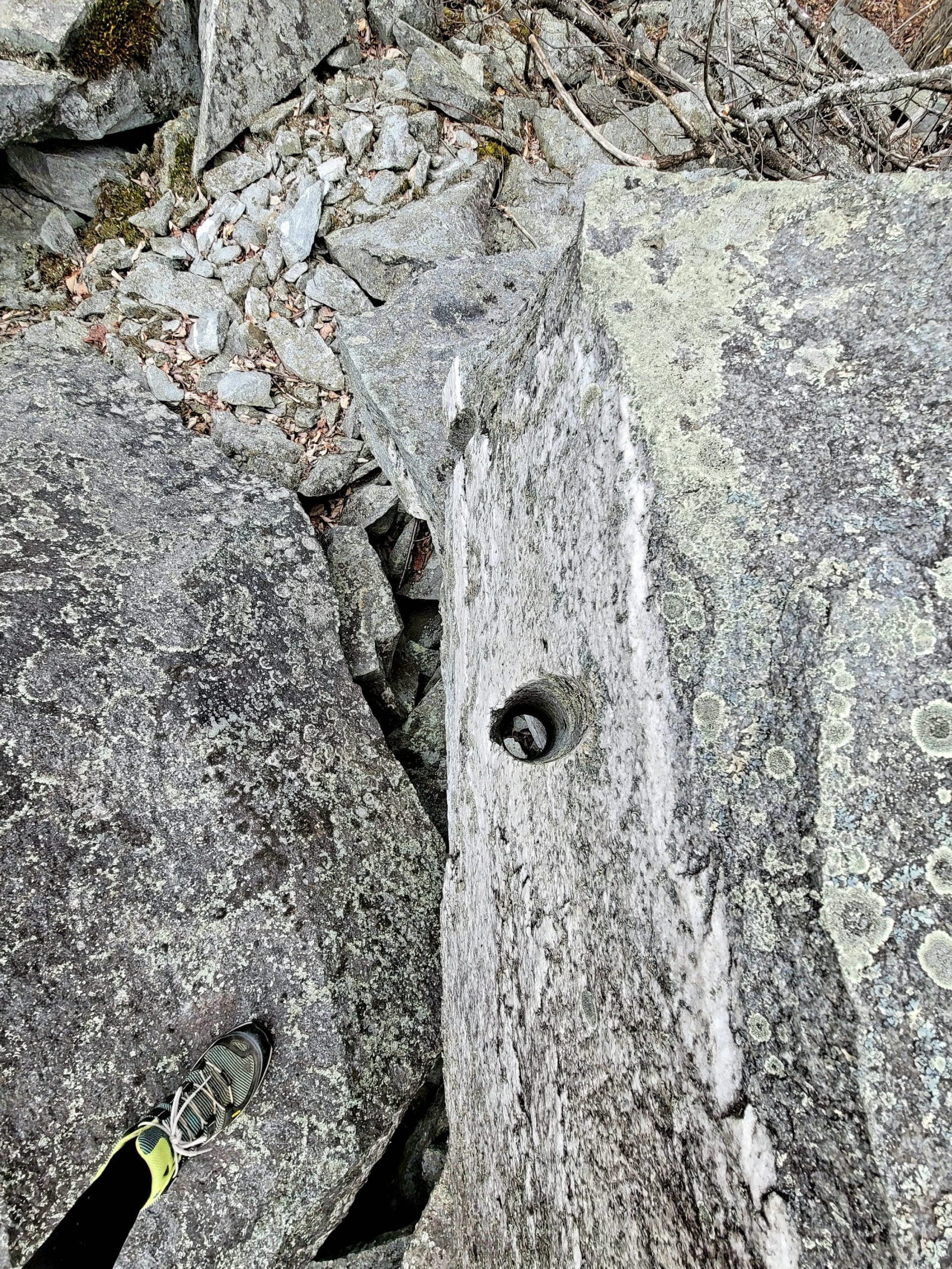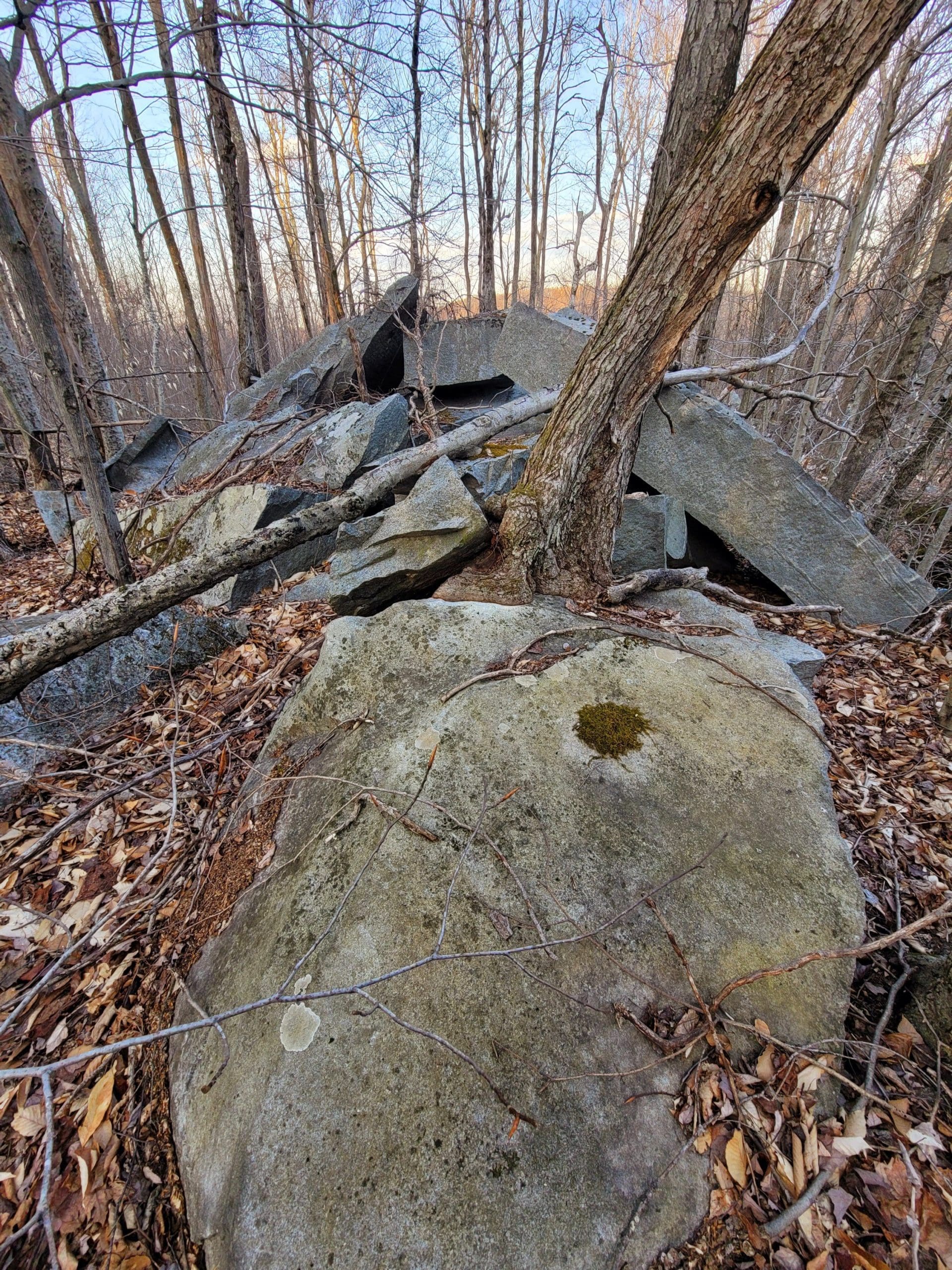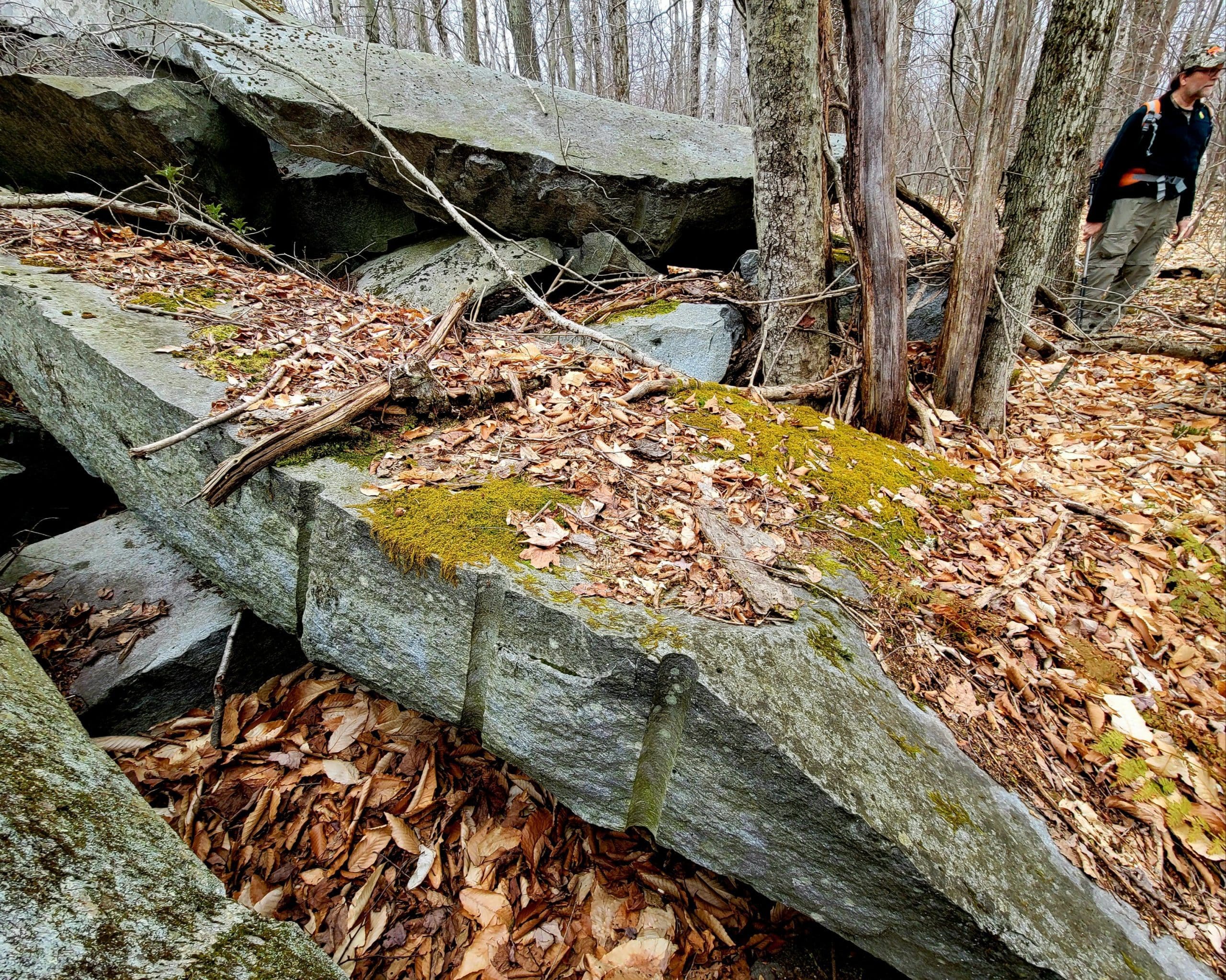 “No Name” quarry set on the granite fault somewhere between Chester Granite Co. and Lawry Quarry, one of five here spanning Becket and Otis hugging the town line. Thank you to Ed Williams’ tips to find this one up on a hill very close to the turnpike. Not much left here but chain and cable however it holds extremely large blocks and beautiful cuts in the quarry walls. Karen and I searched till dark using lidar mapping, as the deer crossed our path, there it was over the ridge! Trip two, Saturday flash hike to get an in depth look around the circumference and climbing the immense grout pile/tailings pile. This could be a smaller operation as a part of the flint quarry, hauling stone would be via Huckleberry Trolley Line just down the momountain