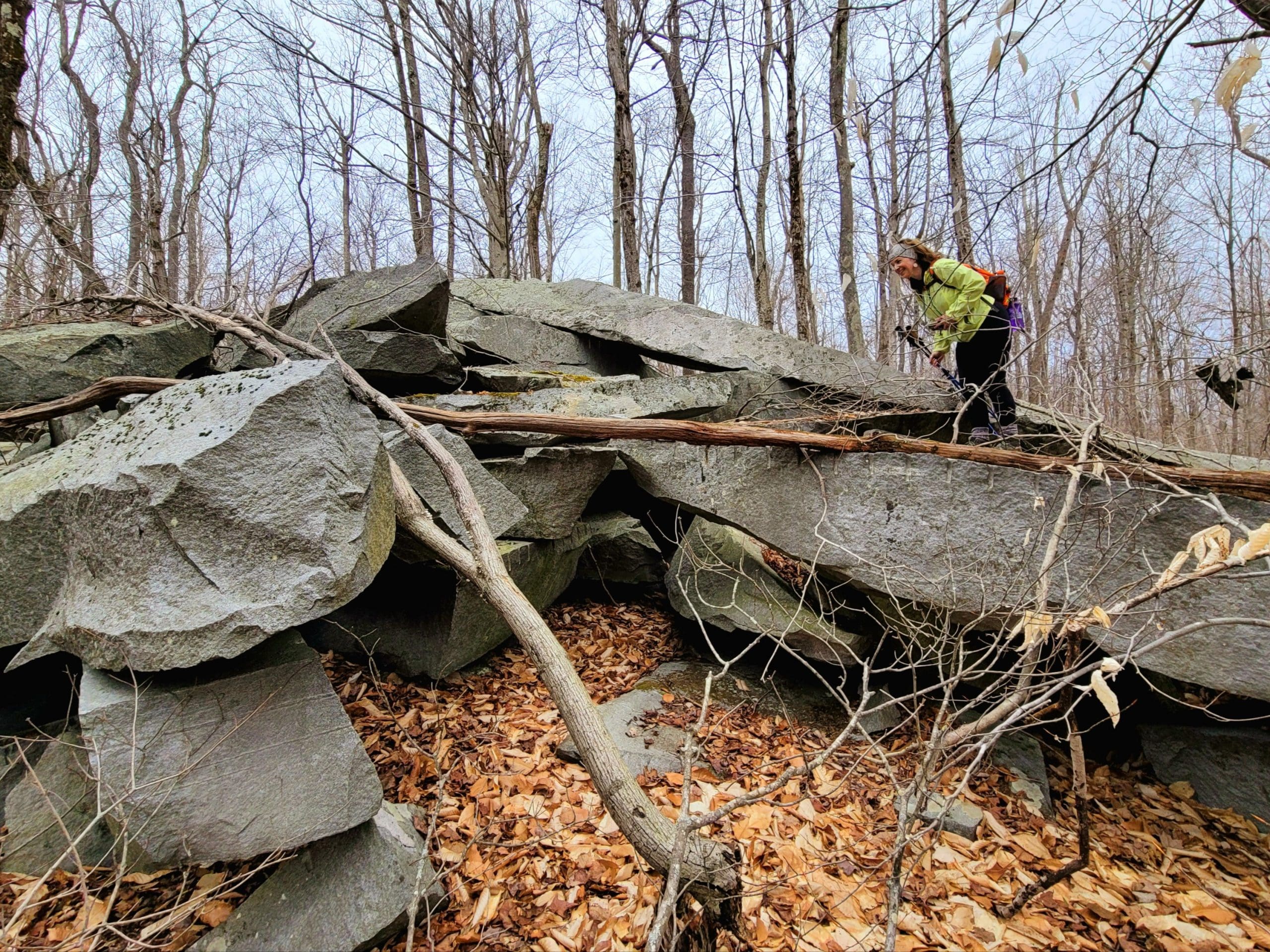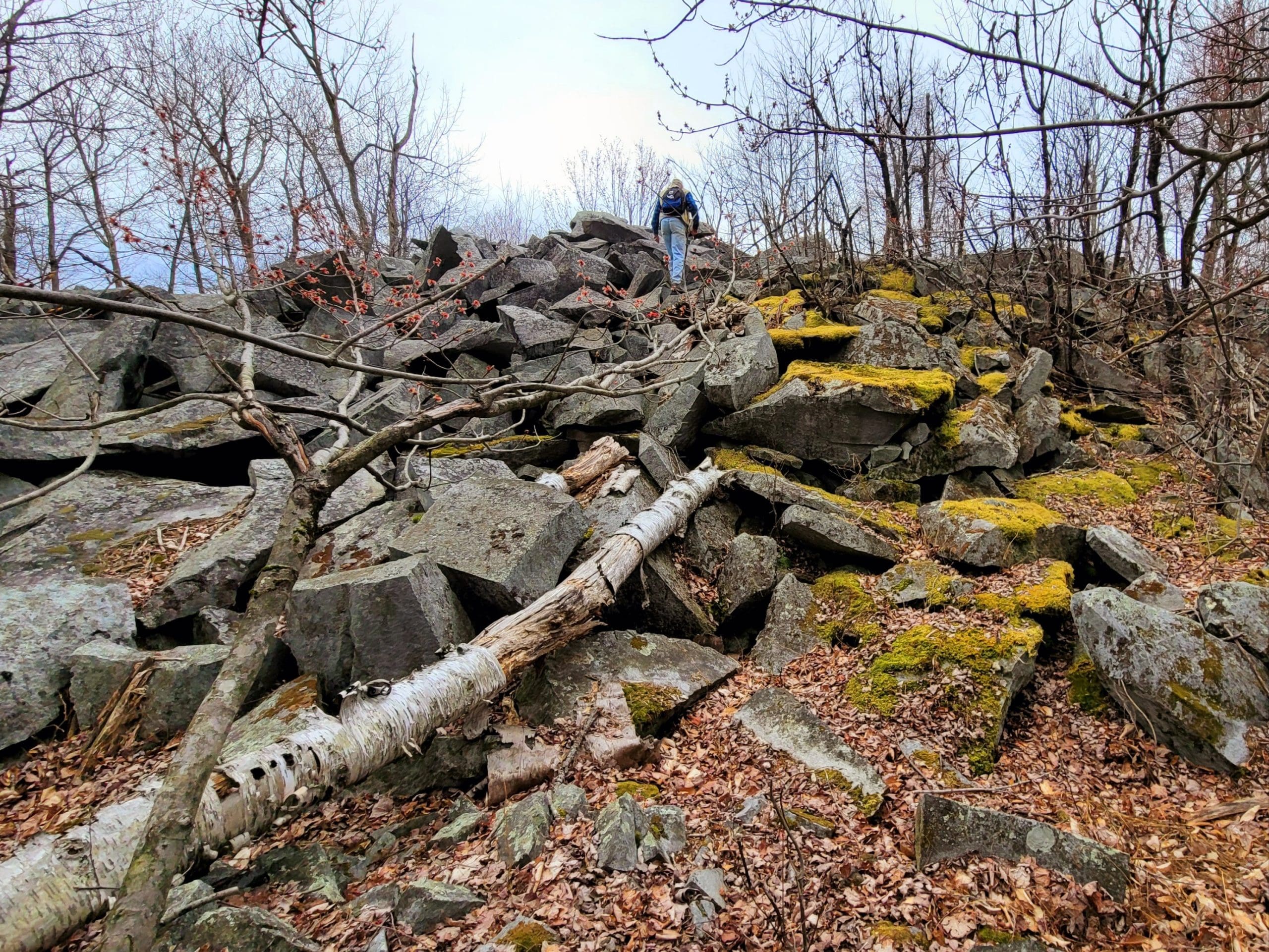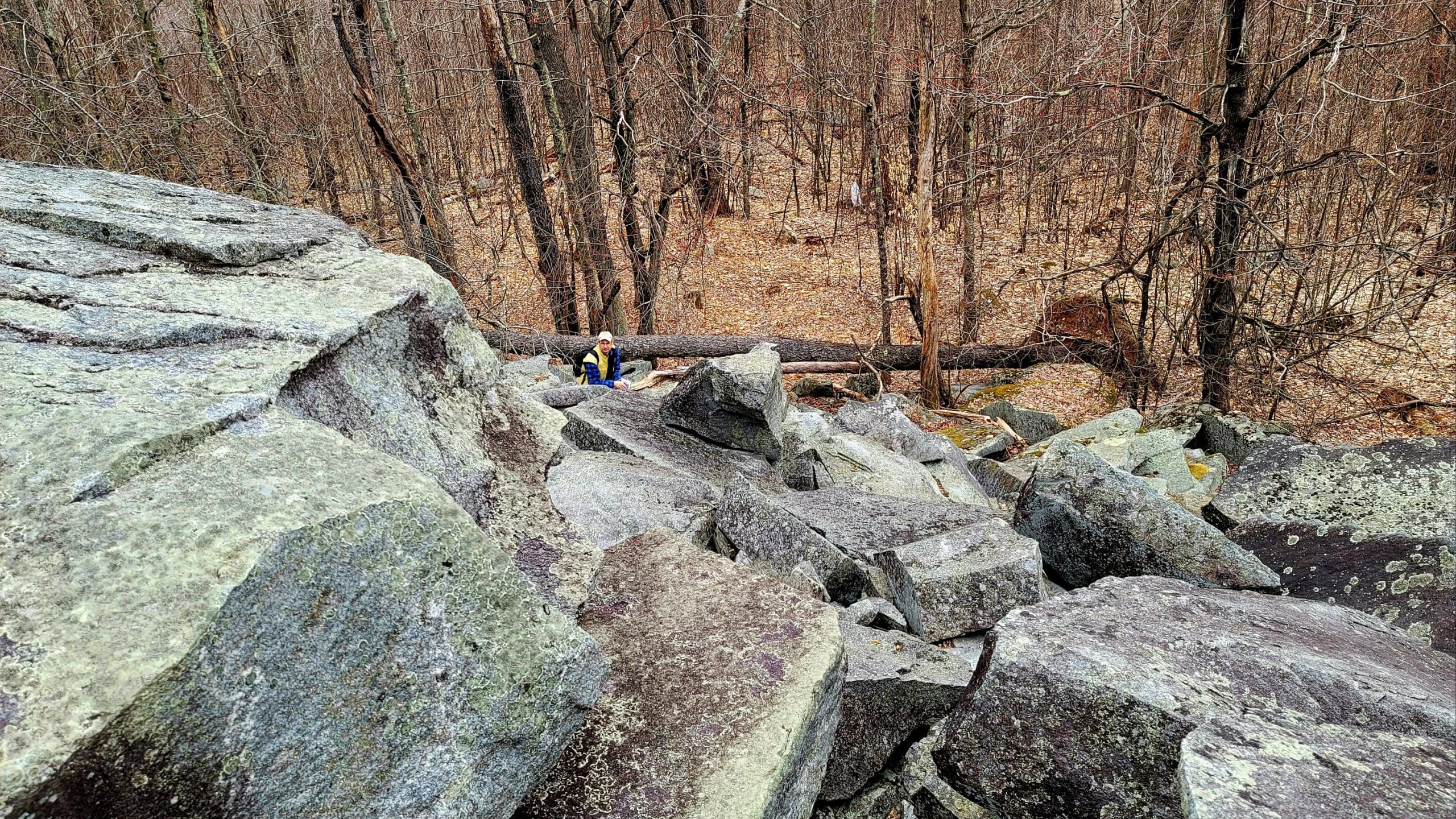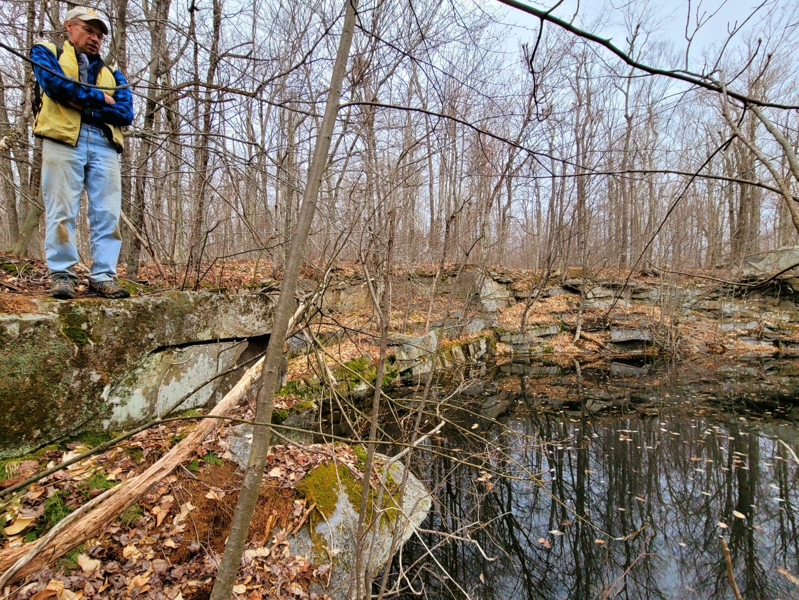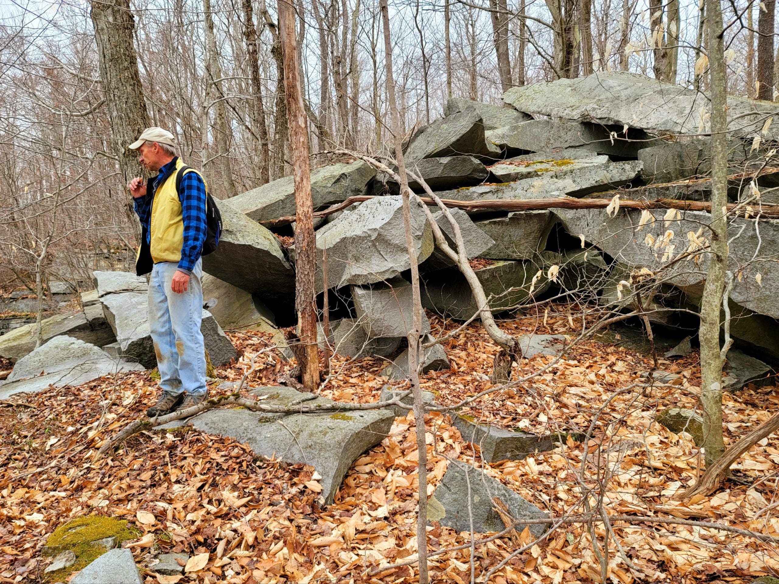 “No Name” quarry set on the granite fault somewhere between Chester Granite Co. and Lawry Quarry, one of five here spanning Becket and Otis hugging the town line. Thank you to Ed Williams’ tips to find this one up on a hill very close to the turnpike. Not much left here but chain and cable however it holds extremely large blocks and beautiful cuts in the quarry walls. Karen and I searched till dark using lidar mapping, as the deer crossed our path, there it was over the ridge! Trip two, Saturday flash hike to get an in depth look around the circumference and climbing the immense grout pile/tailings pile. This could be a smaller operation as a part of the flint quarry, hauling stone would be via Huckleberry Trolley Line just down the momountain