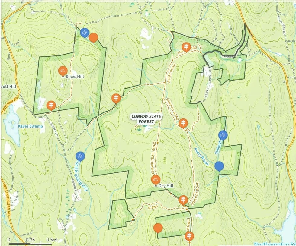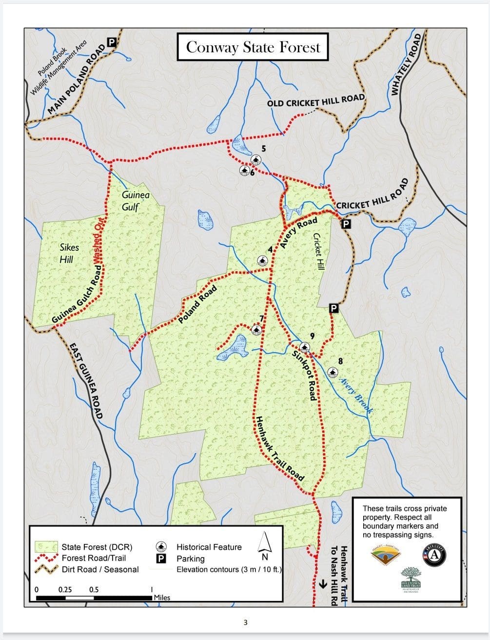 Flash Hike Saturday at Conway State Forest. Paulette showed us the trails here, grab the guide from www.townofconway.com to visit the landmarks. Trails are not blazed, these are the old roads where the town center once stood. Also, no cell service so download and print your maps! Easy hiking on rolling hills in a beautiful forest with some old growth trees. Conway State Forest is a woodland DCR State Forest.