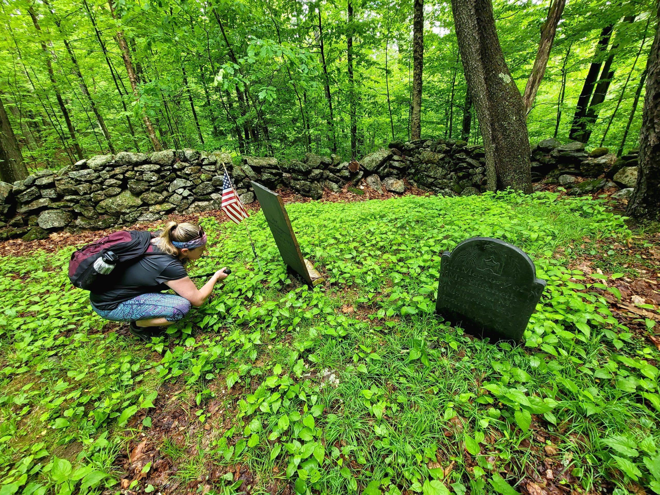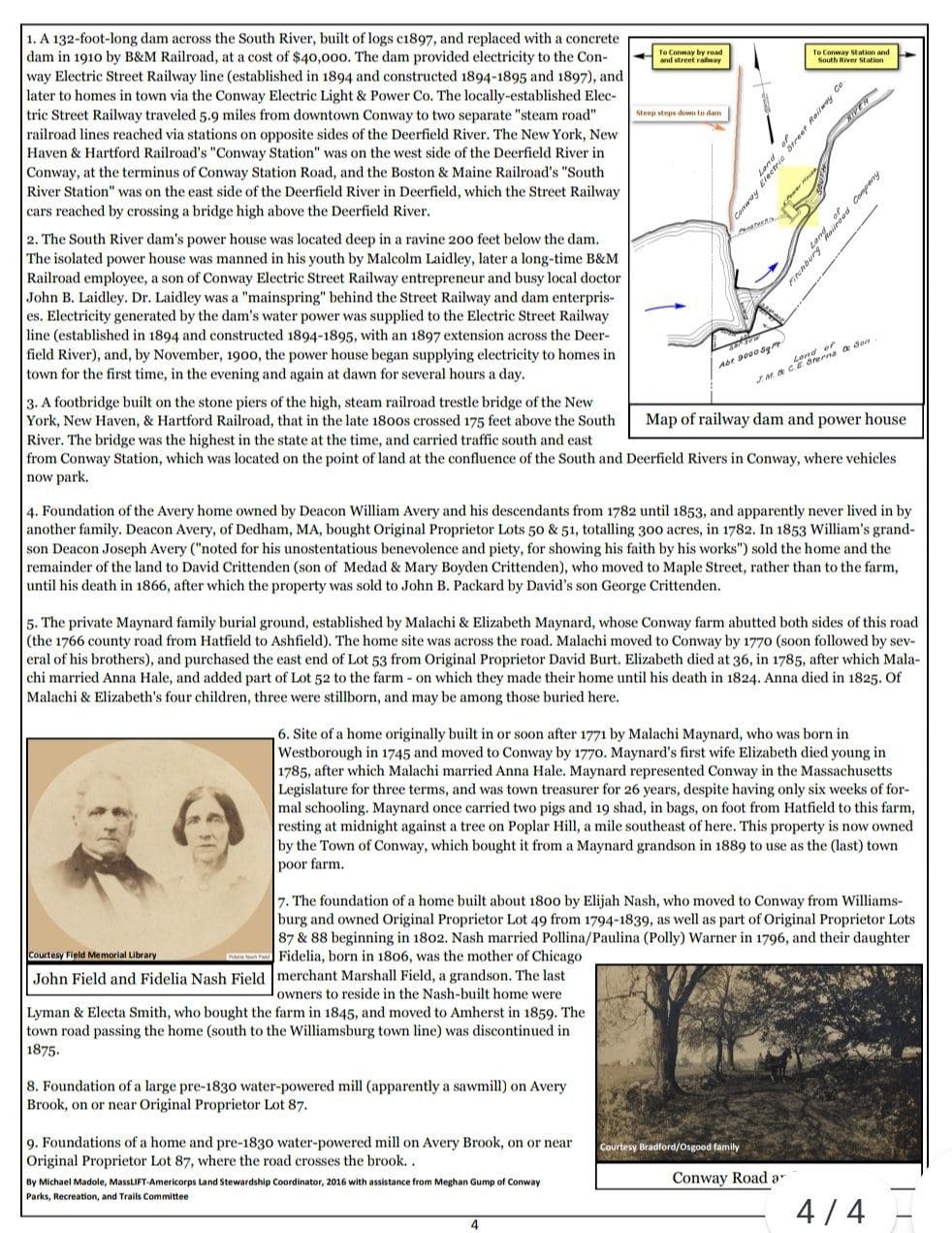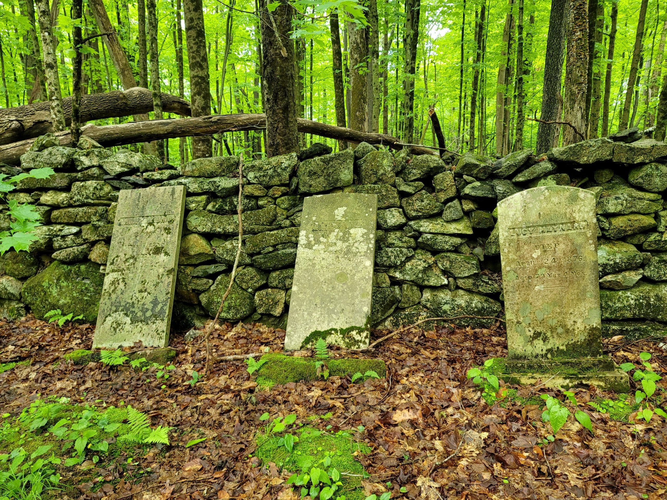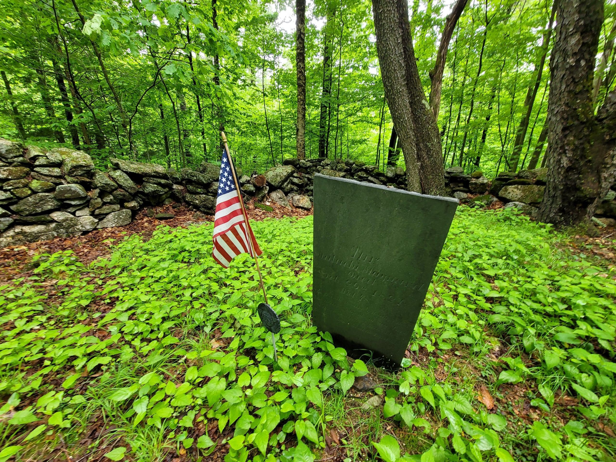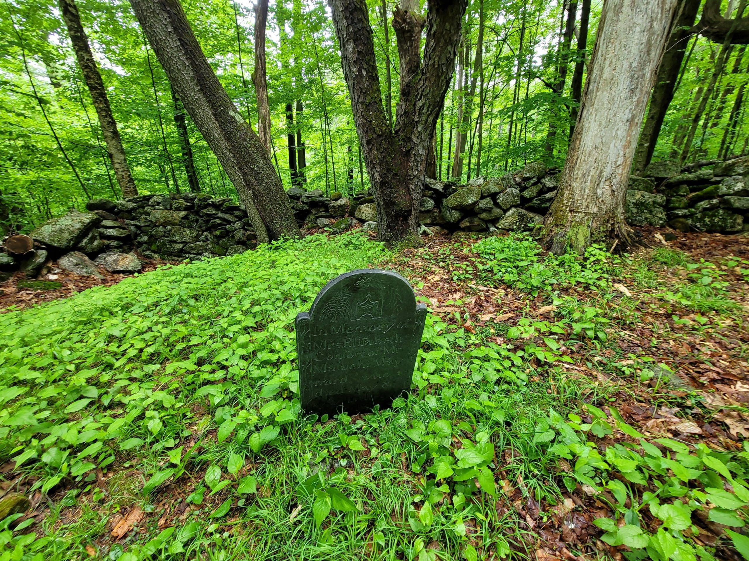 The private Maynard family burial ground, established by Malachi & Elizabeth Maynard, whose Conway farm abutted both sides of this road (the 1766 county road from Hatfield to Ashfield). The home site was across the road. Malachi moved to Conway by 1770 (soon followed by several of his brothers), and purchased the east end of Lot 53 from Original Proprietor David Burt. Elizabeth died at 36, in 1785, after which Malachi married Anna Hale, and added part of Lot 52 to the farm – on which they made their home until his death in 1824. Anna died in 1825. Of Malachi & Elizabeth’s four children, three were stillborn, and may be among those buried here.