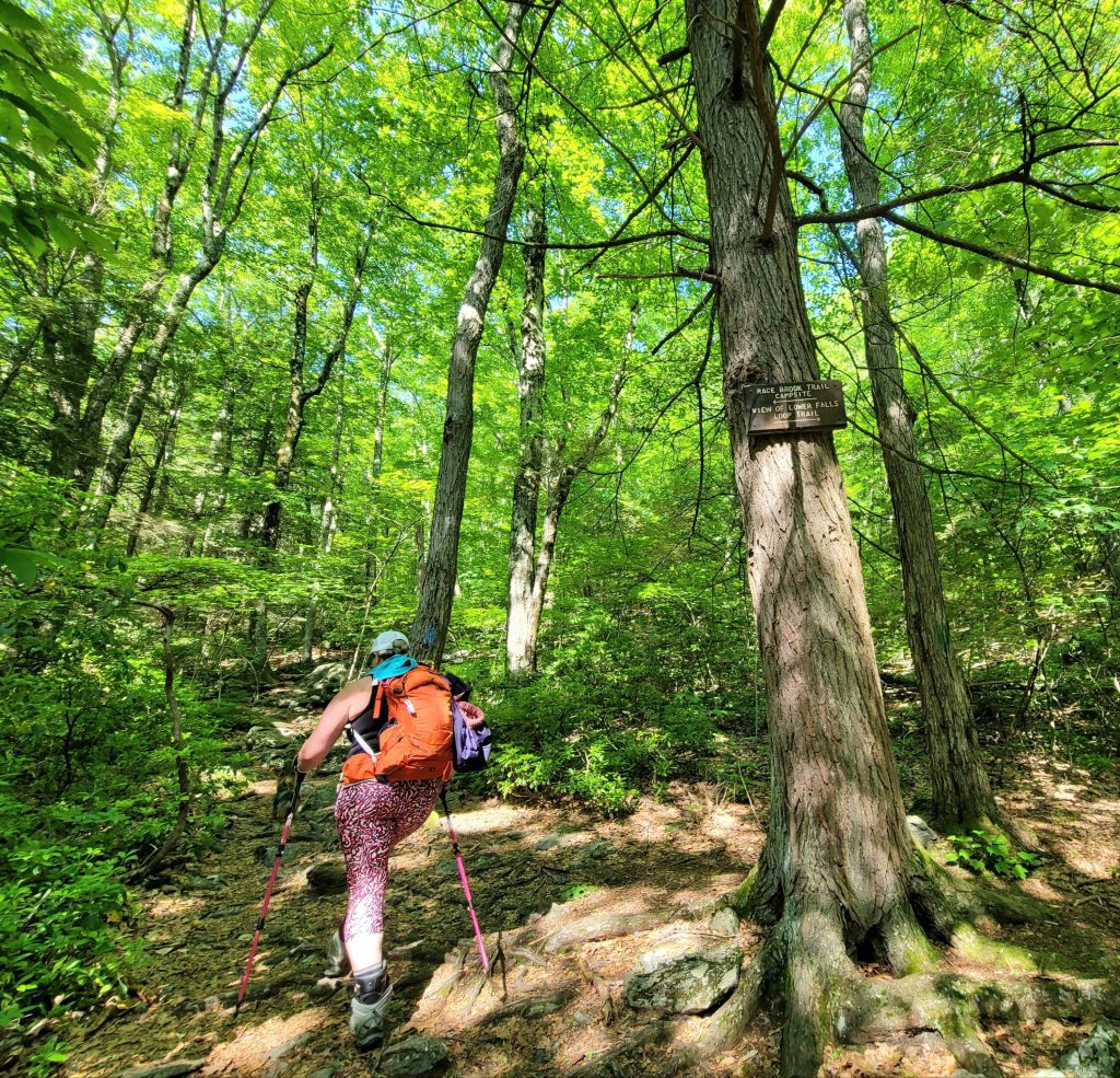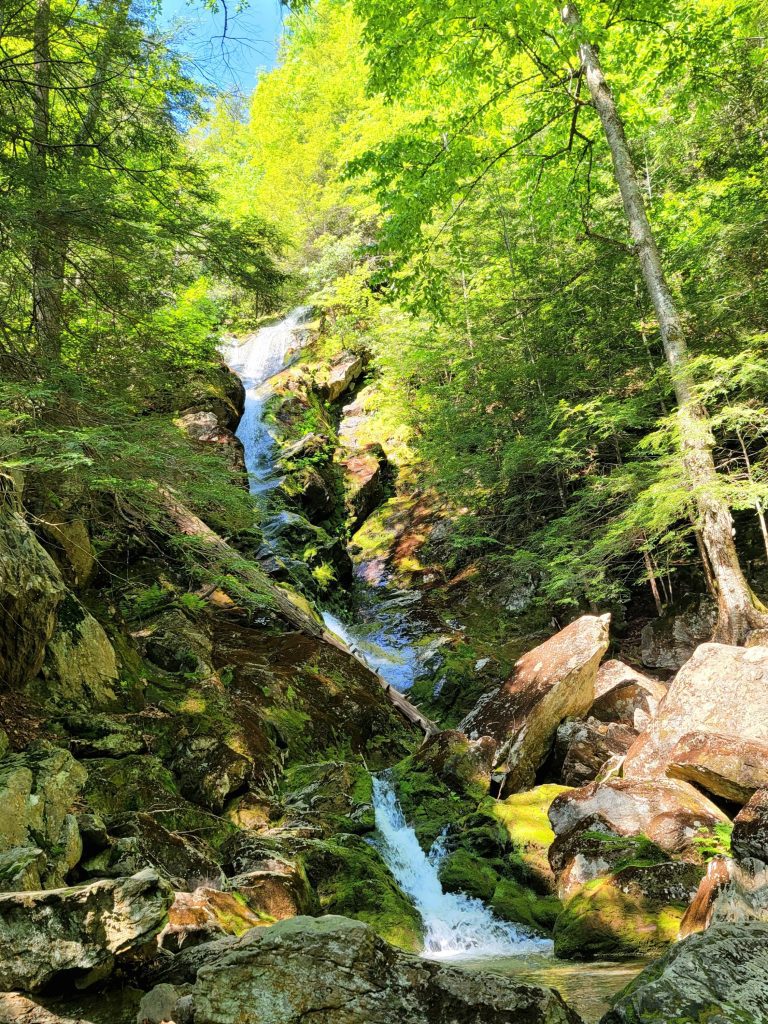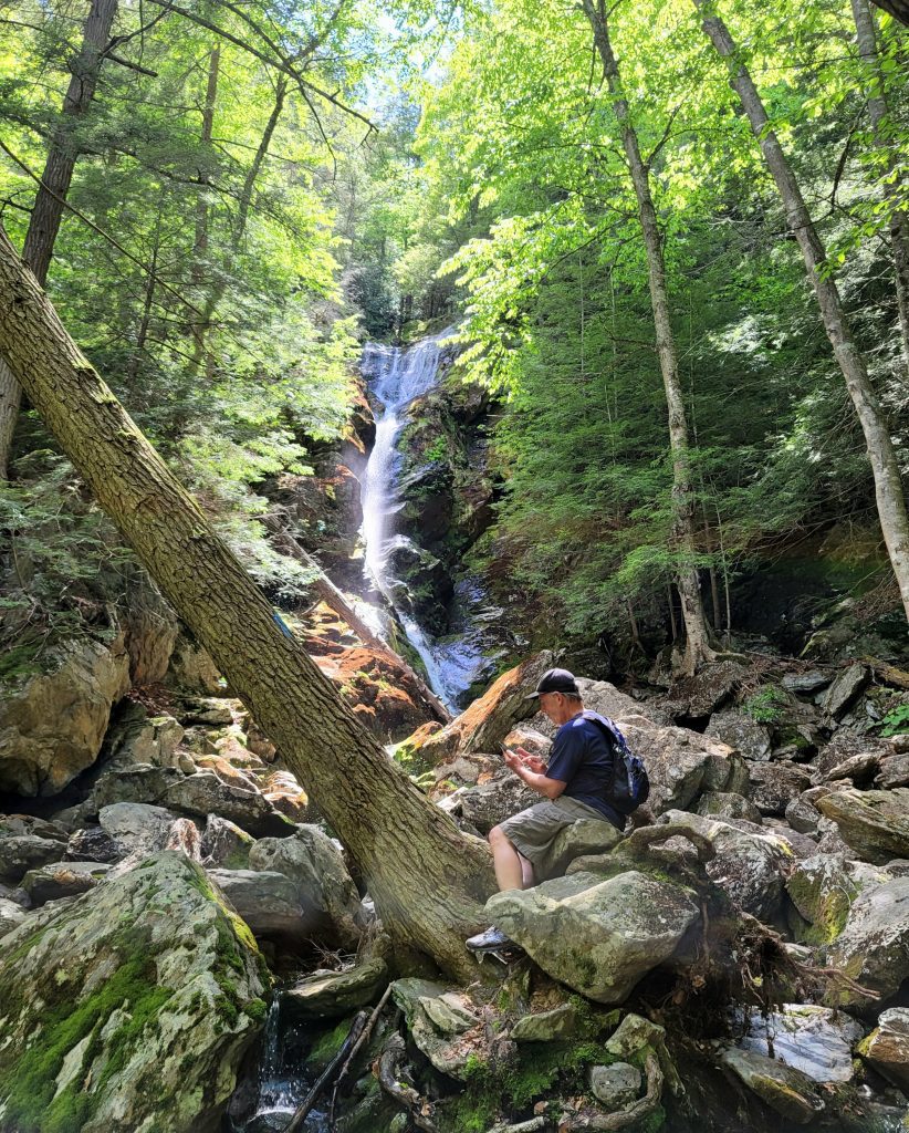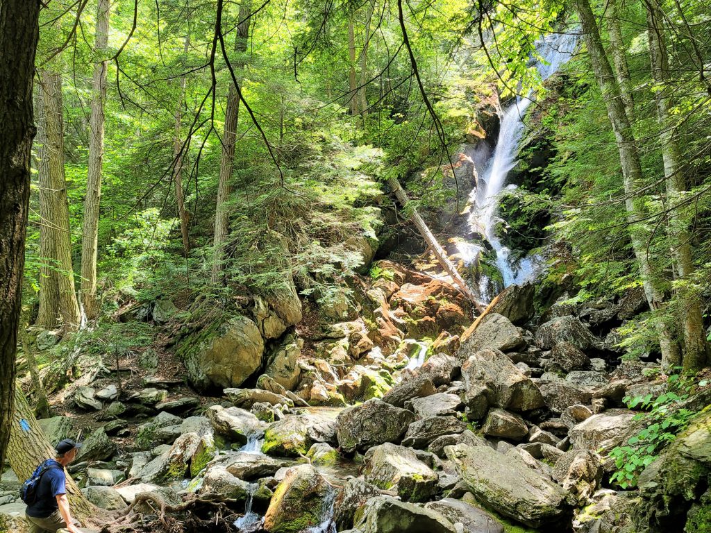 Race Brook Falls in Sheffield Flash Hike Saturday. The falls were named after William Race, an early pioneer who lived in the valley in the mid-1700s. Race was involved in a rent dispute and was killed by a party of debt-collectors sent by land baron Robert Livingston. Formed on Race Brook, a small stream between Mt. Race and Mt. Everett. The waterfalls consist of a series of five cascades, with the first (the lowermost) being the largest and most spectacular at nearly 100 feet high. The second fall, which is 30 feet high and fairly inclined, can be seen just upstream from the top of the first fall. Farther up is the third fall, which is actually a series of smaller cascades totaling well over 30 feet in height. The fourth fall is absolutely gorgeous, with water cascading 60 feet down onto boulders that are brown and covered with algae and green moss. The fifth fall, like the third cascade, consists of a series of smaller cascades, totaling 30 feet or more. You can choose to hike just the lower Falls trail .5 miles or go for all 5 with a difficult one mile climb all the way up on rocks and roots on the edges of drops, at the 5th fall on top there is a great vista! Give yourself 4 hours for the entire falls including all the vistas, take it slow and you will accomplish it! Take it up a notch and go 2.1 miles to the campsite and then another mile up to the Appalachian Trail, take a left South and head to Mount Race with rock scrambles, go another 800 feet from the big cairn at Mount Race to the grand overlook atop the cliffs! Parking on Route 41 at the kiosk. #sheffieldma