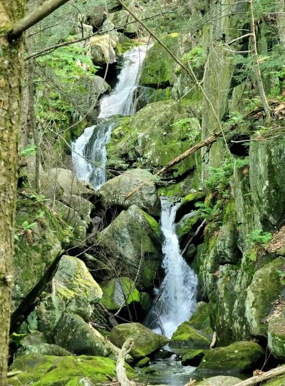 GPS Location: 42.24782, -72.92470 Parking Hike Rating: Moderate/Difficult 4 miles in and back This hike is ranked A+ for waterfalls. Stone steps on the side of the road take you into the woods in less than 3 minutes. The initial hike up the falls is very steep with a sharp drop off to the water. Even though the waterfall is just off the state highway, you feel a world away from it! Impressive massive, moss covered boulders dominate the gorge. As you climb higher the trail goes to a gradual climb along a stone wall, there are many viewing spots along the way. Bring your good camera. We will hike to the washed-out bridge, hikers have the option to cross Goldmine Brook and continue on the opposite side of the brook to the high end of the trail where it meets up with Mica Mine Rd. and the Mine itself. This hike is beautiful from start to finish. Uphill all the way in.
