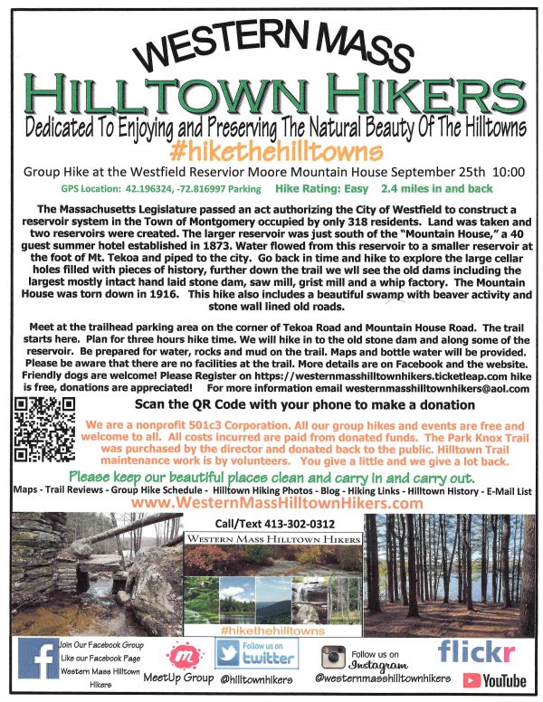 Meet at the trailhead parking area on the corner of Tekoa Road and Mountain House Road. The trail starts here. Plan for three hours hike time. We will hike in to the old stone dam and along some of the reservoir. Be prepared for water, rocks and mud on the trail. Maps and bottle water will be provided. Please be aware that there are no facilities at the trail. More details are on Facebook and www.westernmasshilltownhikers.com. Friendly dogs are welcome! Please Register on https://westernmasshilltownhikers.ticketleap.com hike is free, donations are appreciated! Donate Here: paypal.me/hilltownhikers or Venmo @hilltownhikers For more information email westernmasshilltownhikers@aol.com