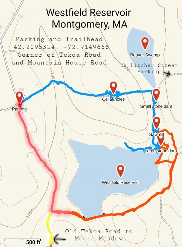 The Massachusetts Legislature passed an act authorizing the City of Westfield to construct a reservoir system in the Town of Montgomery occupied by only 318 residents. Land was taken and two reservoirs were created. The larger reservoir was just south of the *Mountain House,* a 40 guest summer hotel established in 1873. Water flowed from this reservoir to a smaller reservoir at the foot of Mt. Tekoa and piped to the city. Go back in time and hike to explore the large cellar holes filled with pieces of history, further down the trail we wll see the old dams including the largest mostly intact hand laid stone dam, saw mill, grist mill and a whip factory. The Mountain House was torn down in 1916. This hike also includes a beautiful swamp with beaver activity and stone wall lined old roads. Read more about our destination here Mountain House CJ story