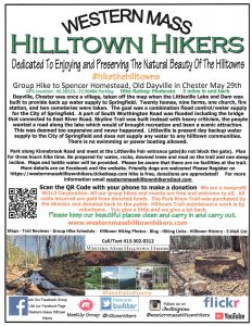 Park along Kinnebrook Road and meet at the Littleville Fair entrance gate(do not block the gate). Plan for three hours hike time. Be prepared for water, rocks, downed trees and mud on the trail and one steep incline. Trail is not blazed. There is NO cell service at the trail. We will hike as a group. Maps and bottle water will be provided. Please be aware that there are no facilities at the trail. More details are on Facebook and the website. Friendly dogs are welcome! Please Register on https://westernmasshilltownhikers.ticketleap.com hike is free, donations are appreciated! For more information email westernmasshilltownhikers@aol.com